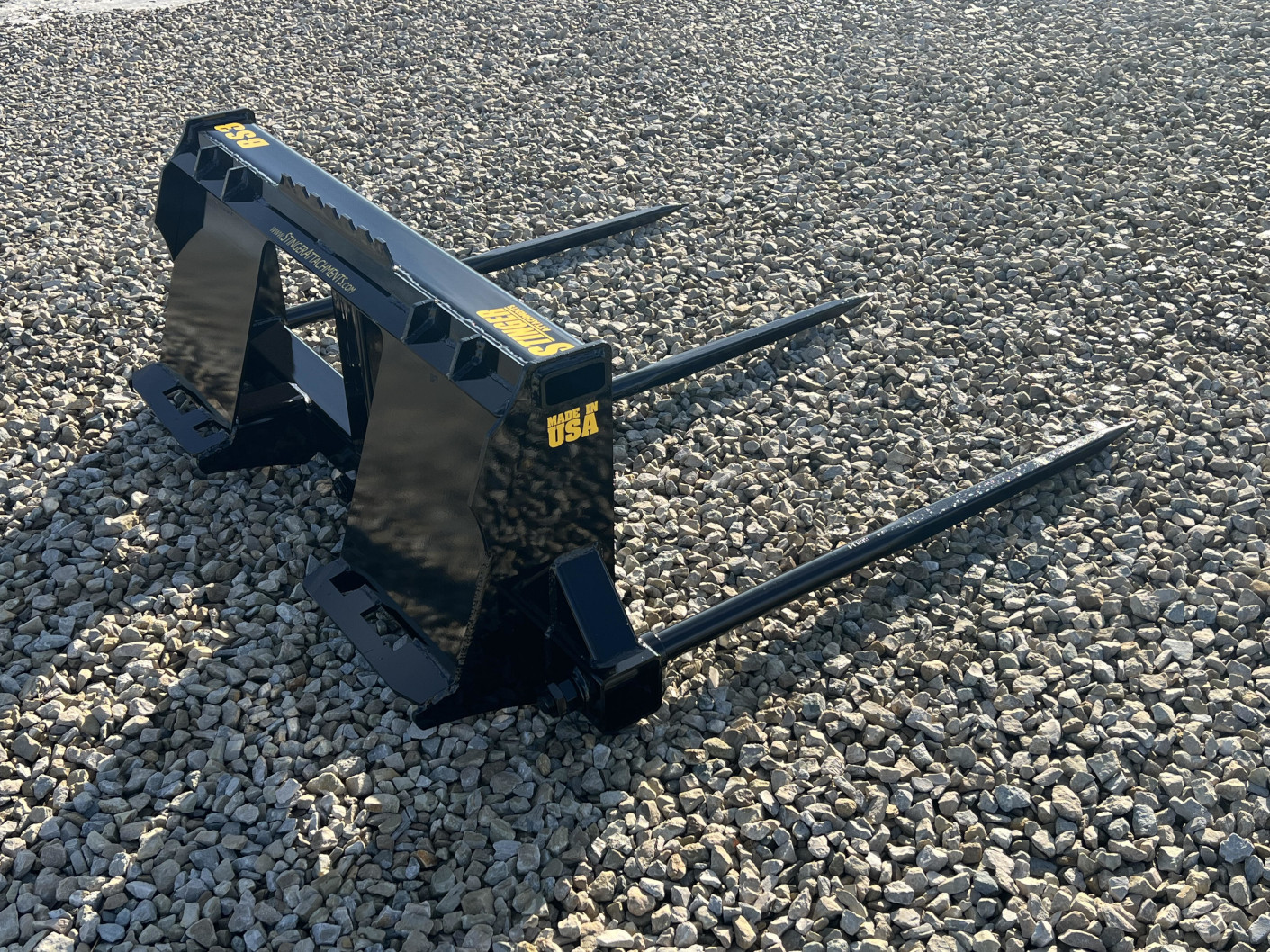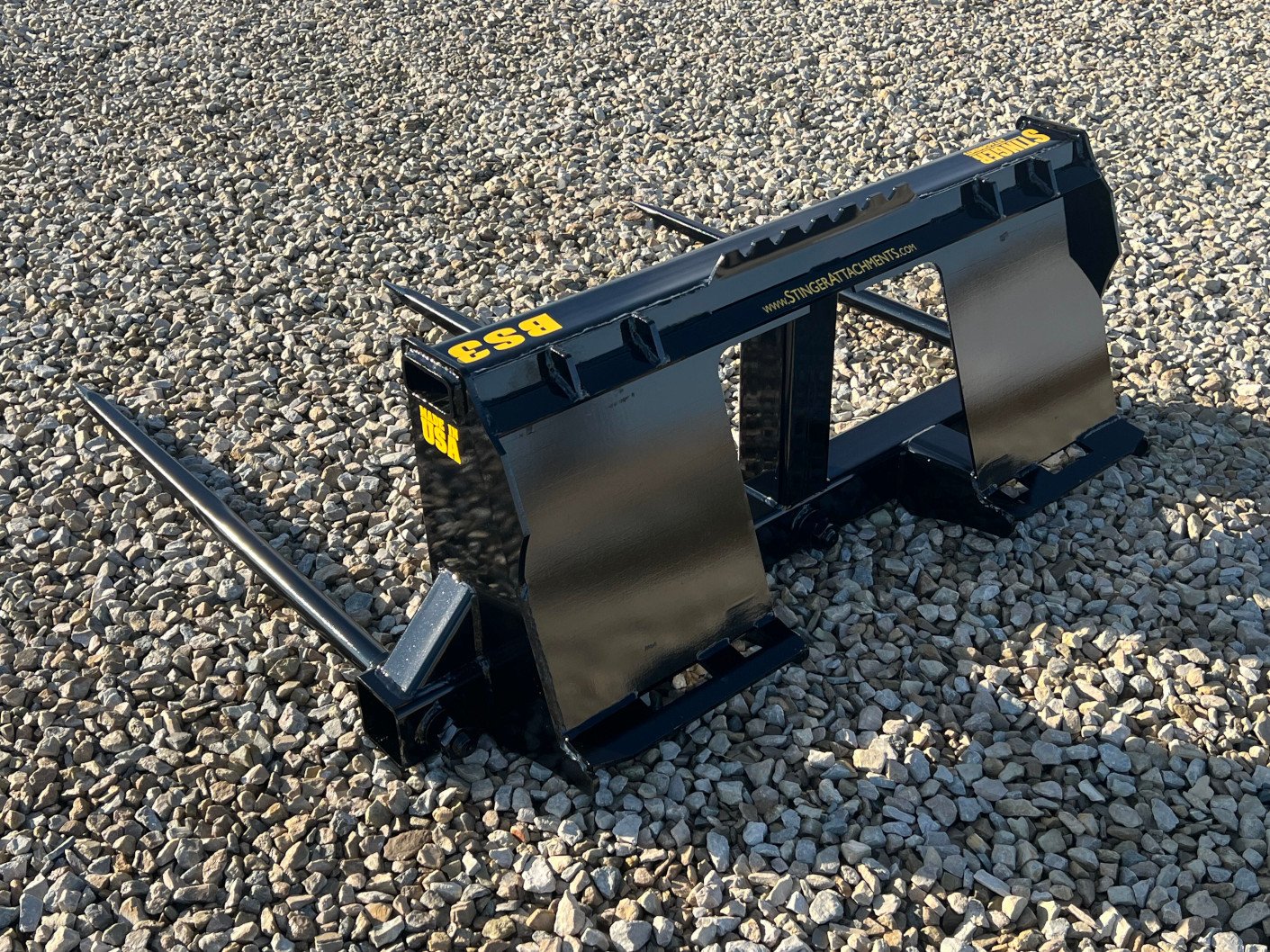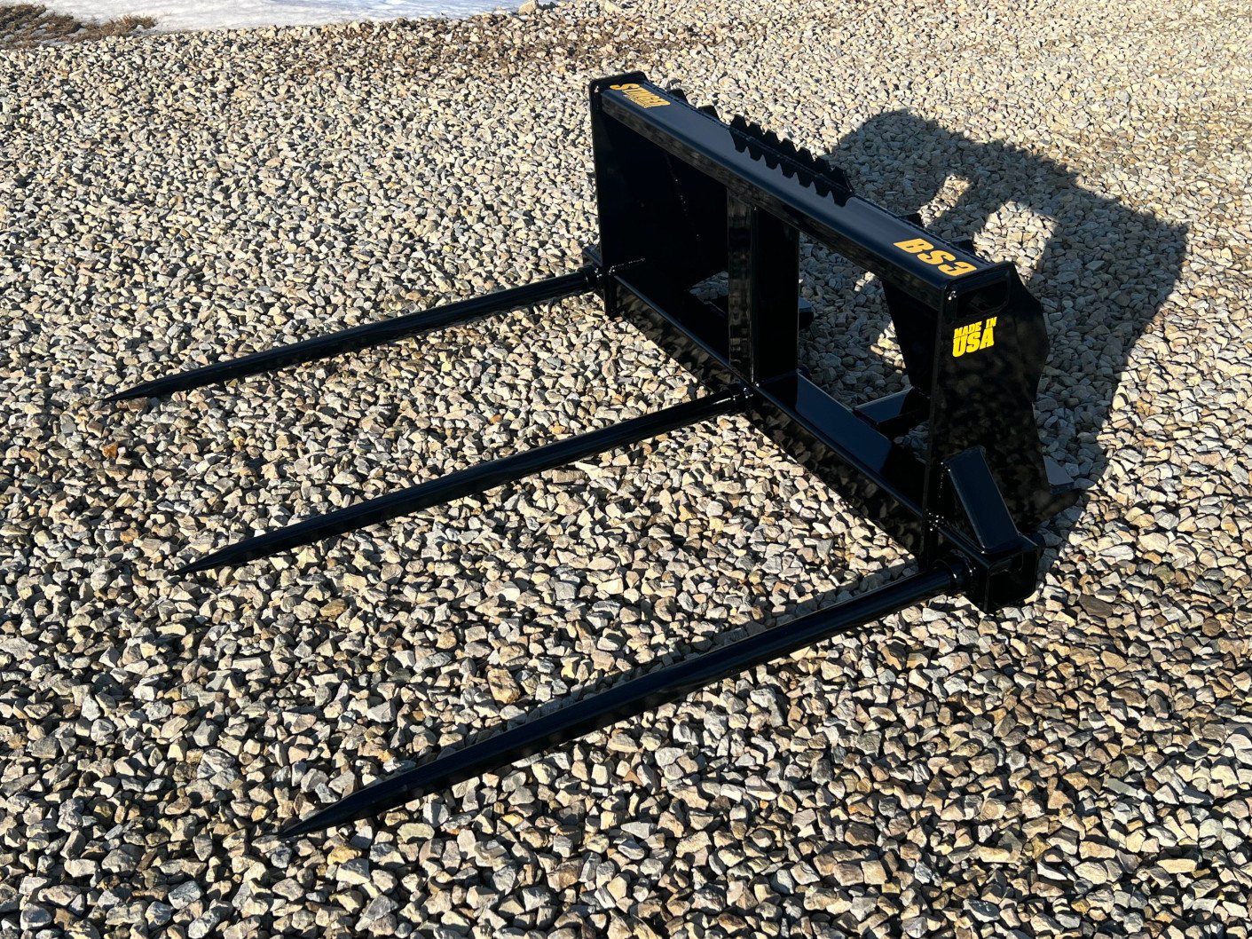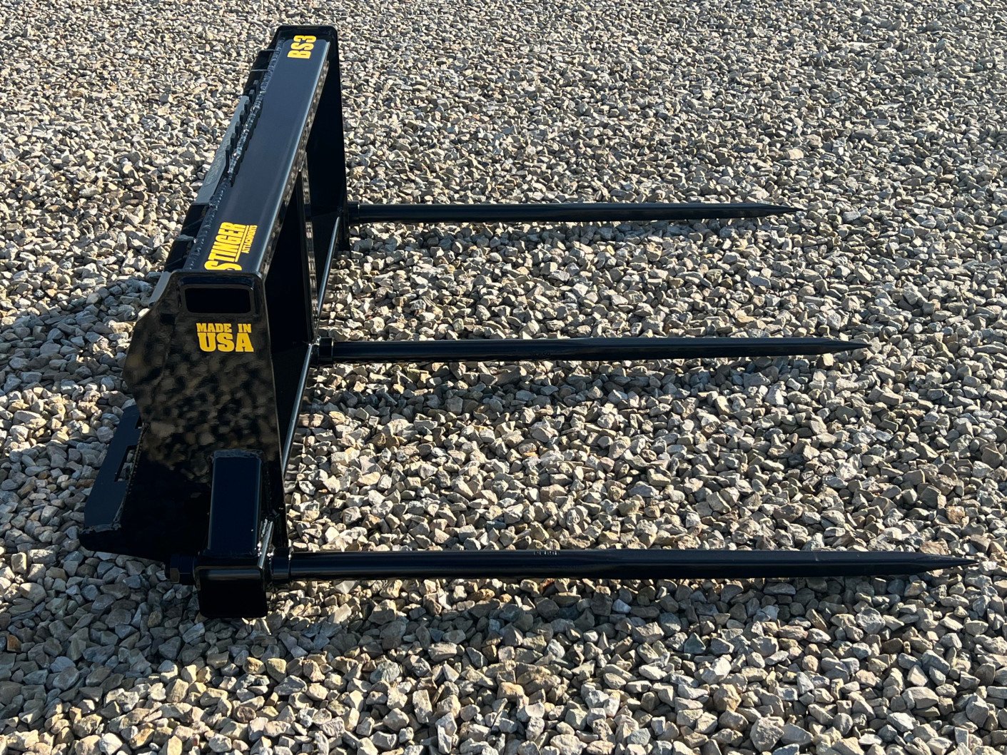 The Stinger Attachments Series 3 bale spear is a perfect piece of equipment for any farmer or large ranch wanting to move large square bales quickly. It is configured in a three tine design, the outer tines are spaces 52” apart on center with one dead center of attachment. The design is available with multiple tine lengths including 39”, 43”, or 49”. All of our bale attachments feature heavy duty design and come standard with replaceable tines.