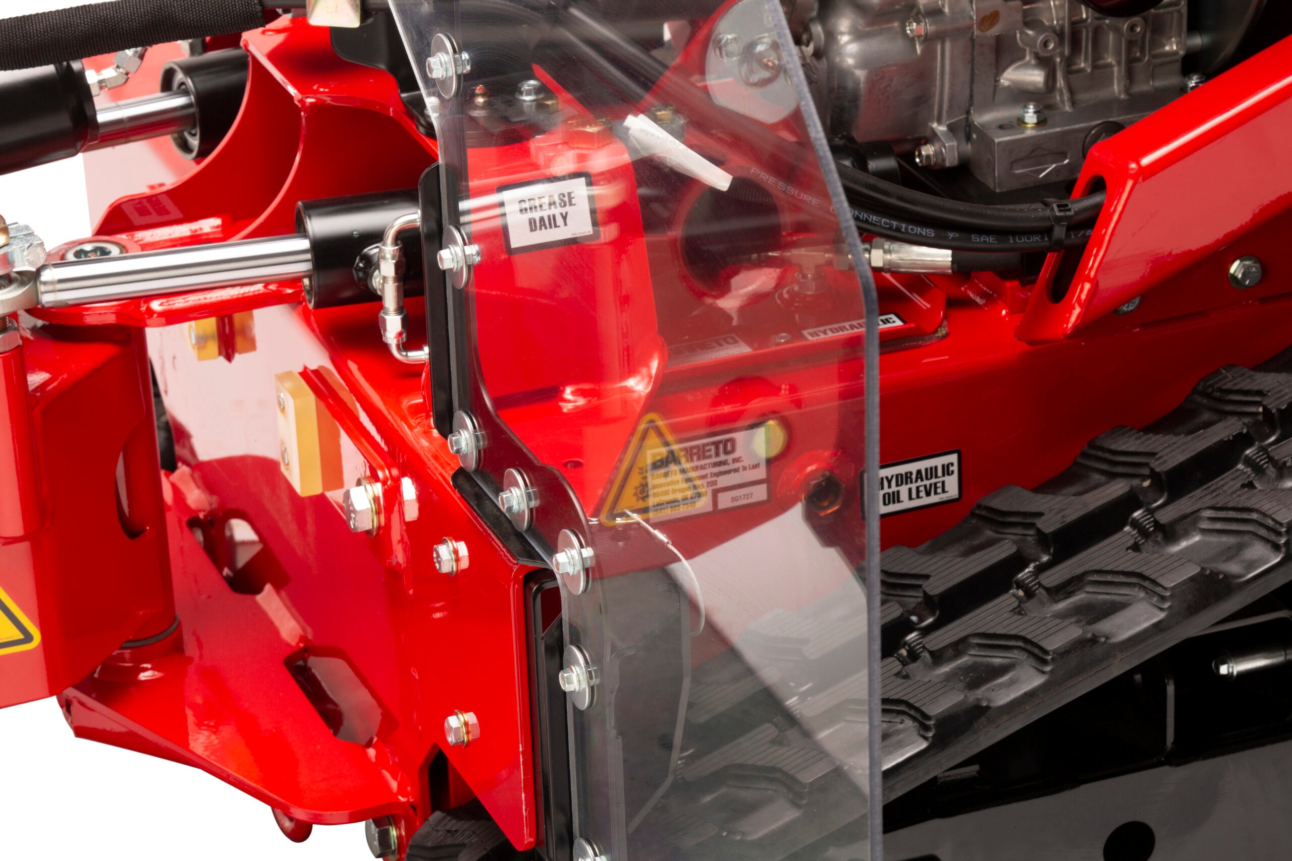 The 30SG stump grinder features a variant of the same time-tested track drive platform used by the RTK trencher series. The 30SG has a hydraulically-driven cutter wheel that is raised and lowered into the stump and then moved from side to side to cut down. The 30SG is powered by a 31hp Briggs & Stratton Vanguard V-Twin engine. The engine is coupled to two gear pumps: the larger gear pump drives the cutter wheel and the smaller pump works the tilt and swing cylinders. The tracks are driven by independent hydrostatic pumps mounted on the rear of the engine for easy access and simple linkage control. Counterbalance valves on each track drive prevent the track motors from slipping while the cutter wheel is engaged in the cutting process, even while operating on a slope.