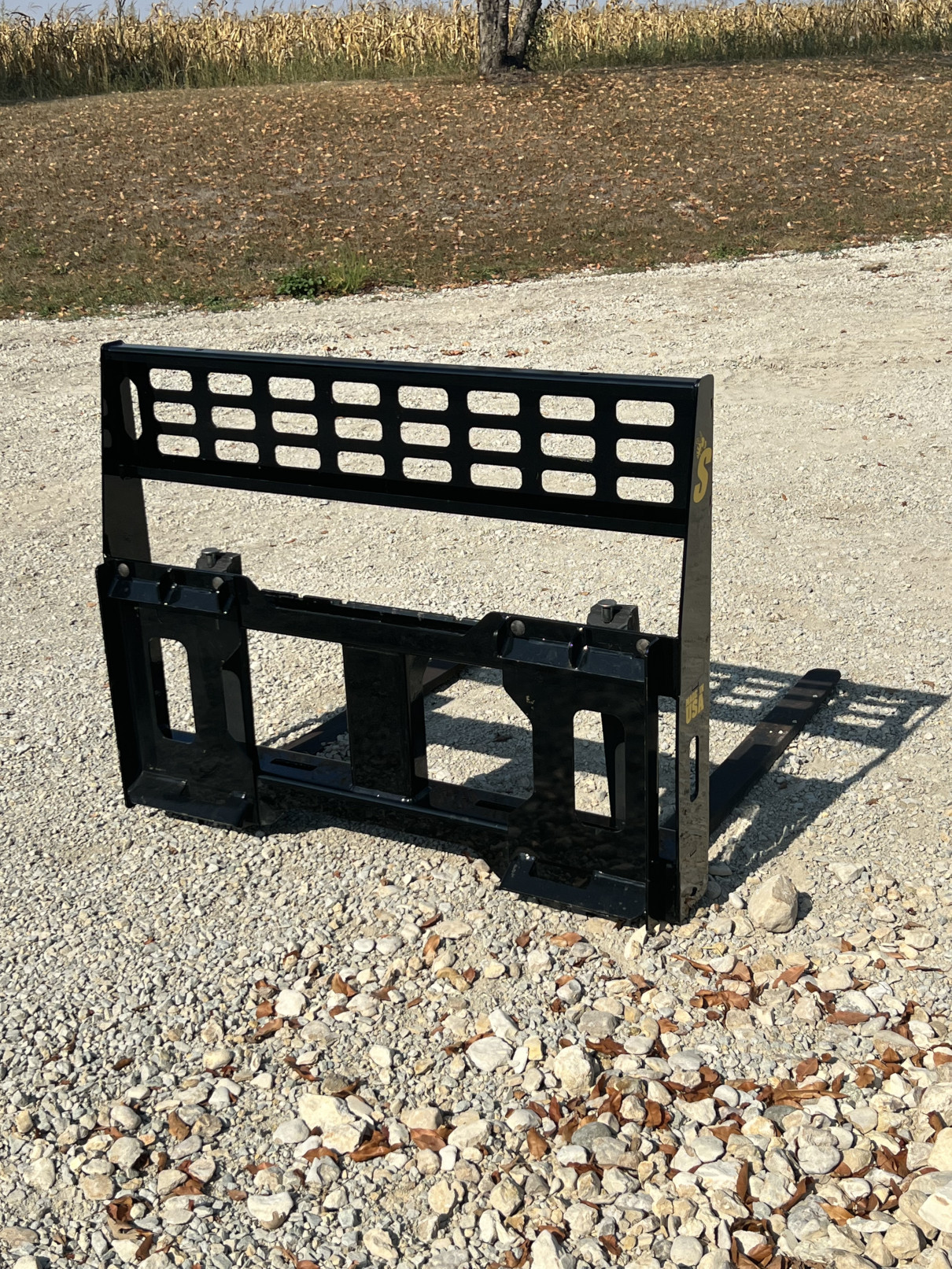 We currently offer the compact pallet fork with a Universal Quick-Attach or John Deere 100/400 Series mount system. It also features a bolt-on mount design for compatibility with multiple carriers. Order yours online, over the phone or through a local Stinger Attachments dealer today.