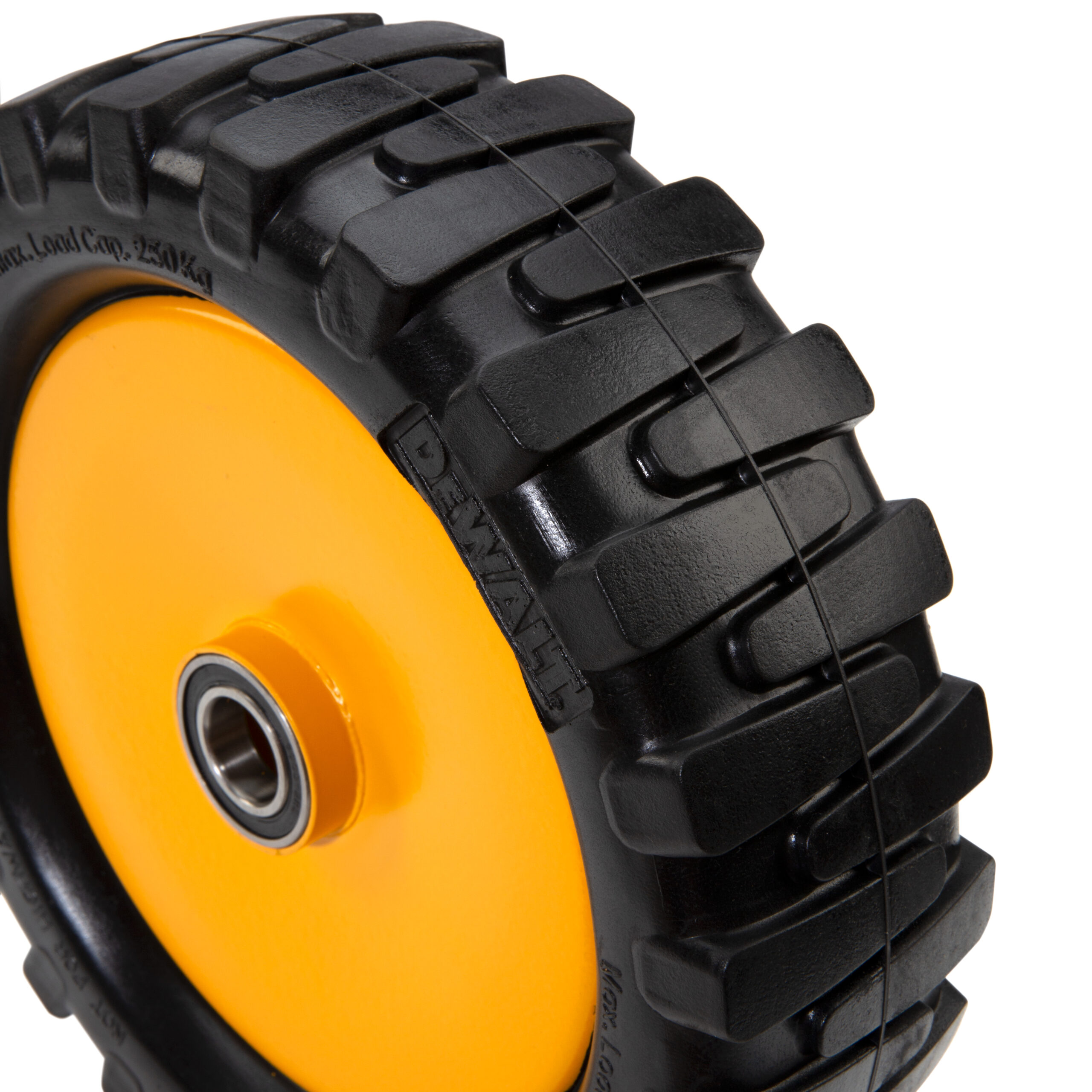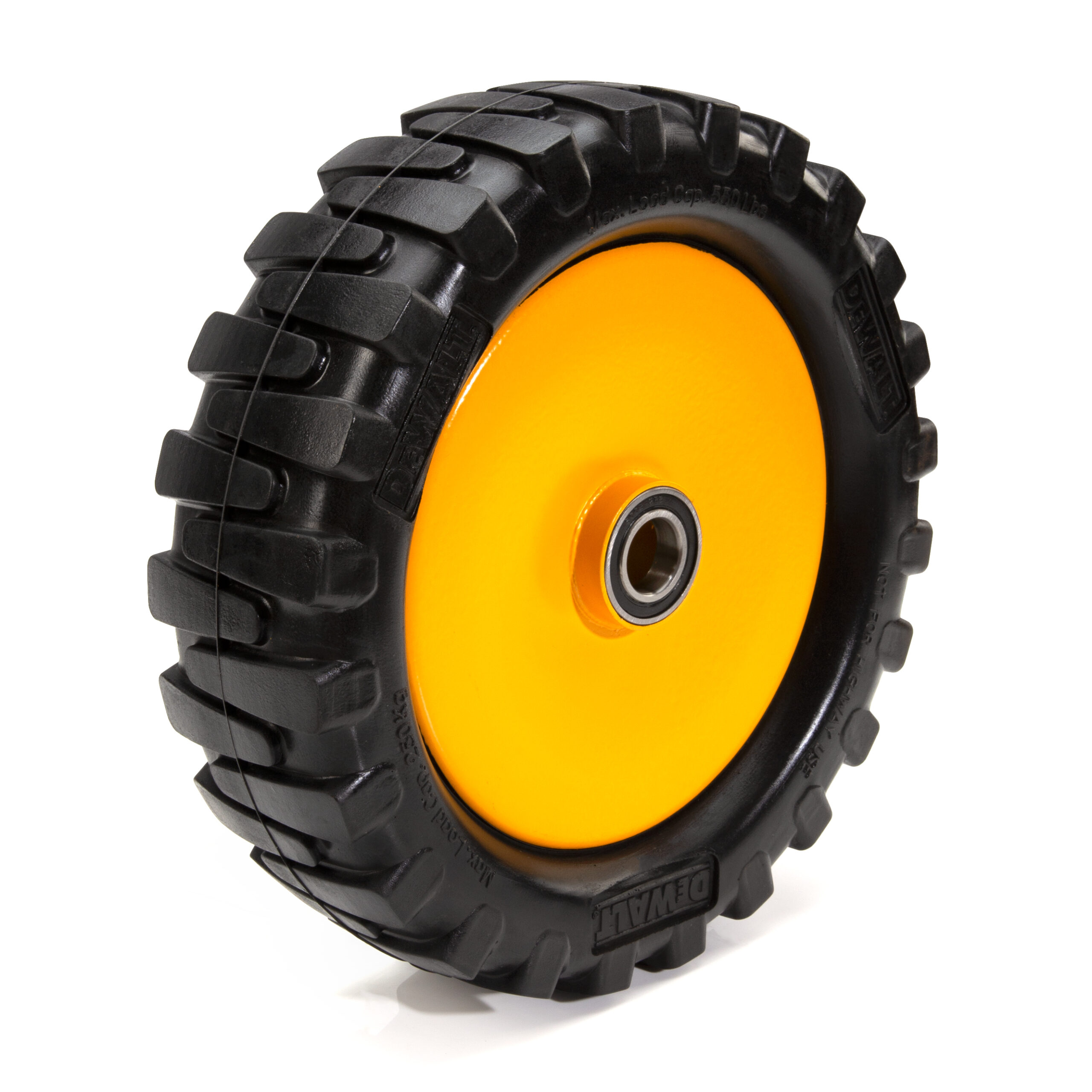 Construction work often requires moving heavy and bulky building materials to where they’re needed and quite often, those places don’t have convenient, smooth paths that lead to them that can wear out even the toughest wheels. Replace worn or damaged wheels and get back to moving those materials where you need them quickly and easily with a DEWALT DXWT-SW900 12-Inch Diameter Steel Core Flat-Free PU Replacement Wheel. This convenient wheel comes ready to mount with a solid polyurethane wheel cast around a steel core to provide flat-free convenience and maximum carrying capacity. The rugged design can support loads of up to 550-pounds without buckling, overloading the bearings, or compressing of the wheel so you can keep moving with ease. The 1-inch diameter axle opening fits easily onto DXWT-PS200, DXWT-PS201, and DXWT-PS202 Material and Panel Movers.