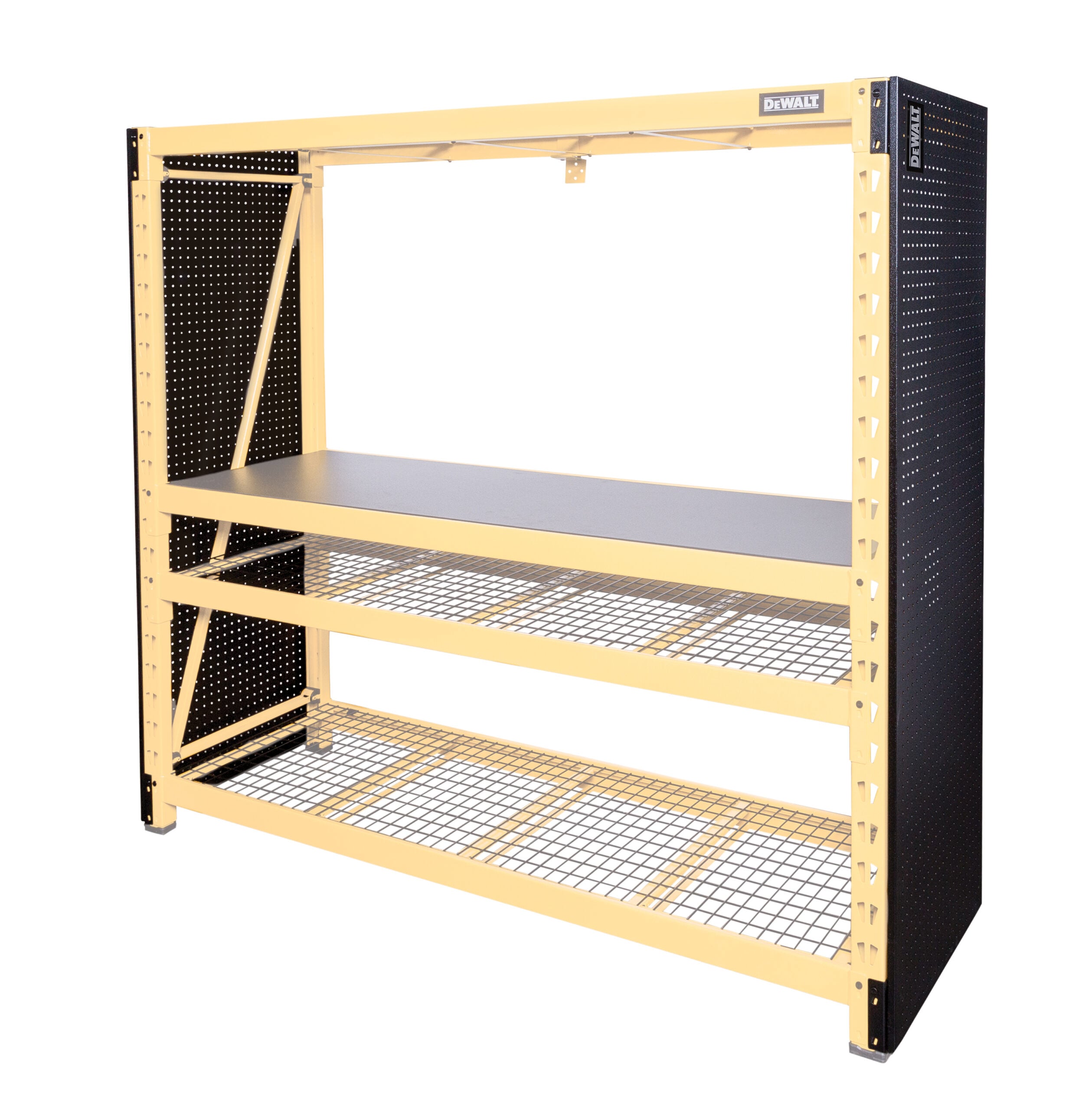 Expand the storage capacity of your existing DEWALT storage rack with the DXSTA10000PBK 2-Piece Pegboard Kit. Made to match the dimensions of the DXST10000 6-foot storage rack, it shares some of the same innovative features and adds a few of its own. Each 24-inch x 71-inch panel is made of durable steel which is then given an industrial grade black powder-coating that matches the appearance and texture of the existing laminate wood composite deck on the 6-foot storage rack. The pegboard kit contains two sets of mounting brackets to let you attach the panels to sides or back of the rack in one of several configurations. You can use them either with one panel mounted on each side, with both panels stacked vertically and attached to the back, or with one on a side and one on the back. To keep the panels in place once attached, they use the same locking pins as the racks to secure the mounts to the rack uprights and prevent them being knocked loose by accidental impacts. The panels feature standard 1-inch on center hole spacing with 1/4-inch diameter holes to fit most pegboard accessories. Thanks to their steel construction the panels let you use a variety of magnetic storage accessories as well, accessories that won’t work with regular wood and resin composite pegboards.
