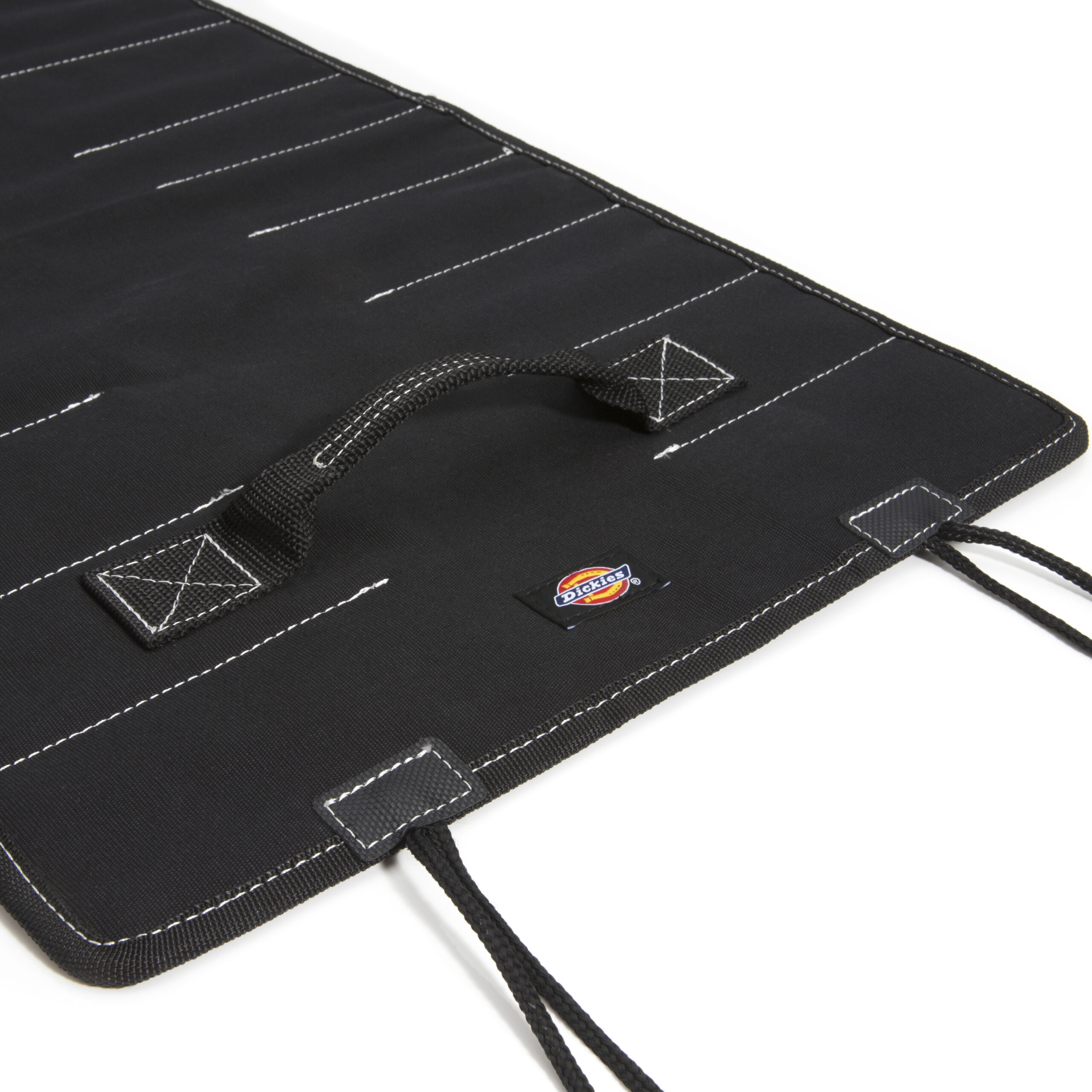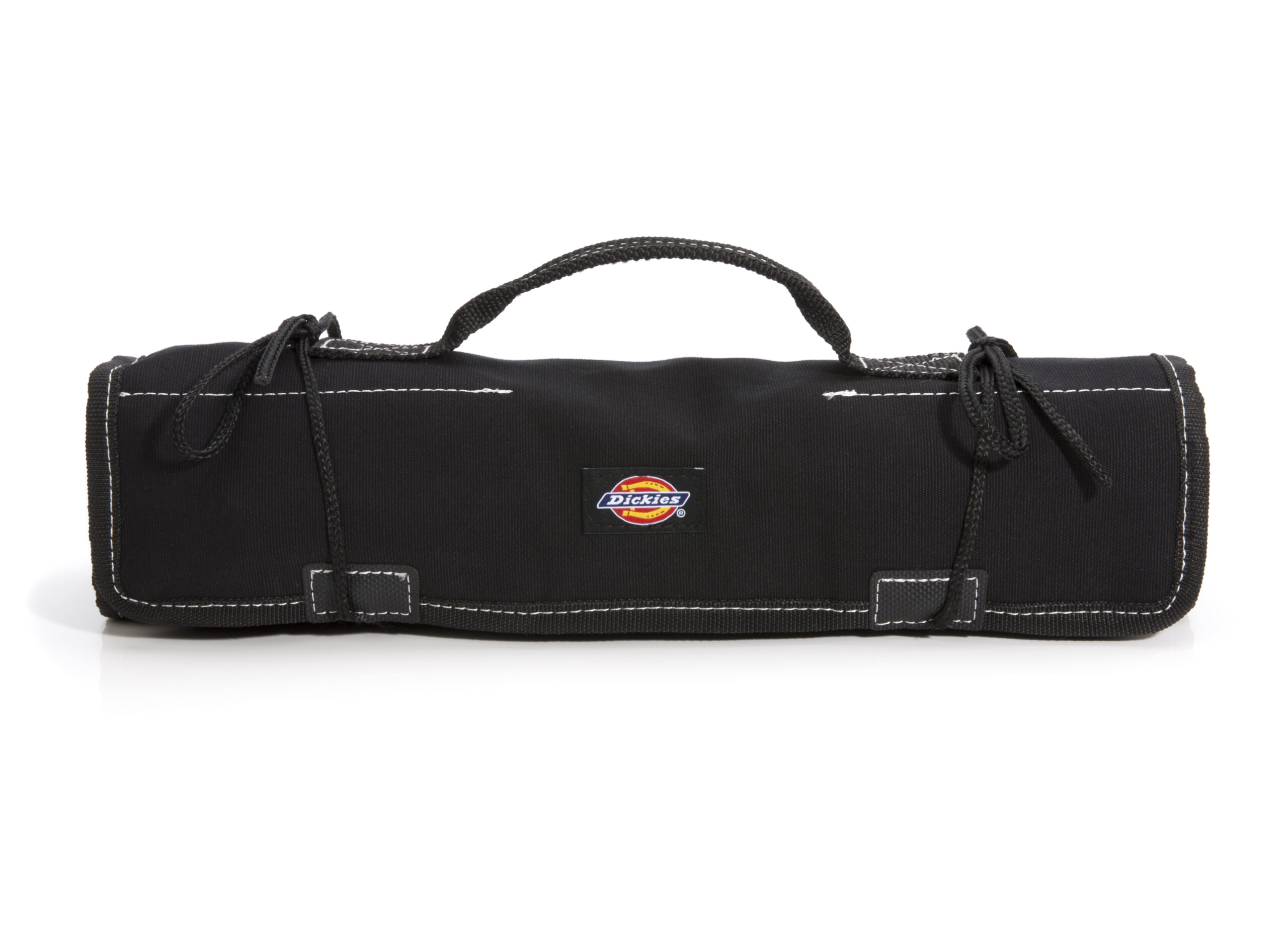 Expertly store your tools with the Dickies 57060 Large Wrench / Tool Organizer Roll. This handy black fabric tool roll features 23 individual pockets with enough clearance to hold an entire ratcheting or standard wrench set, ratchets, socket extensions, precision and regular screwdrivers and any other hand tools you might have. Made of durable and rip-resistant cotton canvas it features fold-over protective flaps to keep your tools in place during transport between jobs, and with its convenient roll-up design, you can easily pick up and go. The reinforced drawstring ties keep the roll secured shut, and the webbed handle makes carrying a breeze.