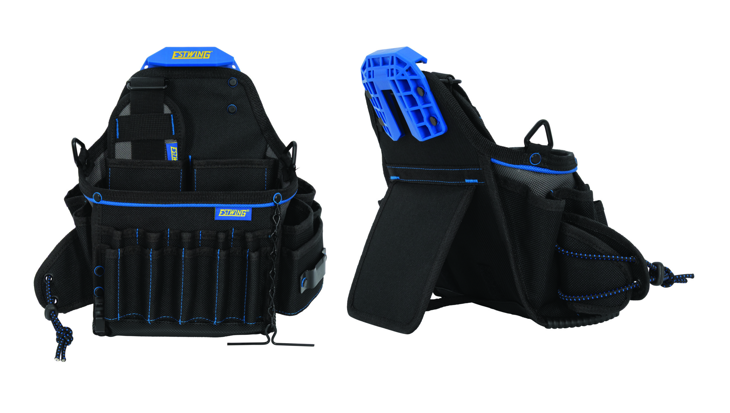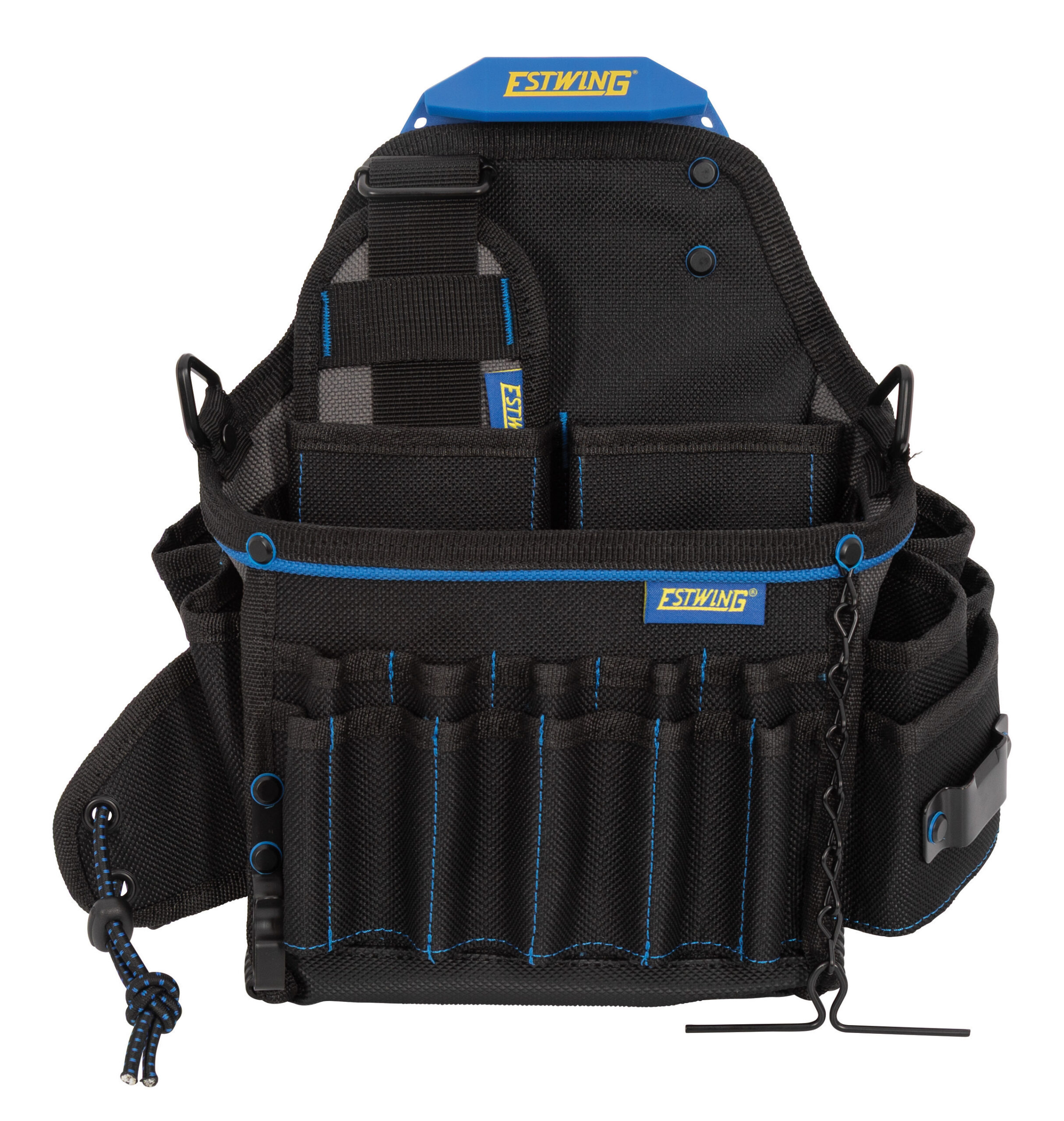 Built for electrical professionals, the Estwing 42625 Electrician Pouch with Tape Chain keeps specialized tools organized and accessible. Constructed from rugged 1200-denier polyester with rivet-reinforced stress points and protective rubberized binding feet, this pouch attaches securely to any PROLOCK? quick-release clip for versatile use. A spacious main pocket and 27 loops and compartments organize screwdrivers, pliers, crimpers, testers, and wire strippers. Features include an adjustable flashlight holder, steel tape-measure clip, spring clip for wrenches, and a rivet-anchored tape chain for multiple rolls of electrical tape. A folding kickstand allows freestanding use, and a PVC-reinforced base protects against moisture and abrasion. Includes a detachable shoulder strap and one steel PROLOCK? quick-release mounting clip.