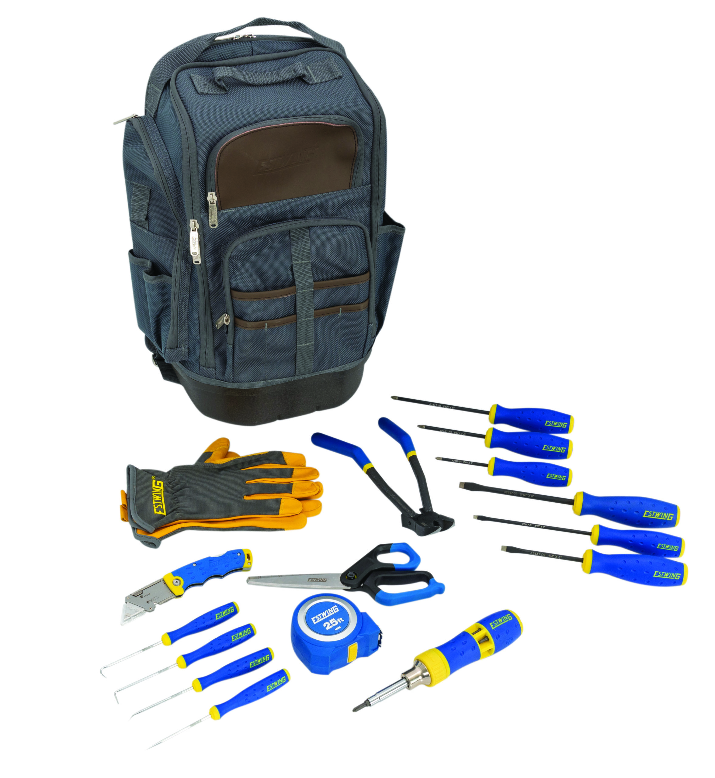 Be prepared for a range of general maintenance and repair tasks with this 35-piece kit. Designed to fit inside the included 20-inch hard-bottom tool backpack, this kit includes a range of general purpose tools along with a pair of protective large size, leather-palm work gloves to keep your hands safe while you work. Tools included in the kit are a selection of 3 slotted and 3 Phillips diamond coated magnetic tip screwdrivers, a 19-in-1 reversible ratcheting bit driver, a 4-pick hook and pick set, a 25-foot double-sided tape measure, a folding lock back utility knife, and a nail jack fastener removal tool. The included backpack is designed to hold a multitude of tools, providing the storage you need to add to the kit with additional specialty tools to make a truly custom tool set. Whether it’s for general around the house maintenance, minor jobsite repairs or similar tasks, this kit has the tools to help you get the job done. For additional details on included items, see the following Estwing part numbers: 94759, 42441, 42450, 42447, 42453, 42586, 42543, 42589 and EWLPSC0610.