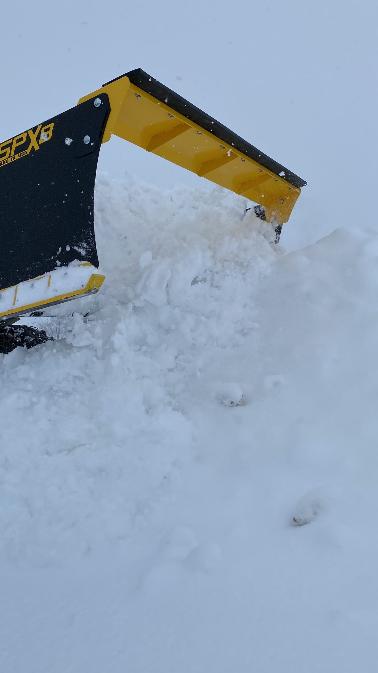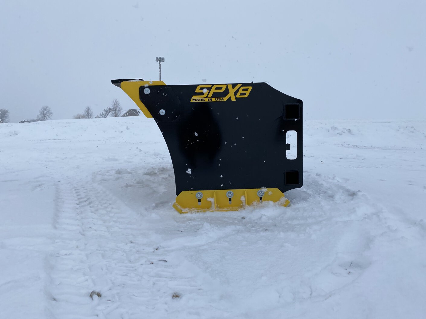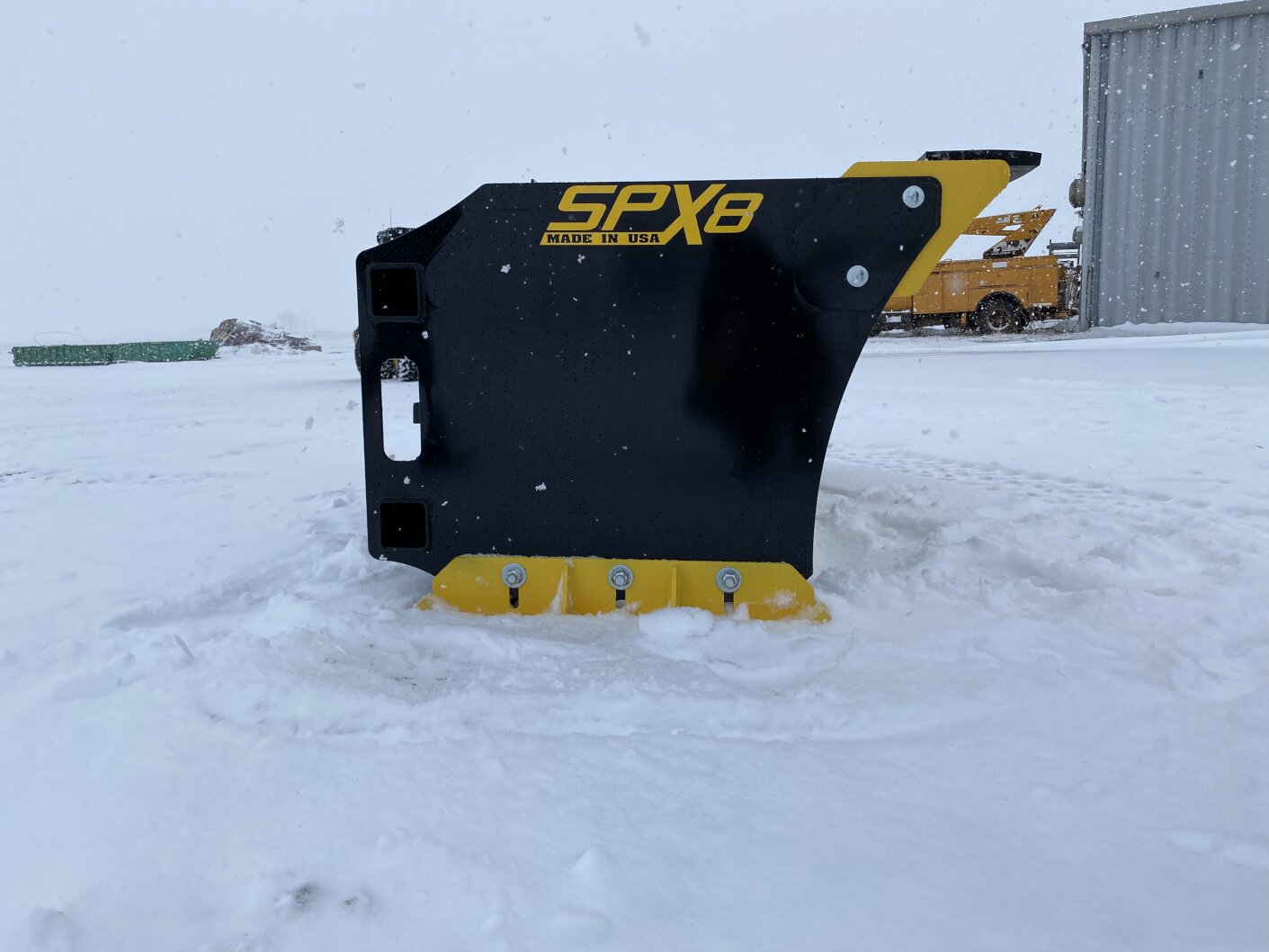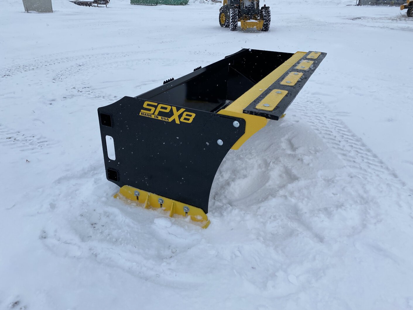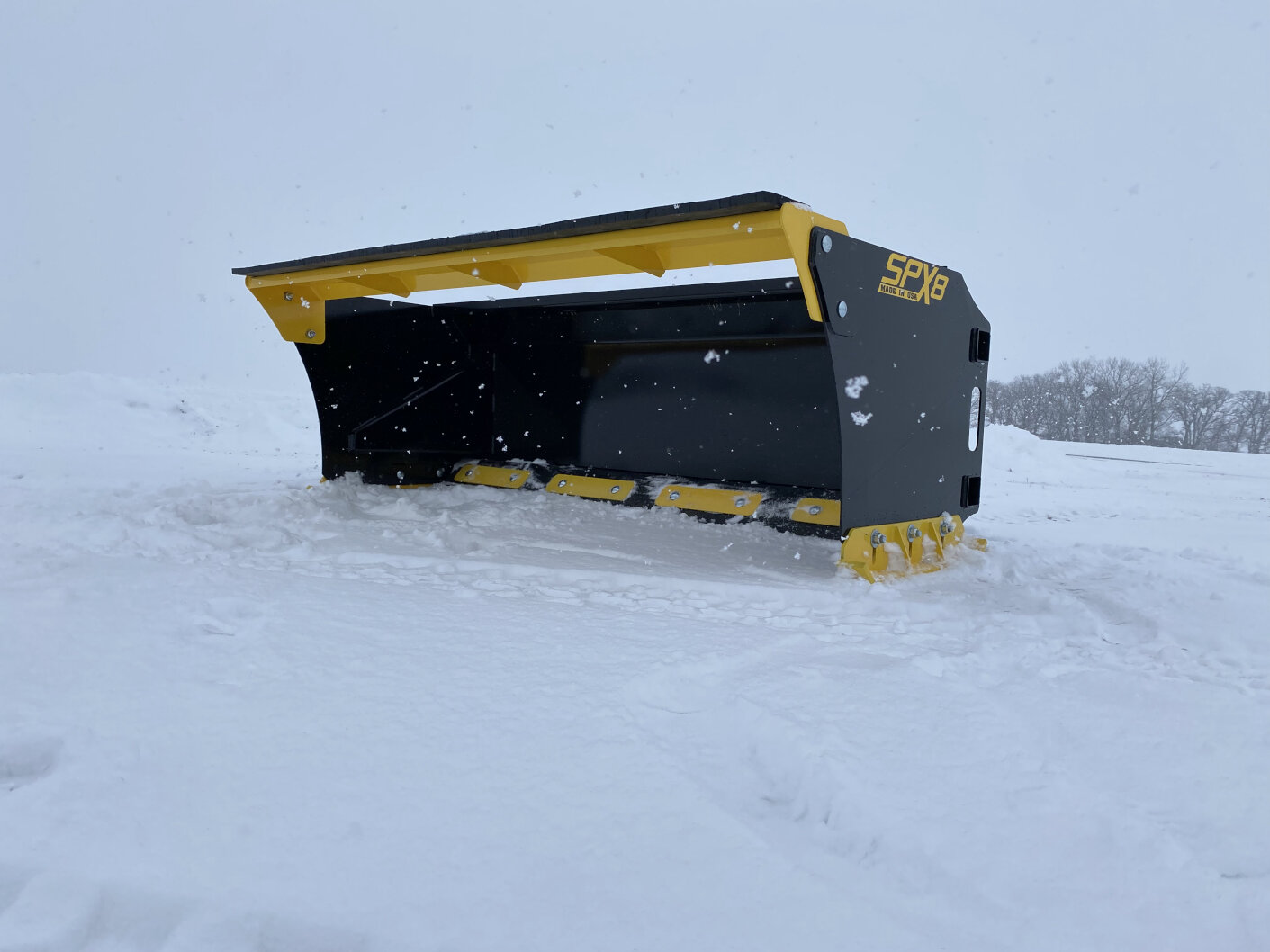 The Stinger Attachments snow pusher is a heavy built box with an excellent design geared toward customers with large properties, business owners, and commercial contractors wanting to spend less time moving large amounts of snow quickly and efficiently. The advantage of the pusher vs the bucket is not having to take time to dump at the pile. Over time this will save the operator plenty of seat time. Our box size is 30” x 30” and is available in multiple widths. Our rear moldboard is constructed out of grade 50 steel, the moldboard is supported with 2 large channels upper & lower that add superior strength. The side panels are made of steel that is reinforced at the skids and dragback areas. Our pushers come standard with a bolt on Steel or Rubber Cut Edges with adjustable wear skids. Drag Back bars are optional and allow for getting into hard to reach places.