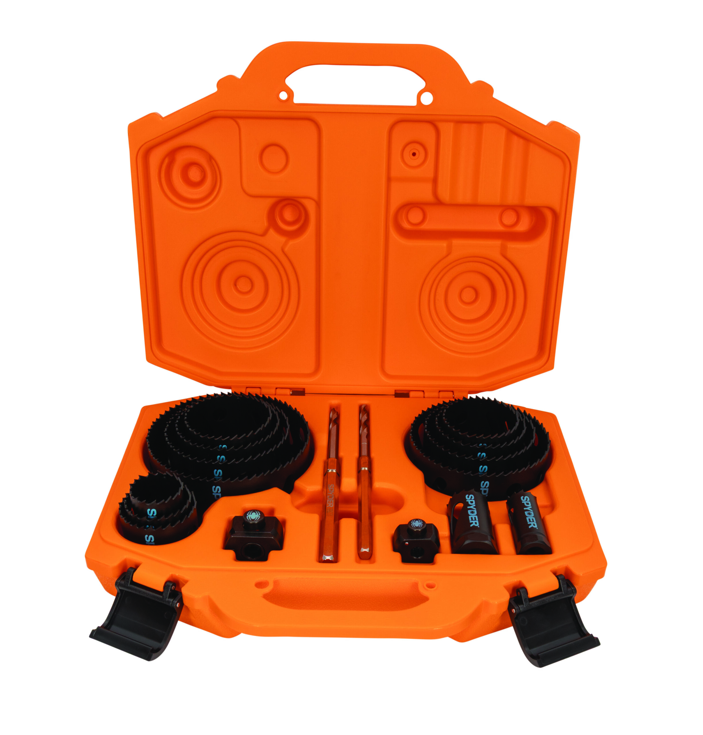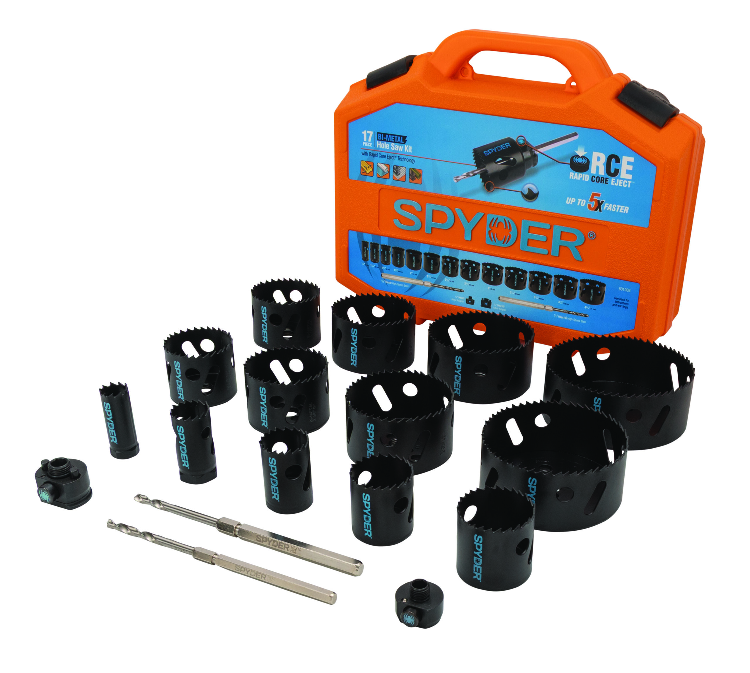Spyder?s Bi-Metal hole saws feature variable tooth pitch geometry and bi-metal steel that make them the durable choice for making holes in wood with nails, metals and plastics. Use Spyder?s Rapid Core Eject? arbor system to remove cores without prying ? drill hole, press button, pull back the hole saw, and eject the core. Cut at an angle, and use two adapters (second adapter sold separately) on one pilot bit to enlarge existing holes. All Spyder hole saws fit on Spyder Rapid Core Eject? arbor/pilot bits, and on universal hole saw arbors.