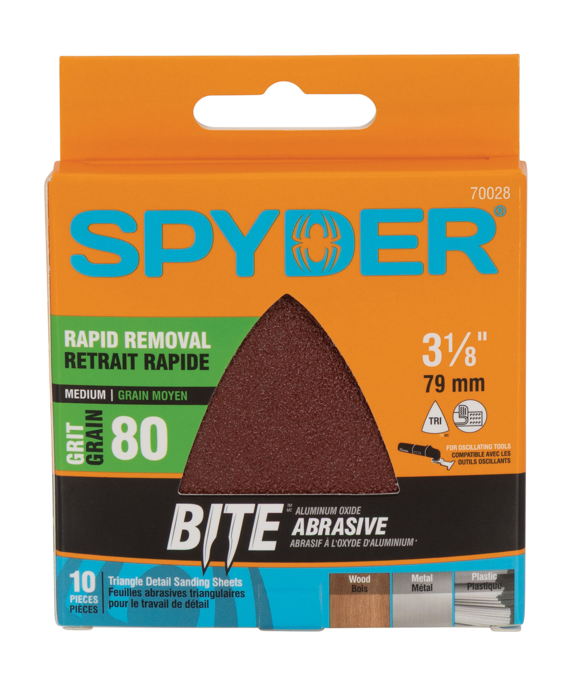 Smooth out every surface with precision using Spyder 3-1/8″ 80-Grit Aluminum Oxide Triangular Detail Sanding Sheets (10pc). Designed for aggressive material removal, these 80-grit sheets are perfect for sanding wood, metal, and plastic with speed and consistency. The triangular shape fits easily into corners and tight spaces, while the aluminum oxide abrasive provides long-lasting performance and clog resistance. Whether you’re prepping a finish or cleaning up rough edges, these sanding sheets deliver the power and control you expect from Spyder.