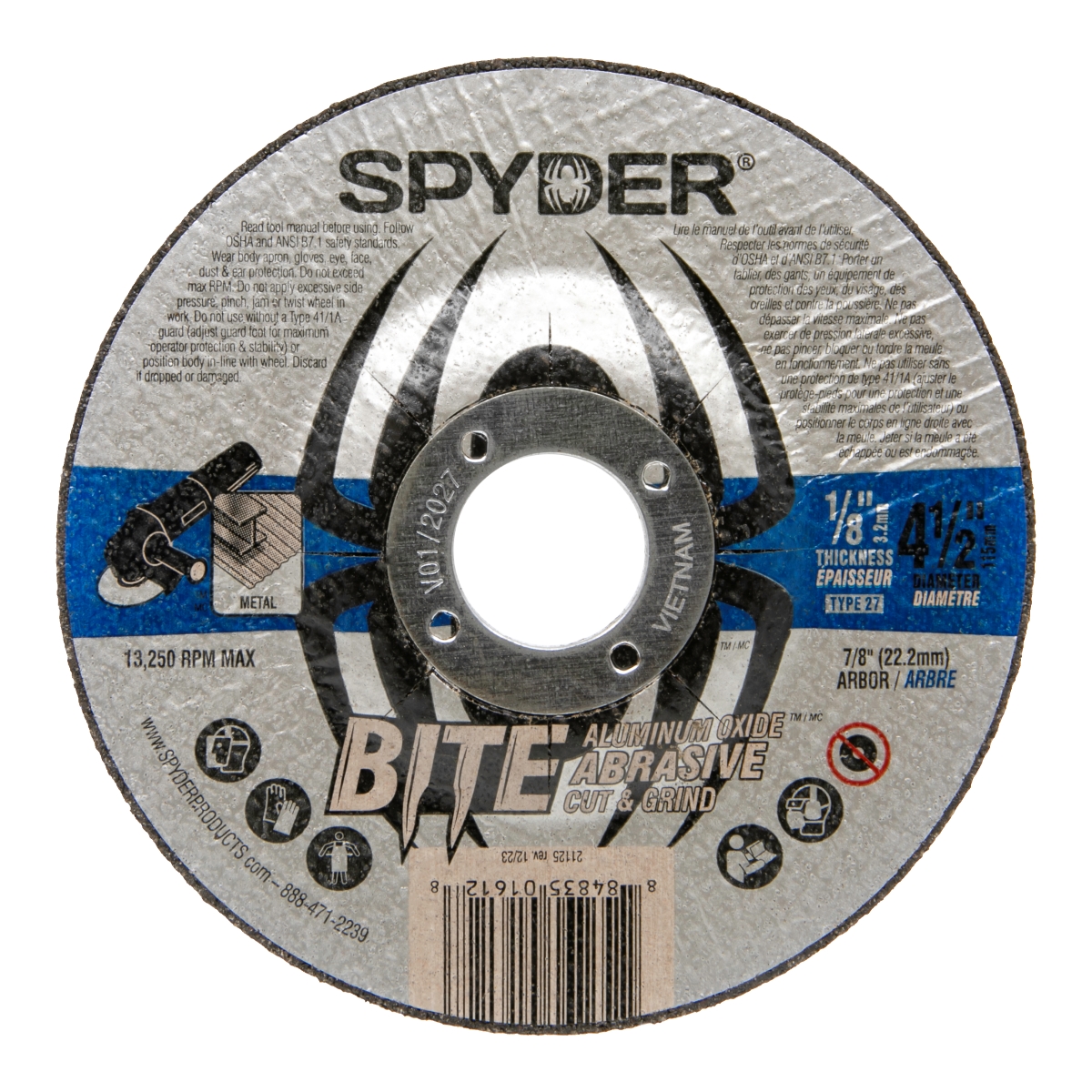 Spyder Bite aluminum oxide abrasive bonded grinding wheels provide fast cuts and quick material removal on mild steel, stainless steel, ferrous metal and cast iron. A reinforced design yields more fast material removal on battery-operated tools and provides extended performance on higher torque plug-in tools.