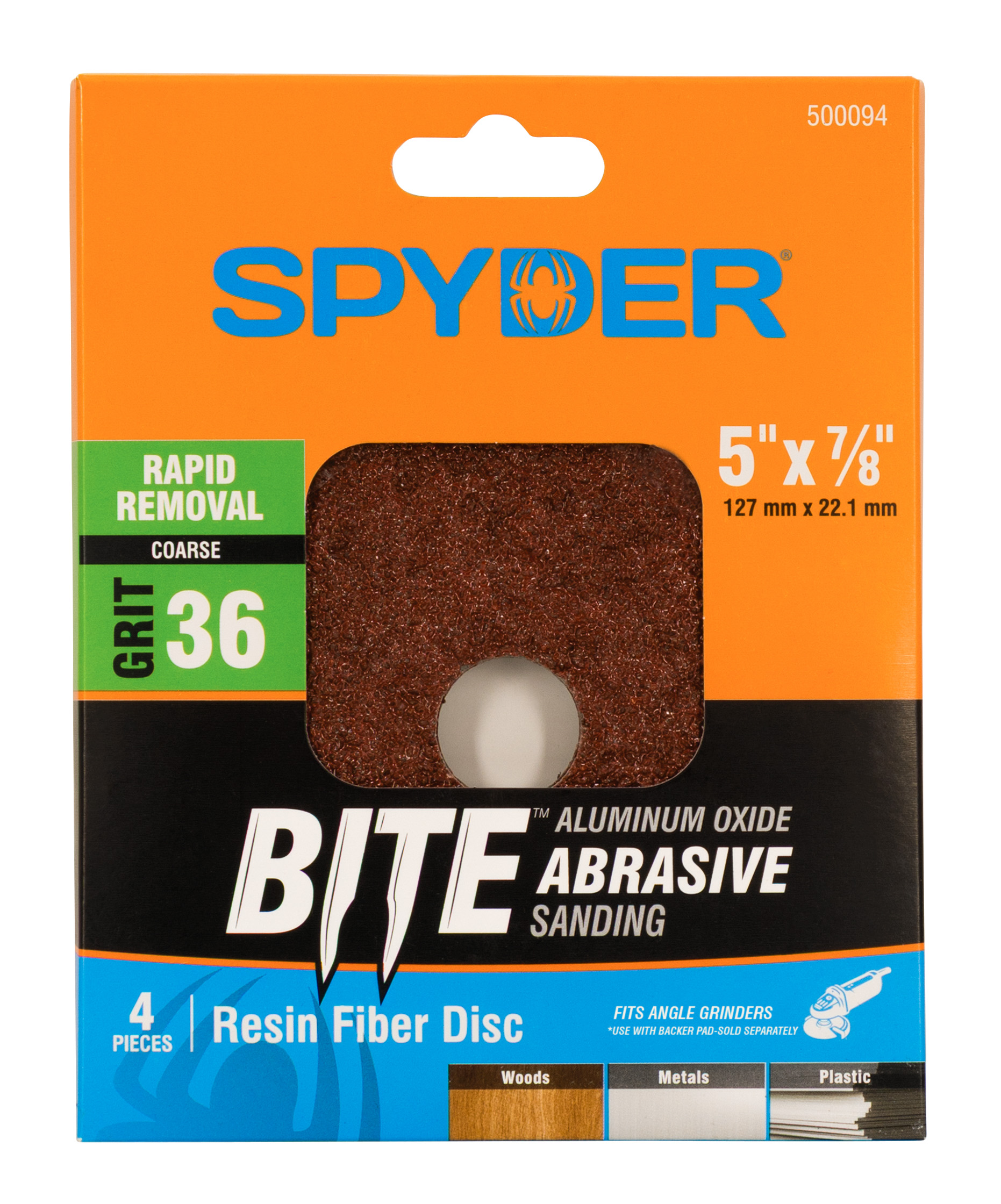 Spyder Bite? Aluminum Oxide Resin Fiber Discs are built for tough, general-purpose sanding on wood, metal, and plastic. Featuring premium aluminum oxide grain bonded to a durable resin fiber backing, these discs deliver fast, aggressive cuts with long-lasting performance-perfect for woodworking, metal surface prep, and material shaping. Designed for use with angle grinders and compatible backing pads, they hold up under pressure and maintain their edge through demanding jobs. Whether you’re smoothing wood, grinding metal, or cleaning up plastic surfaces, Spyder Resin Fiber Discs bring professional-grade results with every spin.