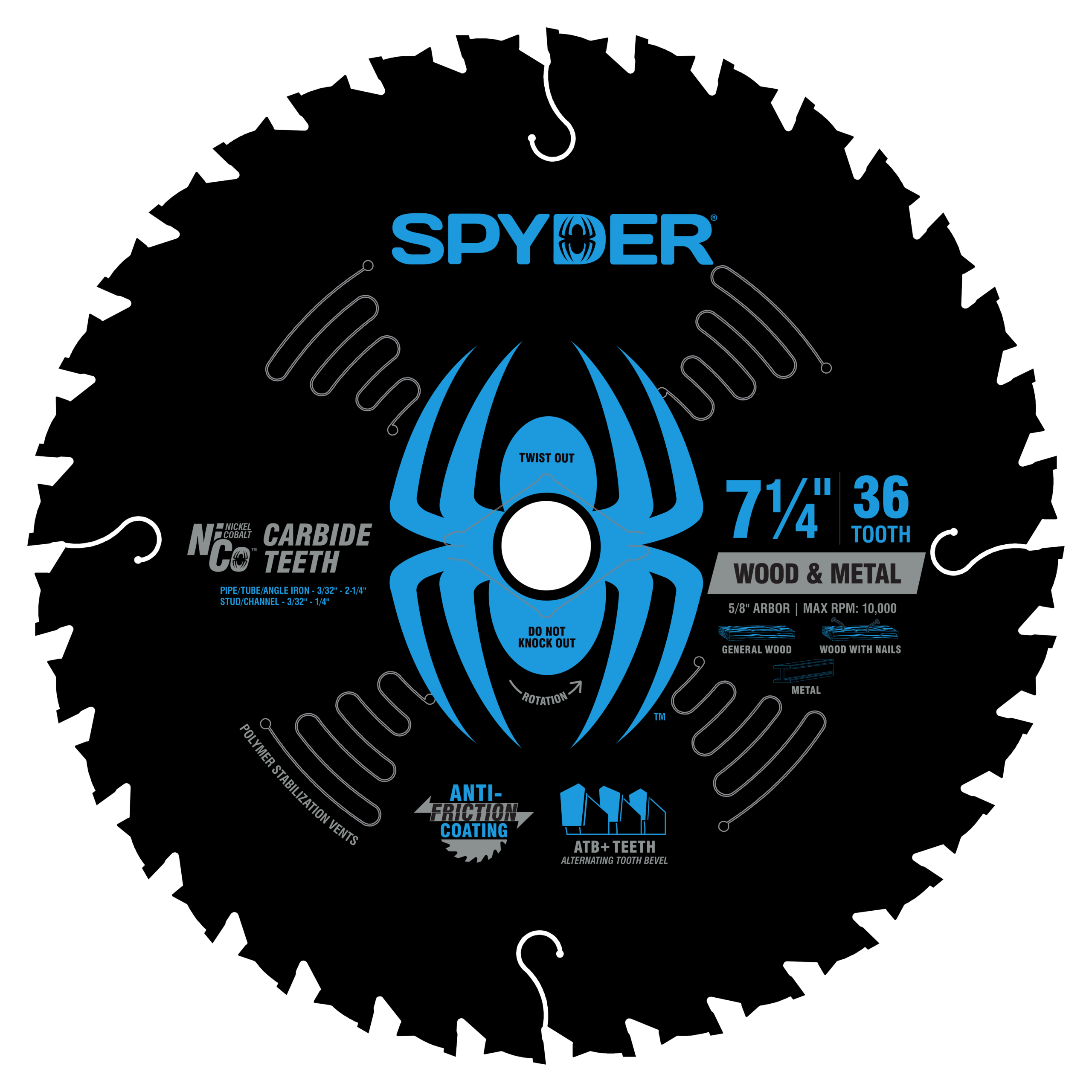 Built to power through the unpredictable, the Spyder Wood and Metal Circular Saw Blade tackles general wood-and wood with nails-without hesitation. Outfitted with NiCo? carbide teeth in a rugged ATB+ tooth geometry, this blade delivers clean cuts with brutal durability. Whether you’re demoing, framing, or dealing with reclaimed lumber, the anti-friction coating keeps the blade cooler and cleaner for longer performance. Engineered to take the hits and keep cutting, this is the blade you trust when the job gets tough.