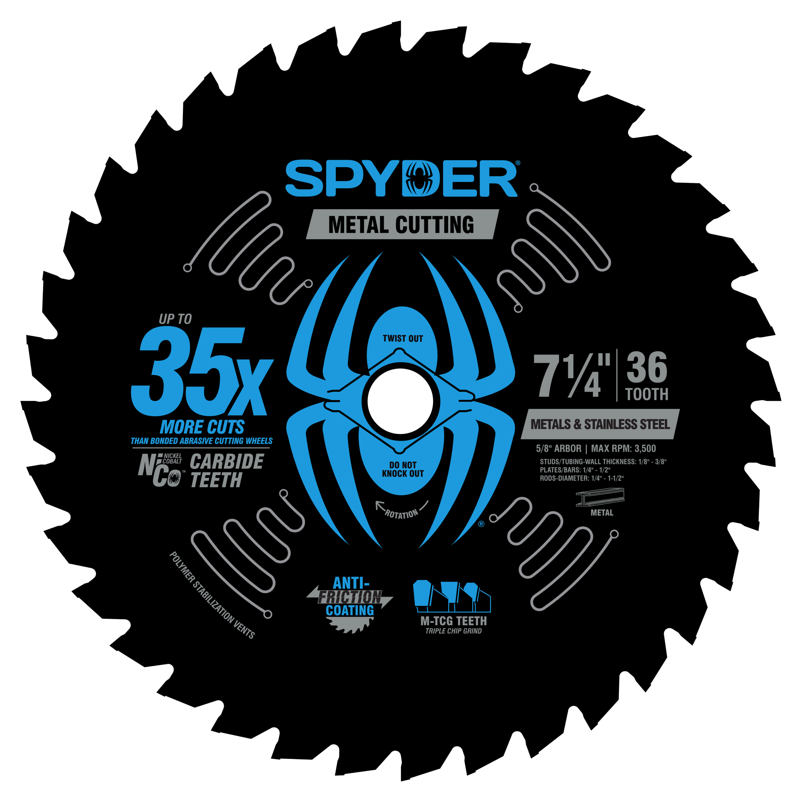 Spyder metal-cutting circular saw blades are the ideal choice for clean cutting steel and other metal profiles. These high-performance blades last up to 35x longer than standard bonded abrasive cutting wheels and make those cuts up to 10x faster. Ultra tough NiCo2 carbide cutting teeth, made with upgraded nickel cobalt, feature a modified triple chip grind for unsurpassed cutting speed, life, and cleanliness – expelling larger chips with less cutting heat, dust, and debris. An interfused anti-friction coating prevents blade binding and polymer-filled stabilization vents reduce noise and vibration for ultra-precise burr-free cuts. metal-cutting saw blades are compatible with cordless and corded circular saws and can be used to cut steel and metal profiles of various thicknesses. Ideal for steel bar, sheet, extrusions, studs, channel, angle iron, conduit, pipe, rebar, rods and more.