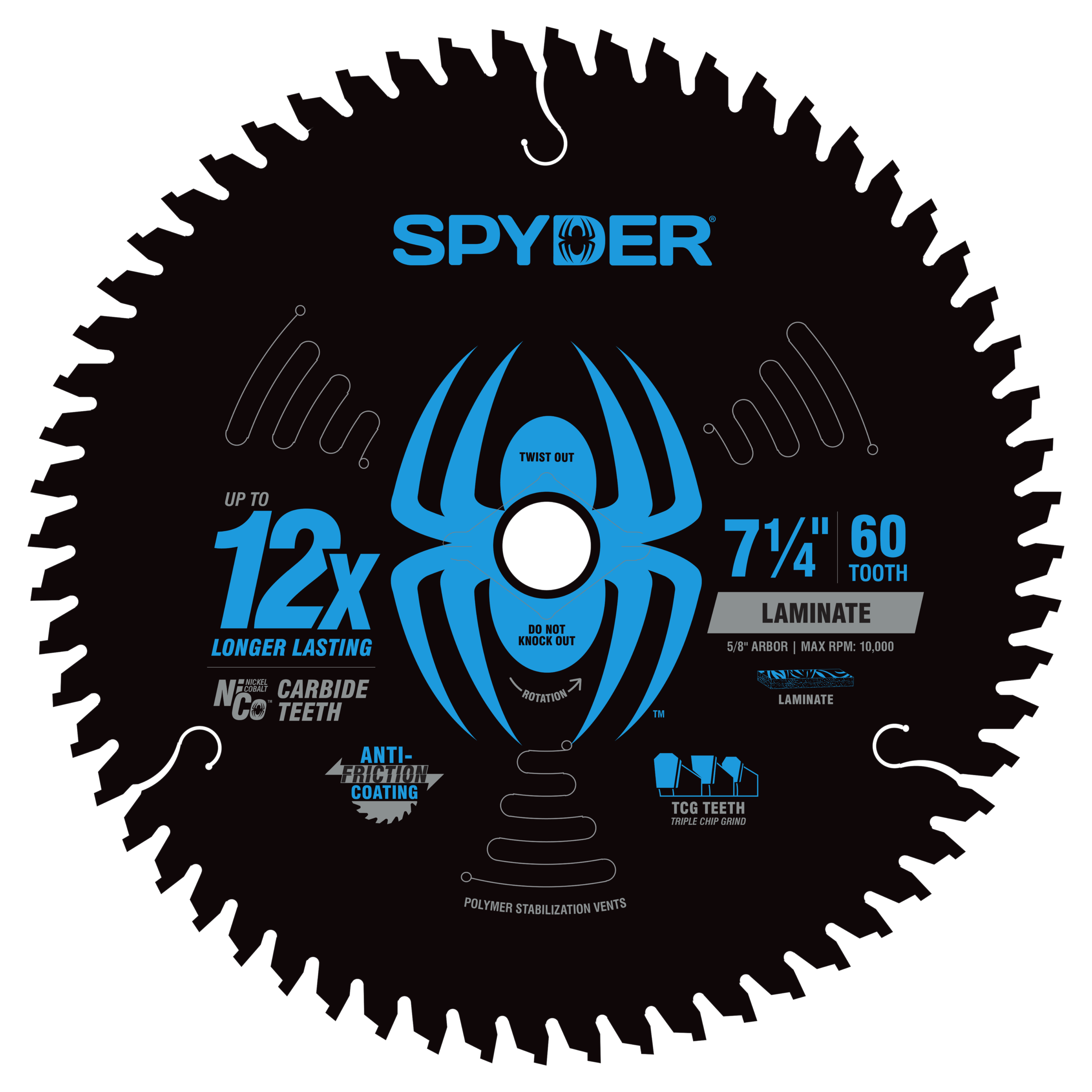 The Spyder circular saw blade for Laminate is the ideal choice for ultra clean cuts in wood materials with a top- and bottom-laminated surface. NiCo teeth are sharpened in a triple chip grind (TCG) to provide clean cuts to both the top and bottom laminated surfaces. Tracking straight with reduced friction, heat and noise, circular saw blades are the professional choice for cutting down cabinet boards and other laminated wood materials. Up to 6x the life of standard carbide blades.