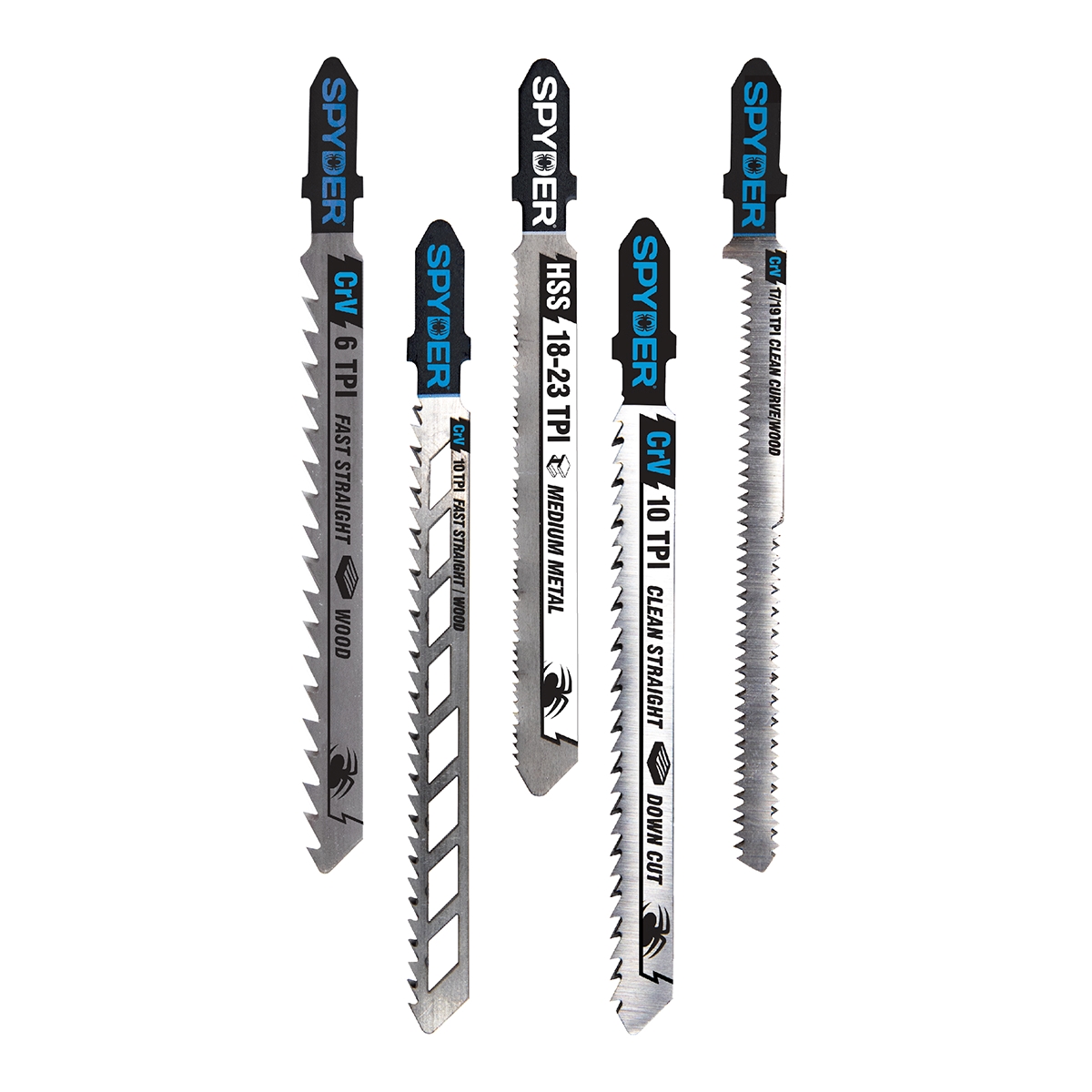 Cut your work in half by using Spyder jig saw blades! Spyder’s made-in-Germany Chrome Vanadium jig saw blades are ideal for tough cutting tasks that require the clean curve or straightest linear cuts in wood. High Speed Steel blades make cutting through metal a breeze! With various lengths and tooth designs for all your cutting needs, these blades help get the job done faster and easier. Their universal T-shank can be used in all major brands of jig saws, both corded and cordless. This 5-piece set includes blades from 3.63-inches to 4-inches, with teeth for soft and hard woods, as well as metal up to 1/8-inch thick.