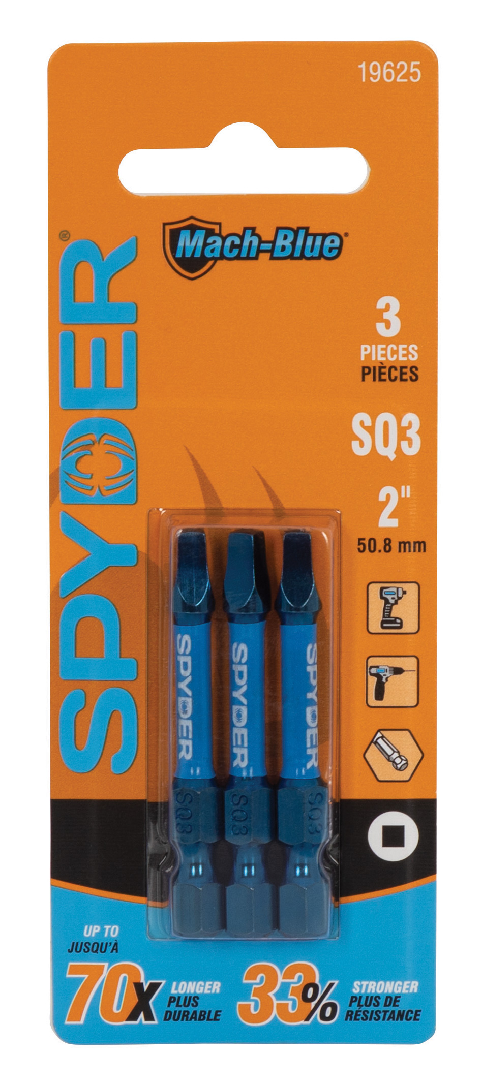 Spyder Mach-Blue? impact rated driver bits are the durable driving bit for demanding high torque impacting applications. Mach-Blue? Tough Tip Technology significantly reduces tip wear for reliable fastener driving – up to 70x longer life than other impact rated driver bits. IMPACTive? alloy tool steel torsion zones actively flex to dissipate peak impact forces, reducing fastener recess damage and preventing tip breakage. Mach-Blue? driver bits are optimized for use in high torque cordless impacting drivers and drill drivers, making them the pro powered tool that outlasts your workday.
