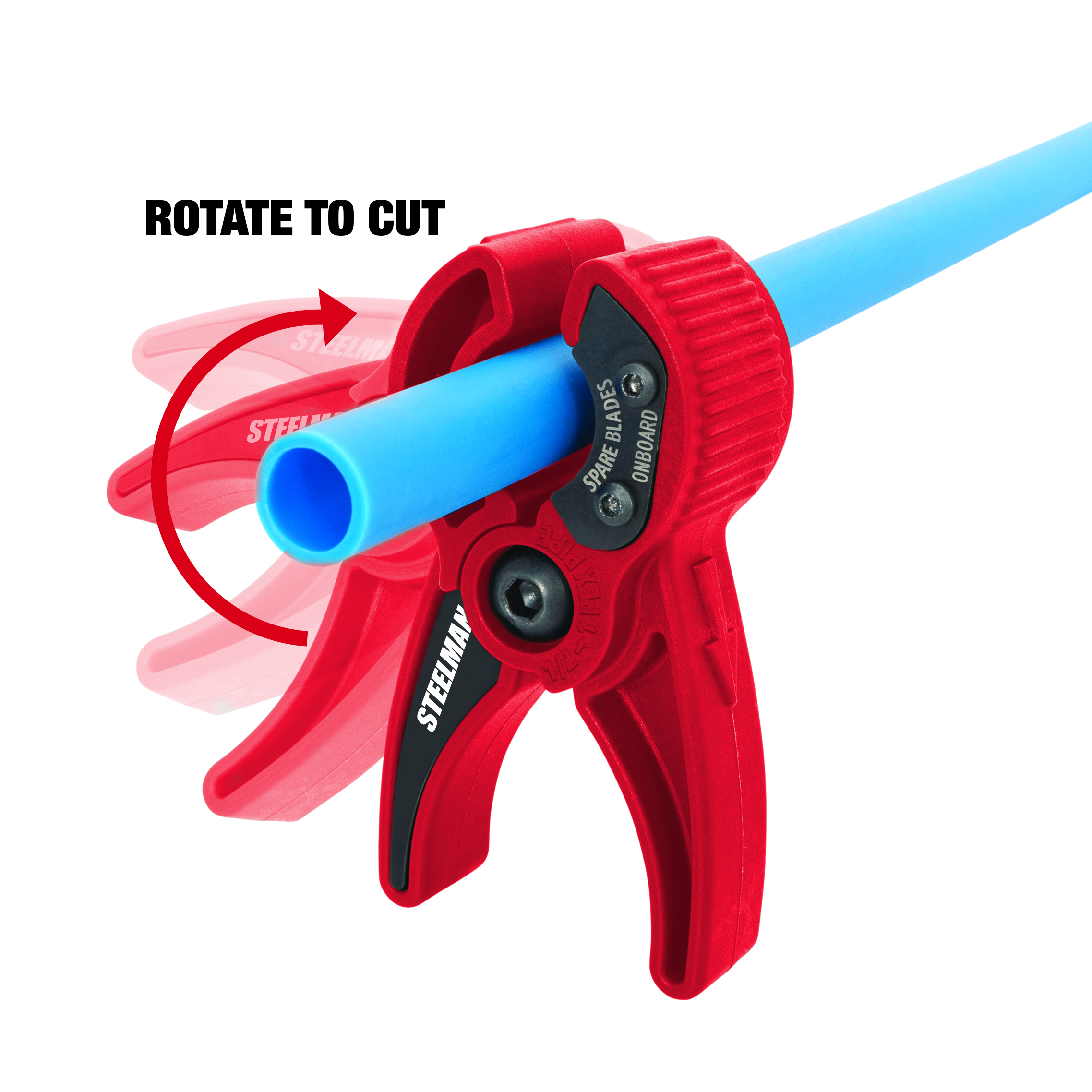 The STEELMAN 61206 1/2-inch to 1-inch Pex Pipe and Tubing Cutter is engineered to make precise cuts in a variety of PEX pipe sizes. Made with a glass fiber reinforced polyamide body, this tool offers exceptional durability and resilience for long-term use. The razor-sharp stainless steel blade ensures clean and precise cuts every time, while the self-adjusting design automatically adapts to different pipe diameters. This cutter features a lightweight construction at just 0.24 lb., making it easy to handle and perfect for prolonged use. The ribbed thumb and finger rests provide a non-slip grip, enhancing comfort and control during operation. Designed exclusively for PEX pipes, this tool also includes integrated blade storage and a built-in blade guard for added safety.