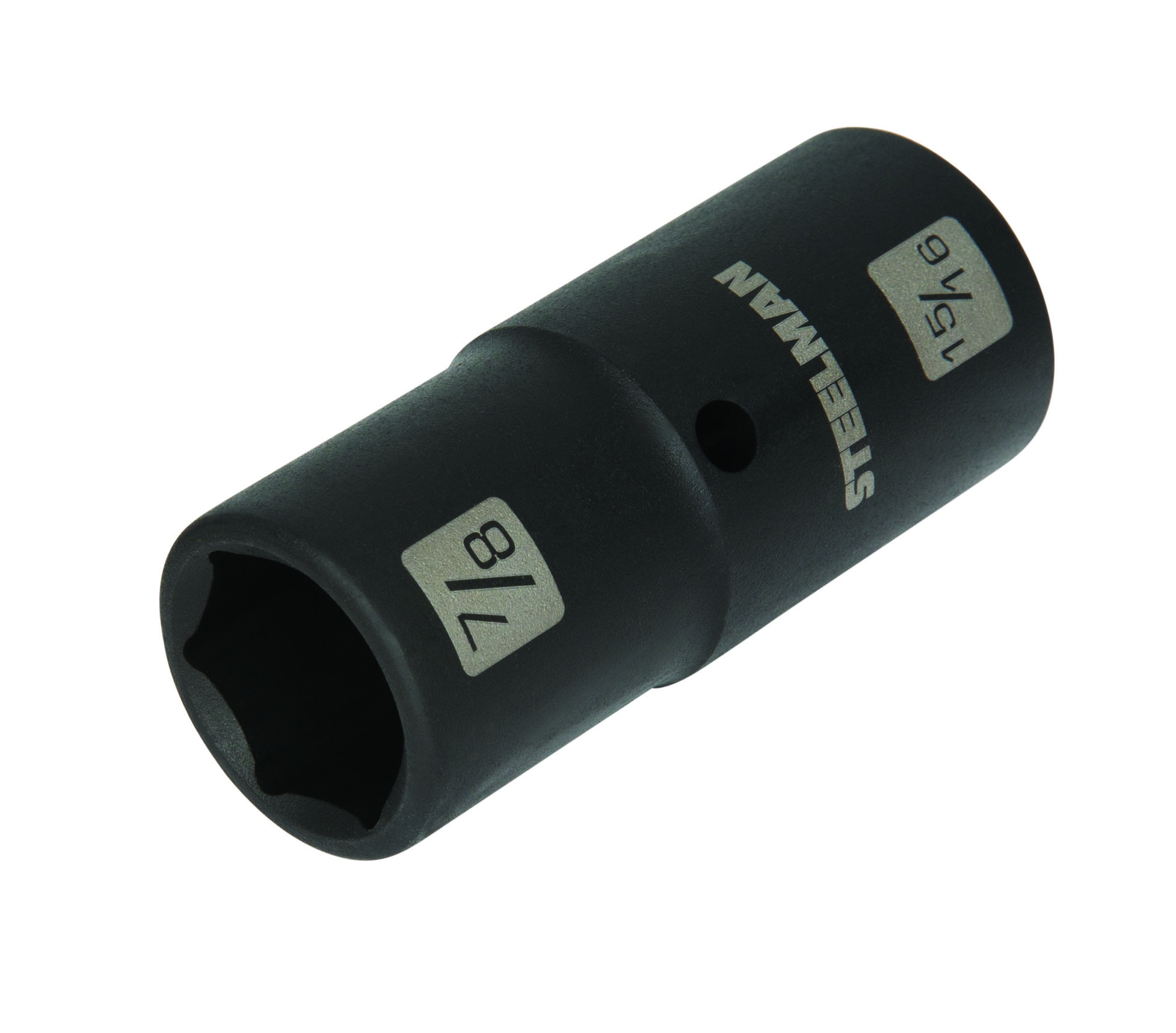 The STEELMAN 99563 1/2-Inch Drive Impact Flip Socket, 7/8-Inch x 15/16-Inch was designed to save you time by maximizing efficiency. This dual-ended, 6-point standard/SAE impact grade flip socket allows you to work on both 7/8-inch and 15/16-inch lug nuts and fasteners without having to constantly switch sockets. Made of durable and hardened chromoly steel which is then given a black oxide protective coating, this socket is designed to meet or exceed 150% proof of torque under ASME tool performance testing standards. Fitting easily over an impact extension or onto an impact wrench’s extended anvil, this socket’s recessed edges provide the most accurate fit possible, gripping fasteners by the sides and not the edges which results in reduced slippage and rounding/fastener damage. Laser-etched size callouts make identification among other sockets easy. Whether you?re a professional mechanic at a repair or tire shop, or just love to work on your own cars and vehicles, this flip impact socket set is a must for working efficiently!
