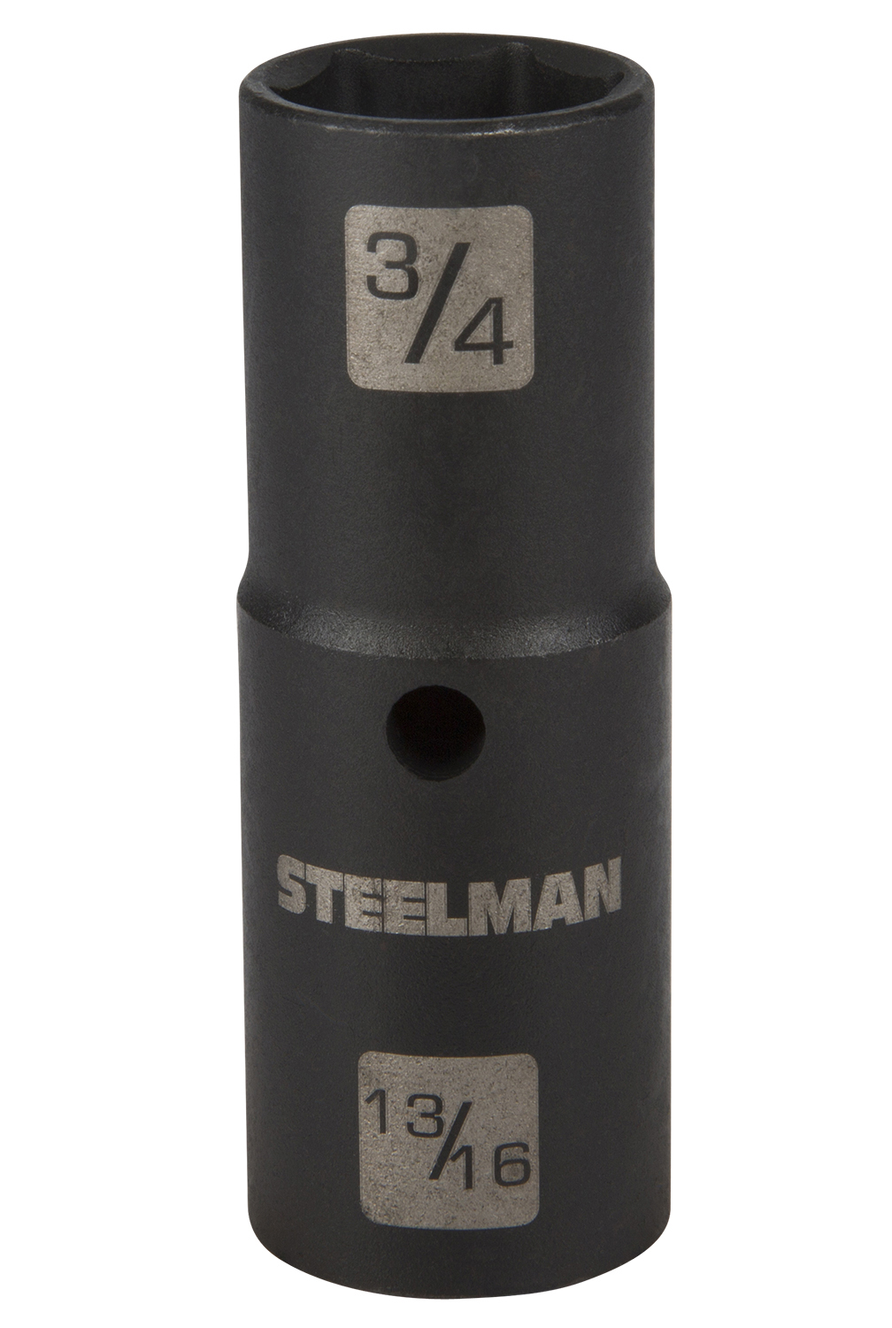 The STEELMAN 99562 1/2-Inch Drive Thin-Wall Impact Flip Socket, 3/4-Inch x 13/16-Inch was designed to save you time by maximizing efficiency. This dual-ended, 6-point standard/SAE impact grade flip socket allows you to work on both 3/4-inch and 13/16-inch lug nuts and fasteners without having to constantly switch sockets. Made of durable and hardened chromoly steel which is then given a black oxide protective coating, this socket is designed to meet or exceed 150% proof of torque under ASME tool performance testing standards. Fitting easily over an impact extension or onto an impact wrench’s extended anvil, this socket’s recessed edges provide the most accurate fit possible, gripping fasteners by the sides and not the edges which results in reduced slippage and rounding/fastener damage. In addition, the thin-walled design allows this socket to reach fasteners where there is less side clearance. Laser-etched size callouts make identification among other sockets easy. Whether you?re a professional mechanic at a repair or tire shop, or just love to work on your own cars and vehicles, this flip impact socket set is a must for working efficiently!