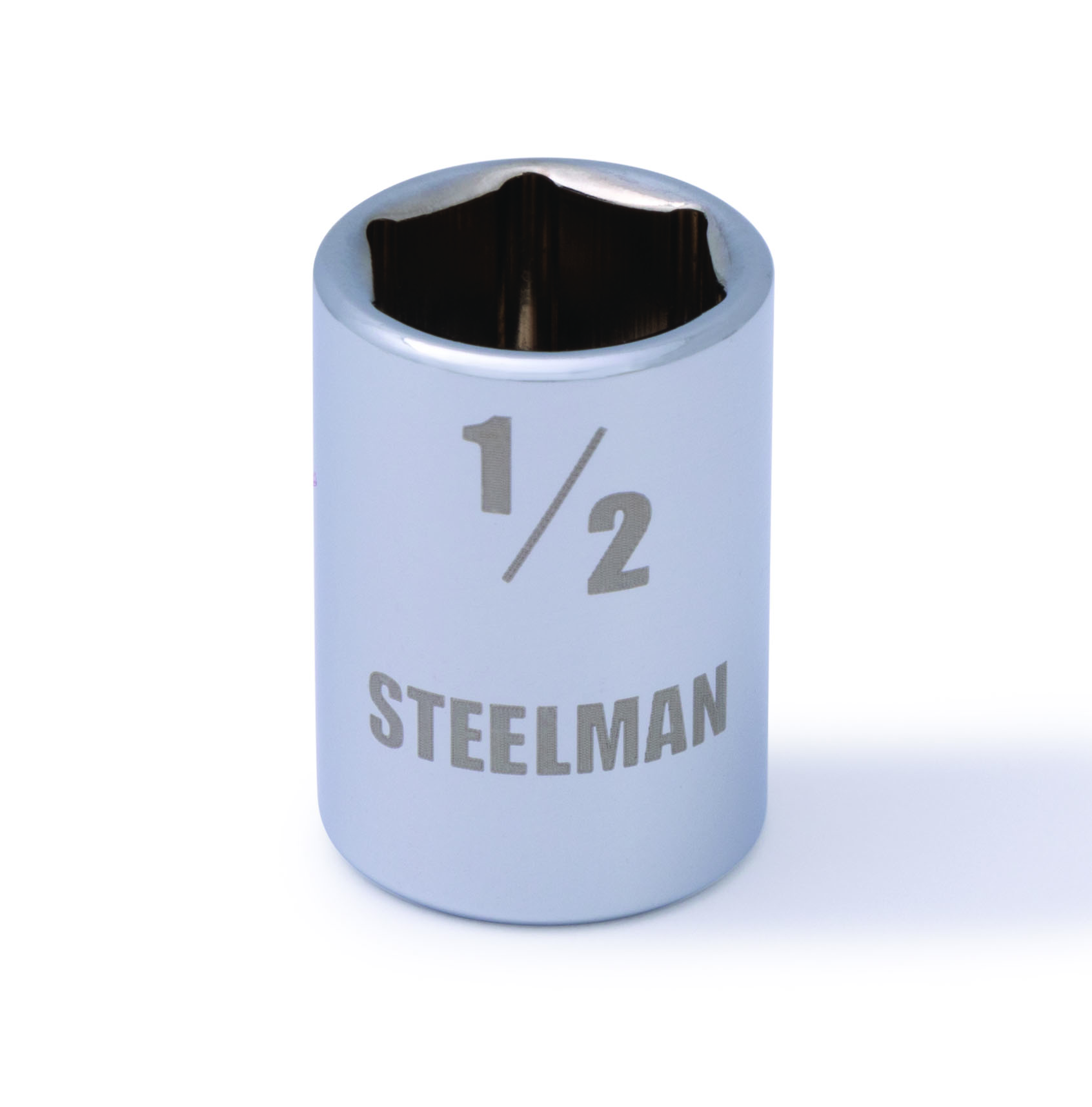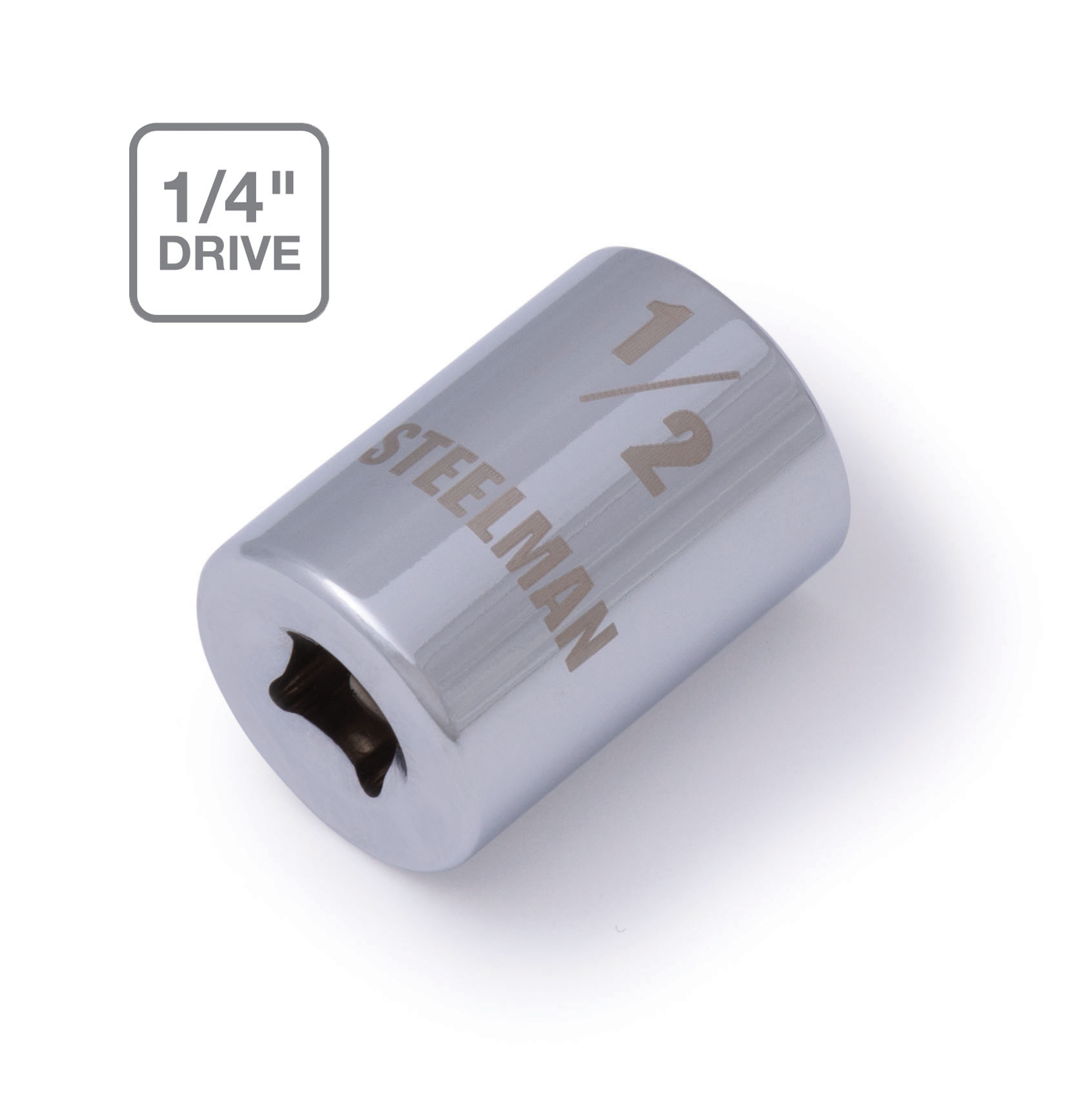 If you need a socket you can depend on, be sure to find a home in your tool box for the STEELMAN 78156 1/4-Inch Drive x 1/2-Inch Shallow Depth 6-Point Chrome SAE Single Socket. Constructed of durable heavy-duty chrome vanadium steel, this socket has the strength required for high torque jobs and will fit onto any 1/4-inch drive ratchet, torque wrench, extension bar, or adapter. The socket features a rust and corrosion resistant high polish chrome finish that not only looks good but is easy to wipe clean of dirt, oil, and grime. The socket’s 6-point design grips the sides of fasteners and not the corners, reducing wear and the chance of slippage or rounding the fastener. Easy to read size markings are laser etched onto the steel making it simple to identify the socket you need without the worry that the markings will wear away or rub off with use. Rated to meet or exceed ANSI / ASME performance requirements for hand tools, these can handle tough use in any professional or home shop / garage.