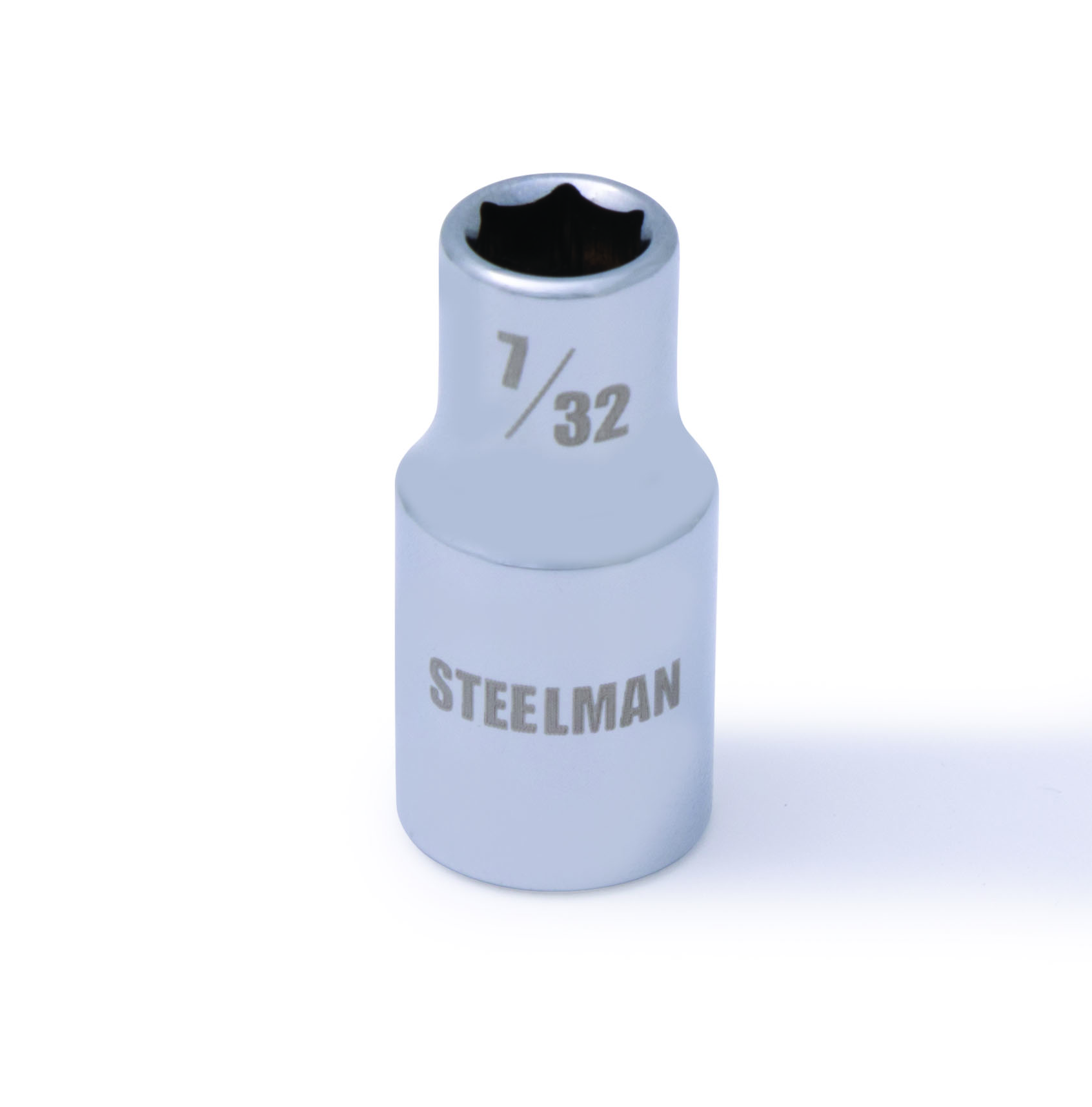 If you need a socket you can depend on, be sure to find a home in your tool box for the STEELMAN 78156 1/4-Inch Drive x 7/32-Inch Shallow Depth 6-Point Chrome SAE Single Socket. Constructed of durable heavy-duty chrome vanadium steel, this socket has the strength required for high torque jobs and will fit onto any 1/4-inch drive ratchet, torque wrench, extension bar, or adapter. The socket features a rust and corrosion resistant high polish chrome finish that not only looks good but is easy to wipe clean of dirt, oil, and grime. The socket’s 6-point design grips the sides of fasteners and not the corners, reducing wear and the chance of slippage or rounding the fastener. Easy to read size markings are laser etched onto the steel making it simple to identify the socket you need without the worry that the markings will wear away or rub off with use. Rated to meet or exceed ANSI / ASME performance requirements for hand tools, these can handle tough use in any professional or home shop / garage.