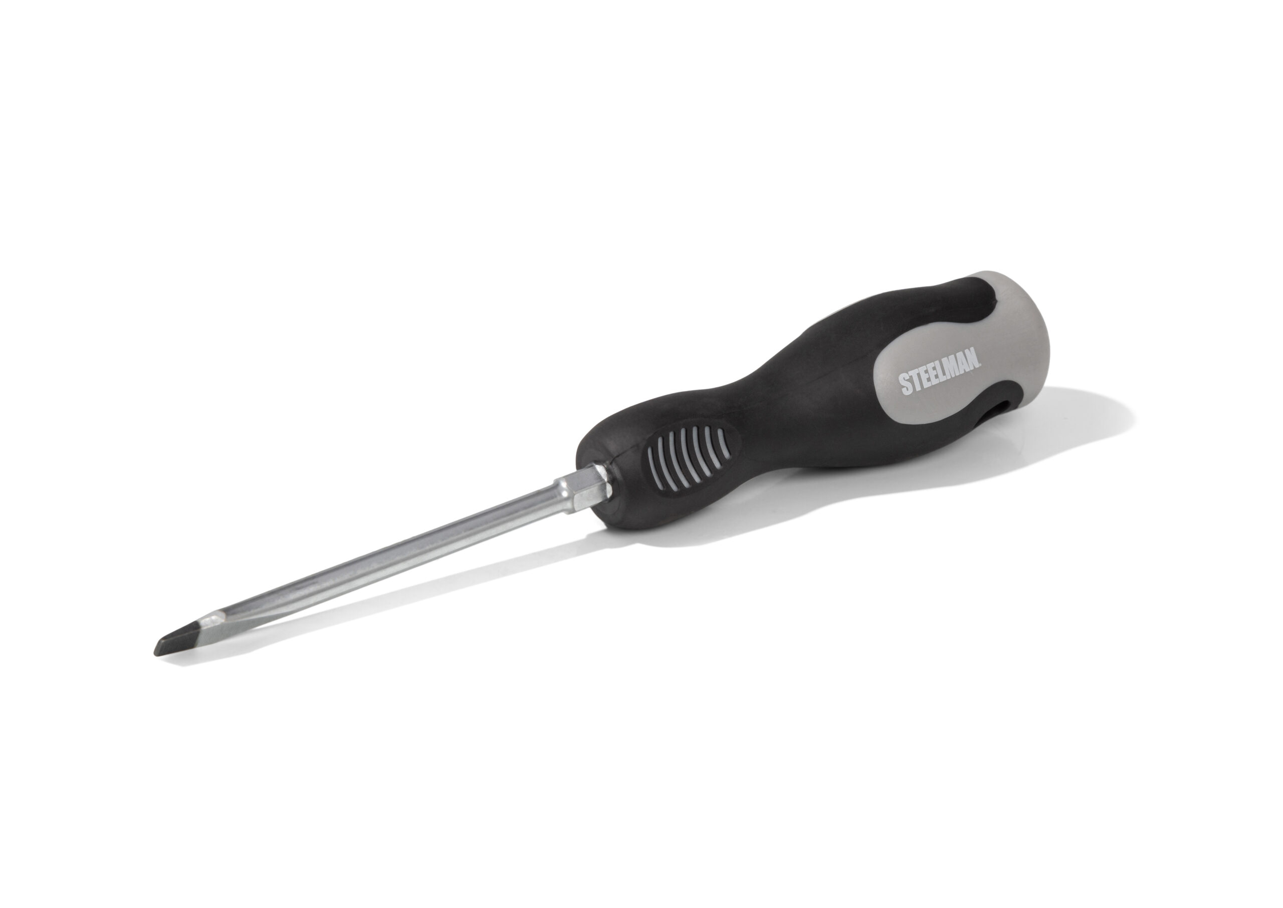 The STEELMAN 78463A 1/4-Inch x 4-Inch Slotted Tip Screwdriver with Comfort Grip Handle and Hex Bolster is a general-purpose screwdriver designed to handle the toughest jobs you find yourself facing. The durable shaft is made from long-lasting chrome-vanadium steel that has a high polish chrome finish that wipes easily clean from oil, grease, and other grime. The 1/4-inch wide slotted/flat blade tip is coated with a protective black oxide coating which adds increased grip in fasteners and won’t chip or flake off like plated tips. The 4-inch long shaft provides convenient reach when working on the surface as well as recessed fasteners. When encountering particularly stubborn fasteners, the shaft section next to the handle features a hex-shaped bolster that allows you to use an open-end or crescent wrench for added rotational torque. The dual-layer, rubber padded handle provides a comfortable grip, allowing for a longer work time with less strain on your hands. So whether it’s fixing cabinets, lighting fixtures, and other household repairs or working on cars and trucks in the garage, let STEELMAN help you get the job done.
