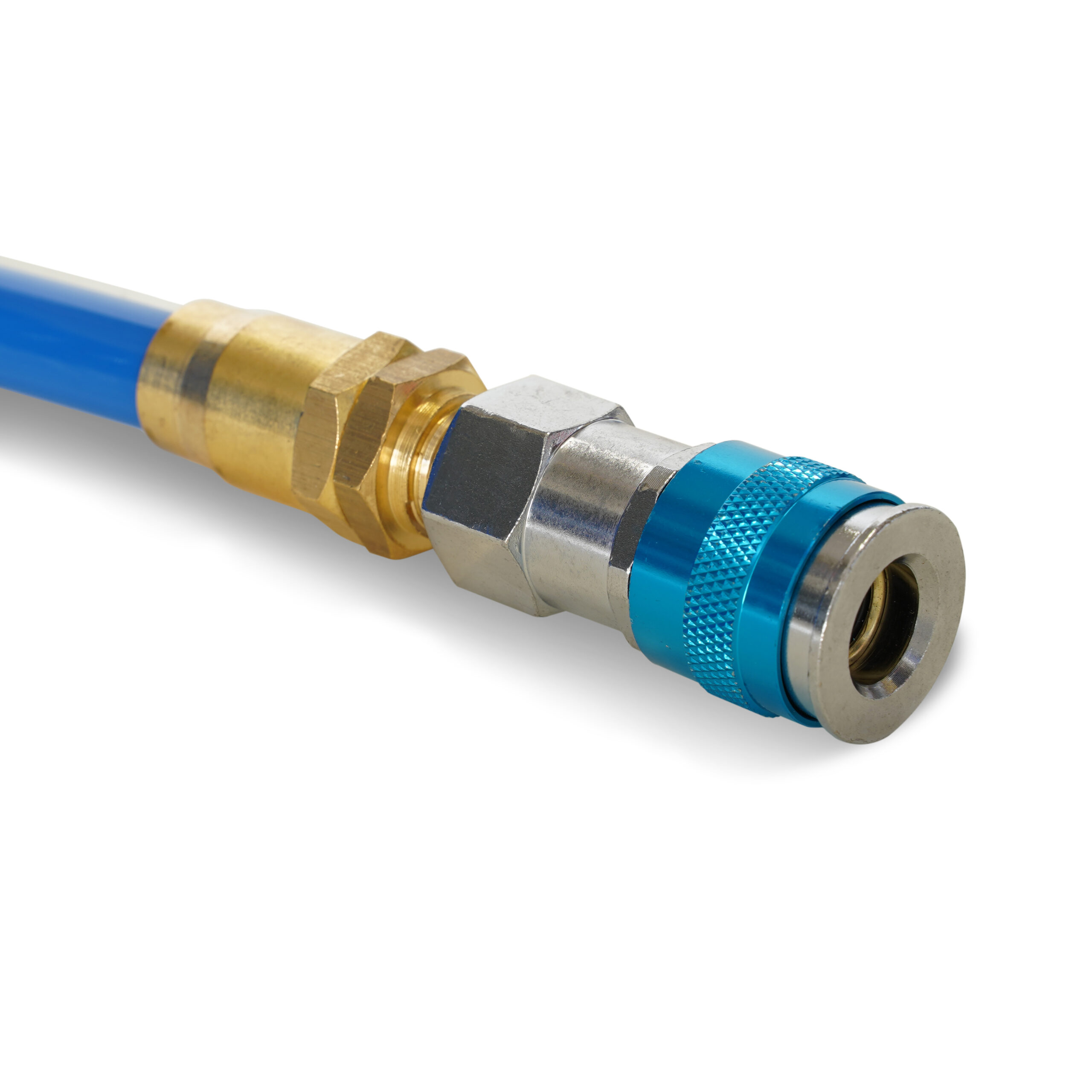 Get power to your pneumatic tools anywhere in your garage or workshop with the STEELMAN 50043-WMQ-IND 15-Foot Coiled 3/8-Inch ID Air Hose with Reuseable 1/4-Inch NPT Brass and Quick Connect Fittings. This compact, coiled hose is made from premium abrasion resistant polyurethane that easily outmatches rubber and nylon for wear resistance which comes in handy when working around unfinished or bare concrete floors. Highly kink resistant, the tubing also withstands twisting or crushing making it ideal for use in a range of situations from automotive shops to industrial work. The hose is 25% lighter than equivalent rubber hoses making it easier to handle with less effort and can withstand working compressed air pressures of up to 100 PSI. The reuseable brass fittings come pre-attached to the hose and easily connect to 1/4-inch NPT quick connects, adapters, and compressors. For added accessibility and utility a universal AMT style quick connect coupler comes attached at one end and an automotive T style quick connect plug on the other so you can get plugged in and powered up right out of the package.