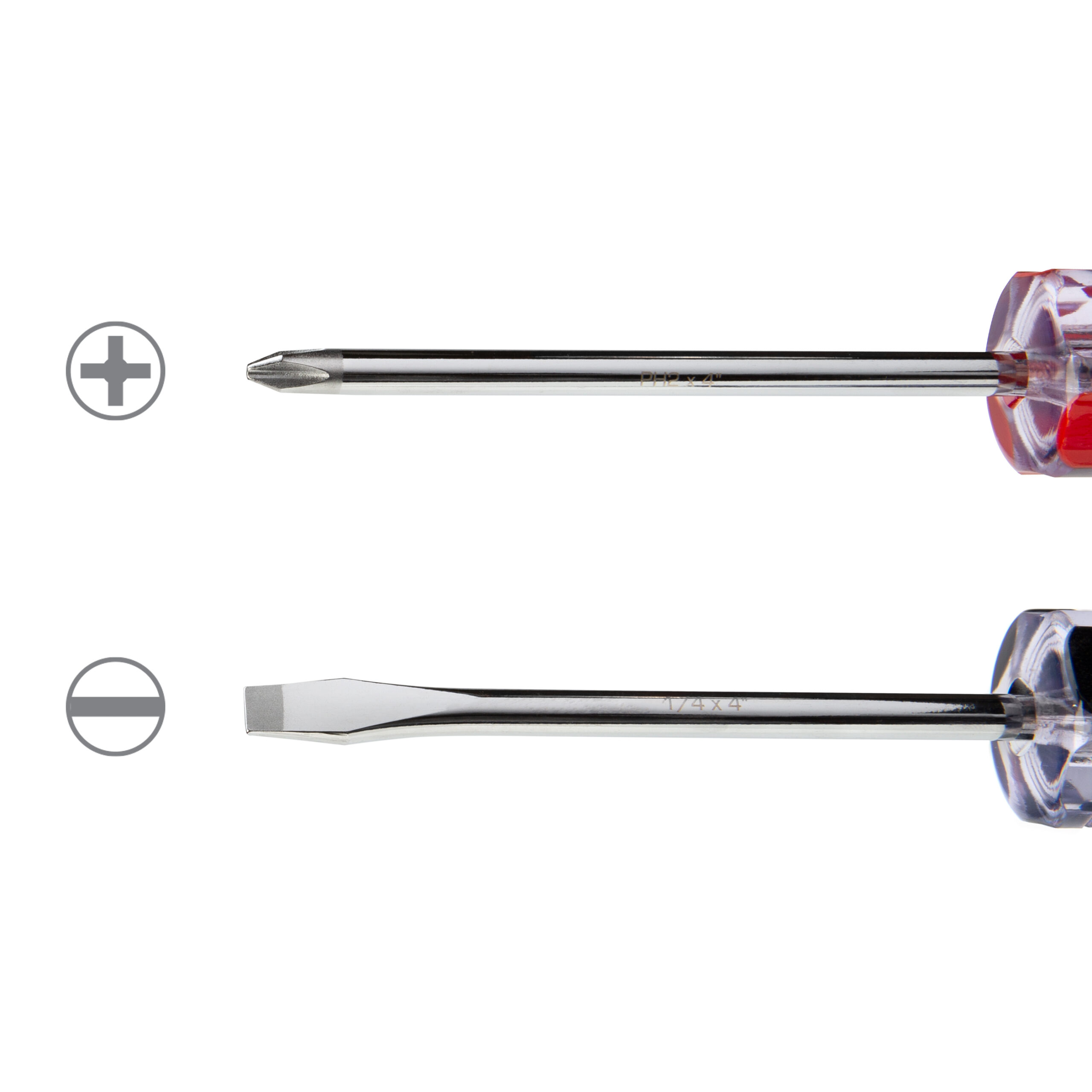 From cabinets, lighting fixtures, outlets, and toys around the house to cars, trucks, and other projects in the workshop or garage there is constantly something in need of repair. The STEELMAN 42051 16-Piece Clear Fluted Handle Screwdriver Set contains a wide selection of the most commonly used Phillips and slotted/flat head screwdrivers as well as a few specialty tools. These general purpose screwdrivers have a durable heat-treated chrome-vanadium steel shaft with a fluted, clear PVC handle while each of the specialty drivers is made of the same heat treated steel just without the PVC handle. Magnetic tips on each of the traditional style screwdrivers help take the frustration out of working with screws in recessed or confined areas. A polished chrome plating on the screwdriver shafts and specialty tools is rust and corrosion resistant while the molded PVC handle is chemical and solvent resistant allowing the tool to stand up to heavy-duty use while being easy to wipe clean. The handled drivers each have a tip type icon and colored strip on the handle help make identification easy with Phillips style tips sporting a red color and slotted sporting black. Set includes seven slotted head screwdrivers sized 1/4-inch x 1.5-inch, 1/8-inch x 3-inch, 3/16-inch x 3-inch, 3/16-inch x 4-inch, 1/4-inch x 4-inch, 1/4-inch x 6-inch, and 5/16-inch x 6-inch and six Phillips head screwdrivers sized PH2 x 1.5-inch, PH0 x 3-inch, PH1 x 3-inch, PH2 x 4-inch, and PH2 x 6-inch, and PH3 x 6-inch. Also included are two offset drivers sized PH1 x 3/16-inch slotted and PH2 x 1/4-inch slotted and a 4-way slotted keychain screwdriver.