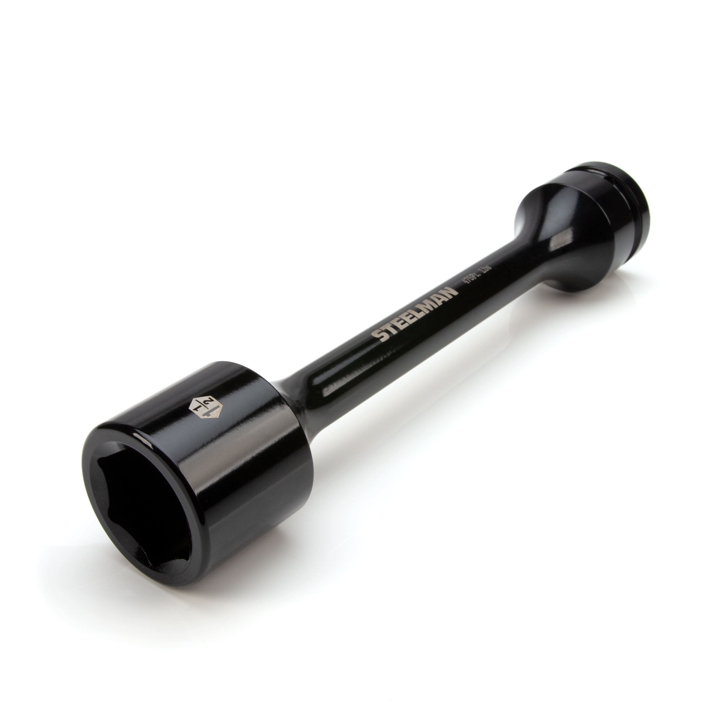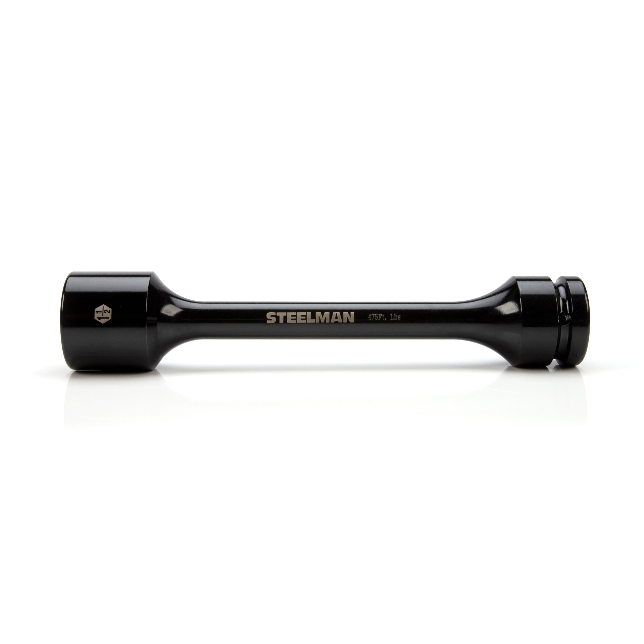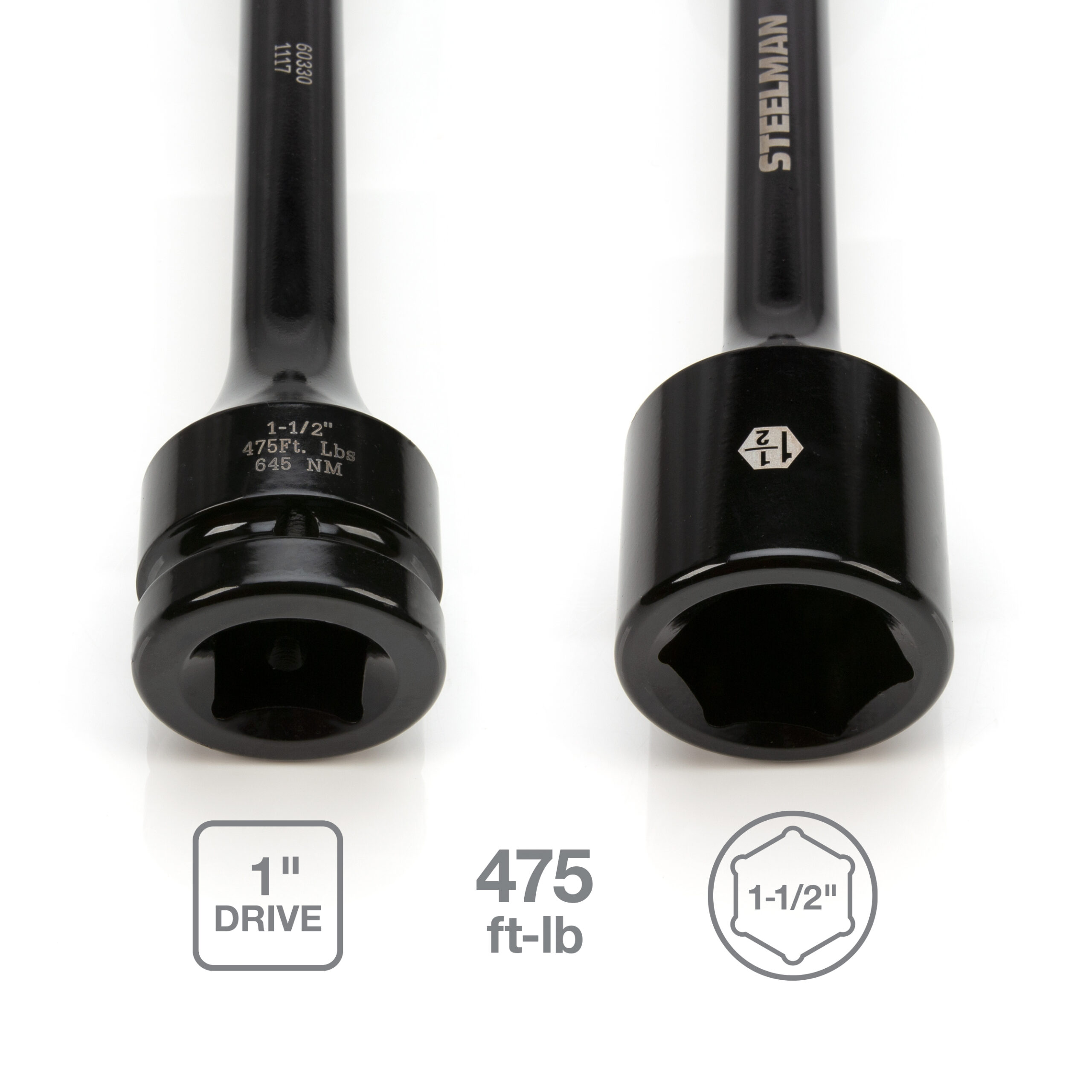Protect your wheels, wheel studs, and brake rotors with this STEELMAN torque stick. The STEELMAN 60330 475 ft-lb 1-Inch Drive x 1-1/2-Inch Torque Stick is designed to prevent damage to wheels, studs, and brake rotors by reducing the risk of over-tightening lug nuts which can result in sheared stud bolts, rounded lug nuts, and warped rotors. This stick measures 11-15/16-inches long and has a 1-1/2-inch socket on the end. When used with a 1-inch drive electric or pneumatic impact wrench it will limit the effective output of the wrench to 475 ft-lb of torque and anything above that will cause the extension to flex and absorb the extra impact. This torque stick is made of resilient chrome molybdenum (Chromoly) steel that has a black powder coat to make it easy to pick out among other tools or in a crowded toolbox.