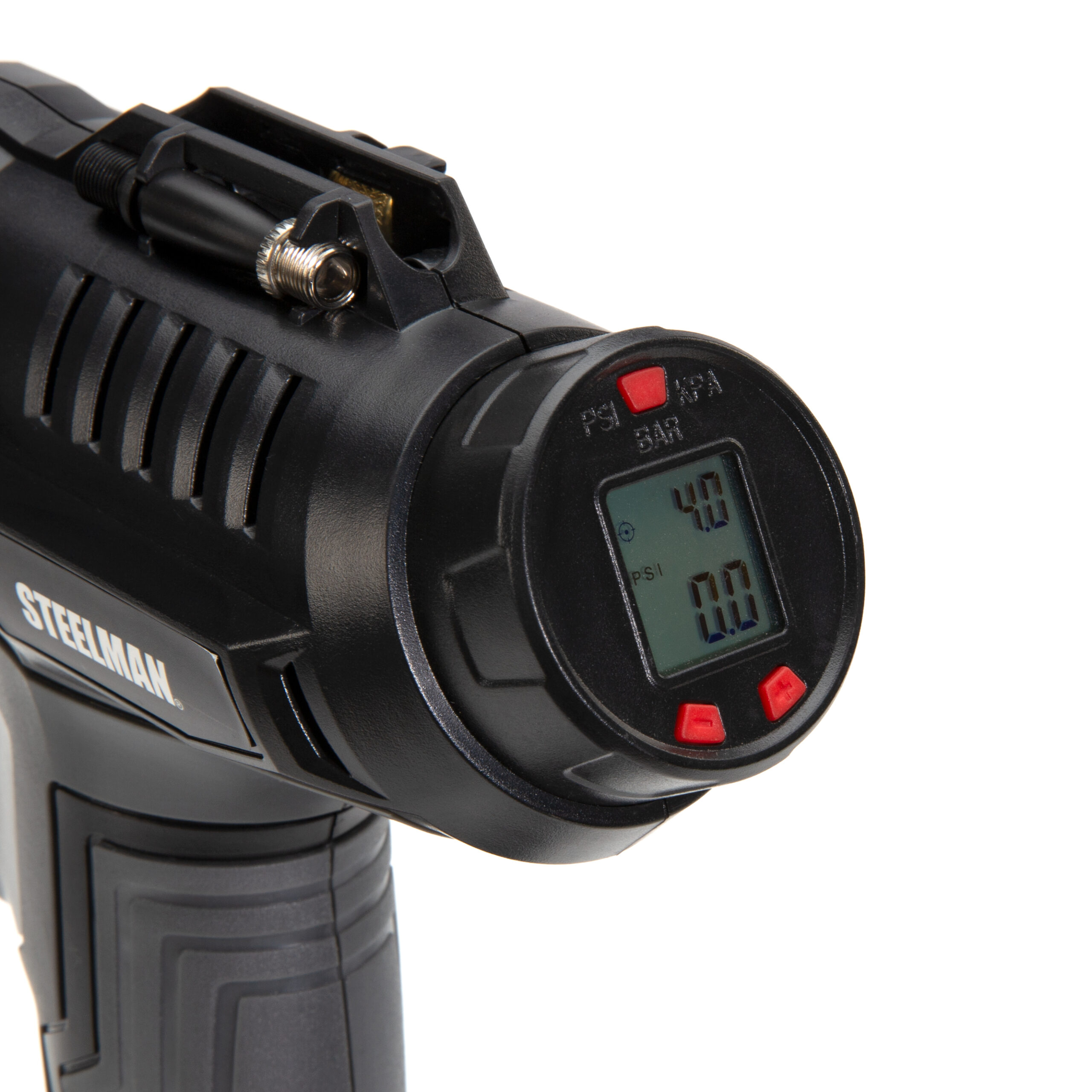 Inflate tires around the repair shop, in the agricultural field or along the roadside with equal ease using the STEELMAN 60867 20V Cordless Tire Inflator with 19-Inch Braided Hose. This handy tool features a compact yet powerful brushed motor that can produce up to 160 PSI to rapidly inflate tires on most passenger vehicles, trucks, motorcycles, off-road ATVs, tractors, and other vehicles and more. The easy to read digital gauge includes an automatic shut-off function that can be set to prevent damaging over-inflation. The 19-inch long braided air hose is long enough to reach recessed valves on dual wheel vehicles. To bring added versatility the inflator includes and has on-board storage for an adapter to fit presta bicycle valves, a ball needle adapter, and a balloon or blower nozzle. An LED built into the base of the handle helps illuminate work areas in low light situations. Designed to use the same 20V battery packs as other STEELMAN cordless power tools (sold separately, see STEELMAN 60865 and 60866 for a battery and charger).