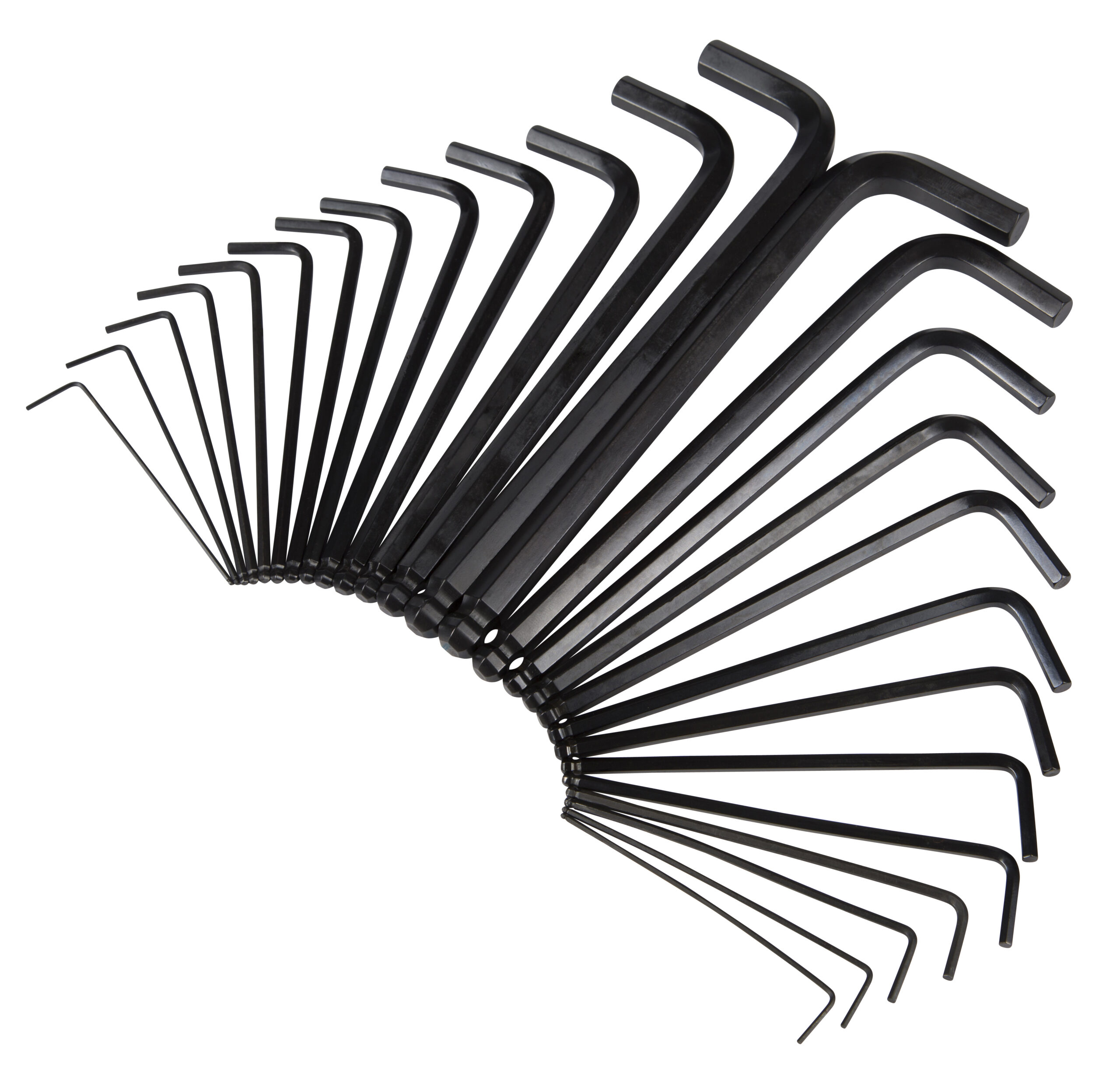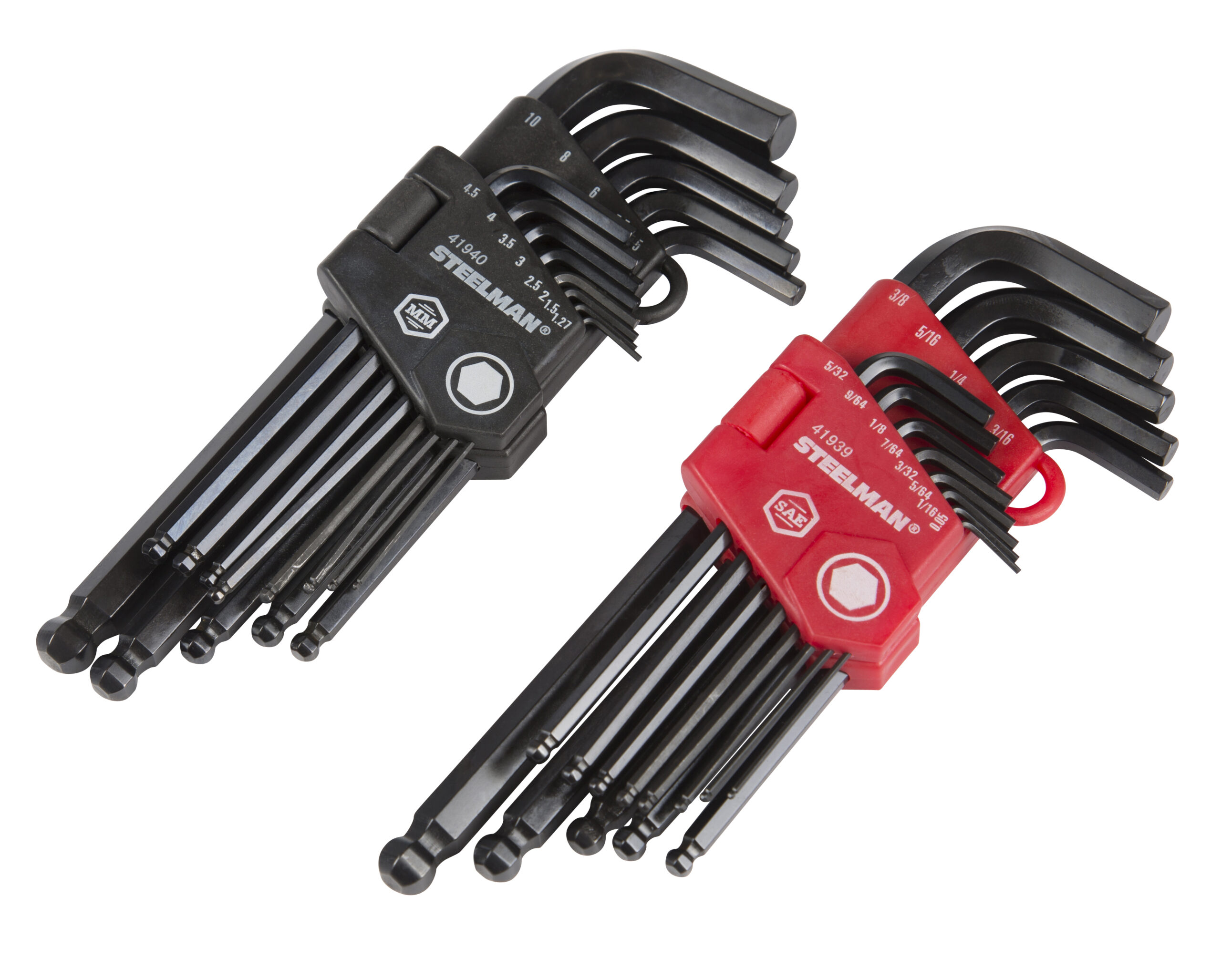The Steelman Ball End Hex Key Wrench Combo Set features 26 of the most common metric and standard sizes used to remove and install socket/allen headed fasteners on all of your home, automotive, and hobby projects. These wrenches are made with high-strength, heat-treated chrome vanadium steel which is then coated with a protective black oxide finish. Each wrench has a specially machined, ball-shaped end to make it easier to insert the tool into hex cap screws, bolts, and fasteners in confined areas and their extended length driver shafts make it easy to reach into hard-to-access spaces. Their double-ended design allows you to choose between long reach and high torque for the job at hand. The hinged storage cases are color-coded and clearly labeled, making it easy to decide which type, metric or standard, and size of wrench you need.