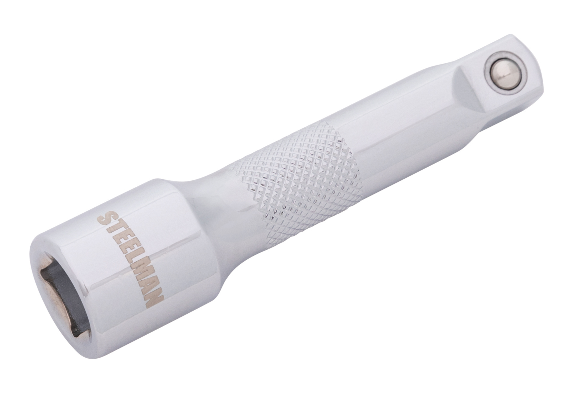 Few things are as aggravating as having to reach in after a nut or bolt and have it be just out of reach but the STEELMAN 78182 3/8-Inch Drive 3-Inch Extension Bar can help. Made to be compatible with any 3/8-inch drive ratchet, torque wrench, adapter, or socket, this tool is made from high strength, heat-treated chrome vanadium steel for long lasting durability. A polished chrome plating provides rust and corrosion resistance in addition to being easy to wipe clean of dirt and grime. The shaft of the extension has a knurled texture to give a secure grip when used to hand start nuts and bolts. The drive end of the extension features a ball detent recess to hold it tightly onto ratchets, breaker bars, torque wrenches, and adapters. The tip of the bar has a spring loaded detent ball to allow it to clip into and securely hold to attached sockets or even other extension bars. Designed to meet or exceed ASME tool standards this extension is covered by a limited lifetime warranty.