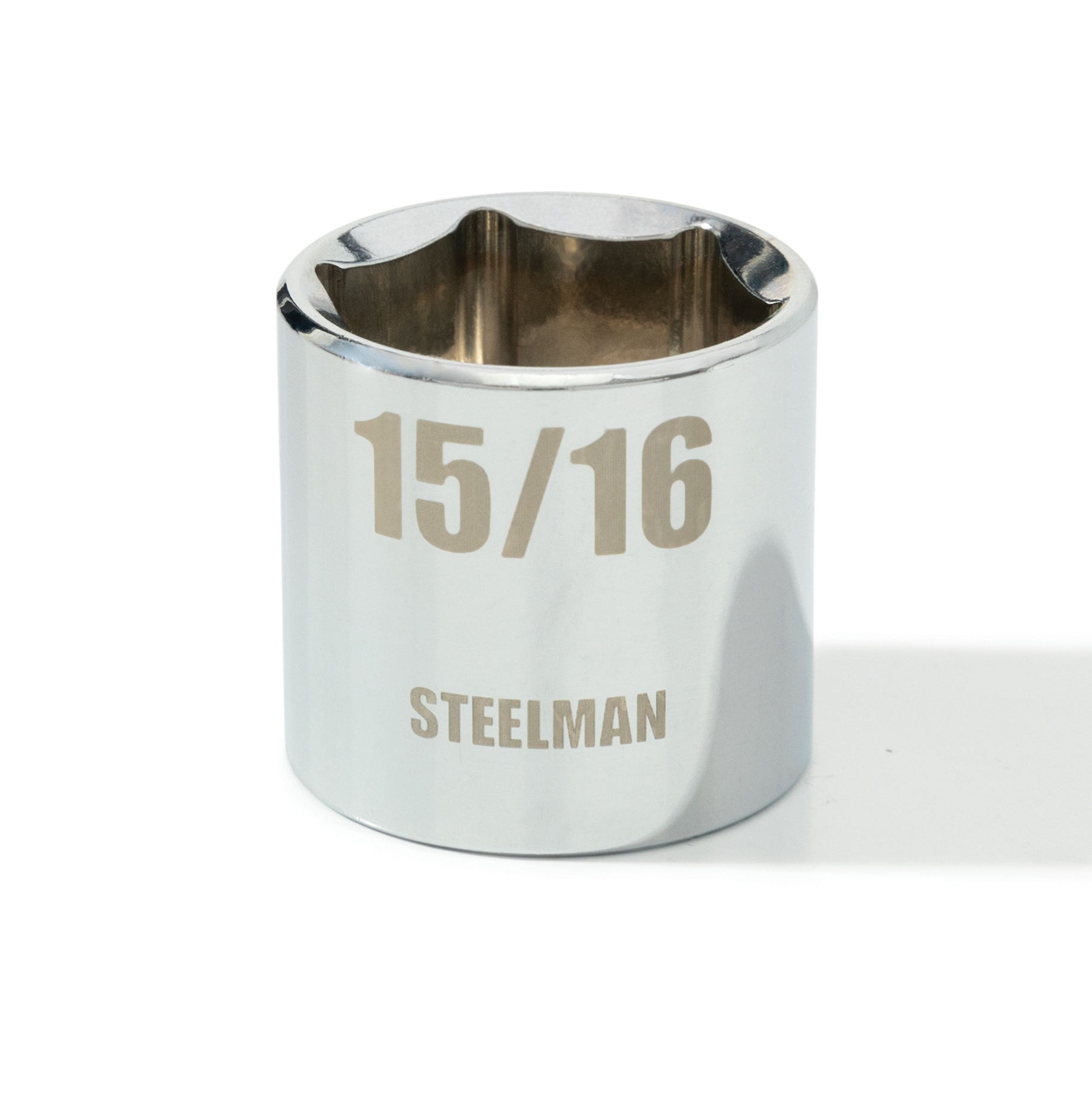 If you need a socket you can depend on, be sure to find a home in your tool box for the STEELMAN 78213 3/8-Inch Drive x 15/16-Inch Shallow 6-Point SAE Socket. Constructed of durable heavy-duty chrome vanadium steel, this socket has the strength required for high torque jobs and will fit onto any 3/8-inch drive ratchet, torque wrench, extension bar, or adapter. The socket features a rust and corrosion resistant high polish chrome finish that not only looks good but is easy to wipe clean of dirt, oil, and grime. The socket’s 6-point design grips the sides of fasteners and not the corners, reducing wear and the chance of slippage or rounding the fastener. Easy to read size markings are laser etched onto the steel making it simple to identify the socket you need without the worry that the markings will wear away or rub off with use. Rated to meet or exceed ANSI / ASME performance requirements for hand tools, this socket can handle tough use, whether it is in professional garage fixing car engines or at home repairing furniture and appliances.