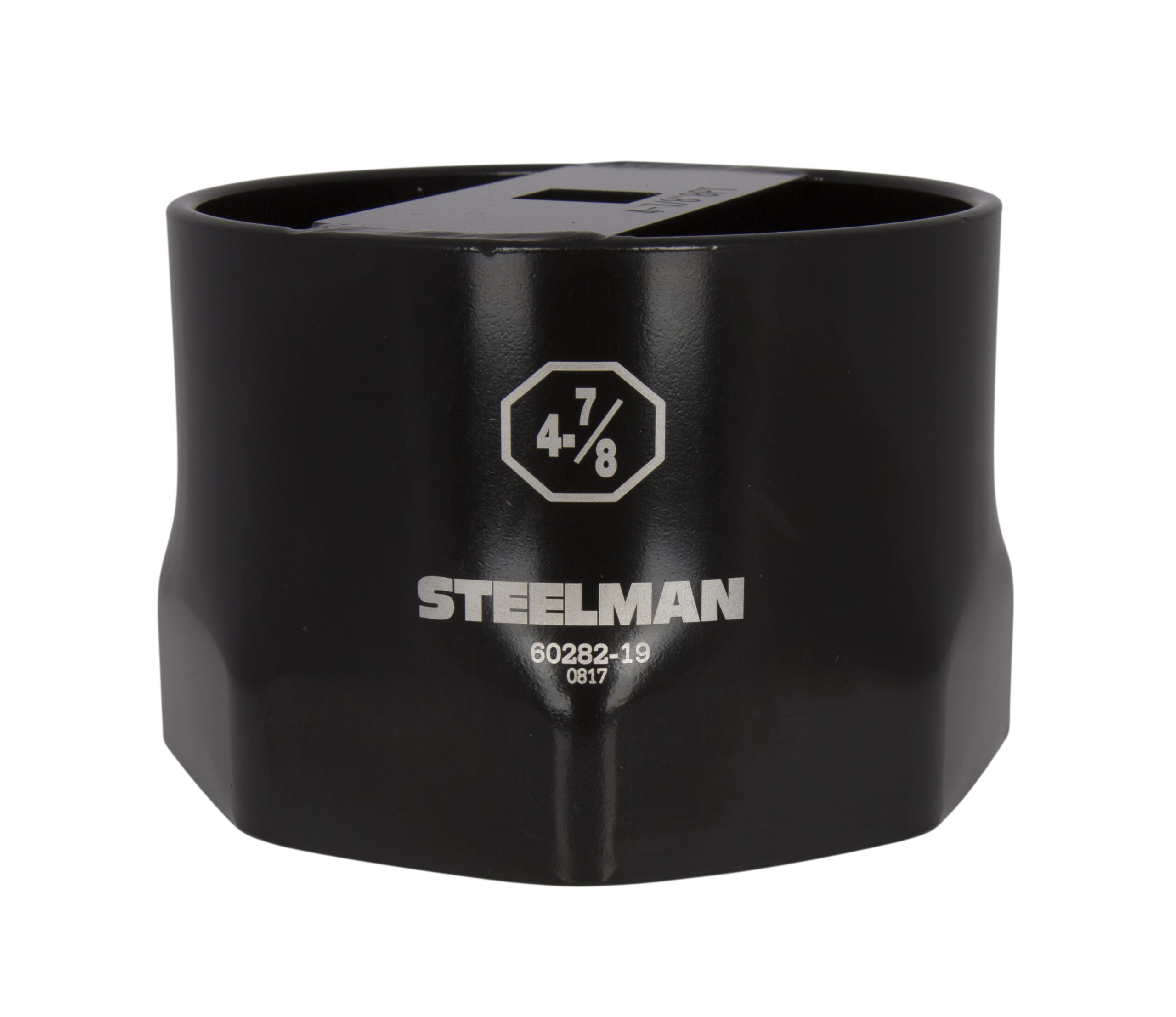 Here to help take the strain out of the arduous task of removing and installing wheel bearing nuts and other large industrial bolts and fasteners is the STEELMAN 60282-19 4-7/8-Inch 8-Point Locknut Socket. Designed in 8-point style, this heavy-duty socket grips the sides of fasteners instead of the corners to reduce the chance of premature fastener wear and rounding. Made of high strength carbon steel for long lasting durability, this tool has an industrial strength black powder coat that won’t easily chip off or fade. Strong and resilient, this socket is constructed to be able to withstand and deliver up to 400 ft-lb of torque to sockets without deforming. Easy to read size callouts and markings are laser etched into the steel and won’t rub off. Socket works with any hand operated 3/4-inch drive ratchet, extension, adapter, or torque wrench. This tool is not intended for use with power or impact wrenches / tools, so MANUAL use only.