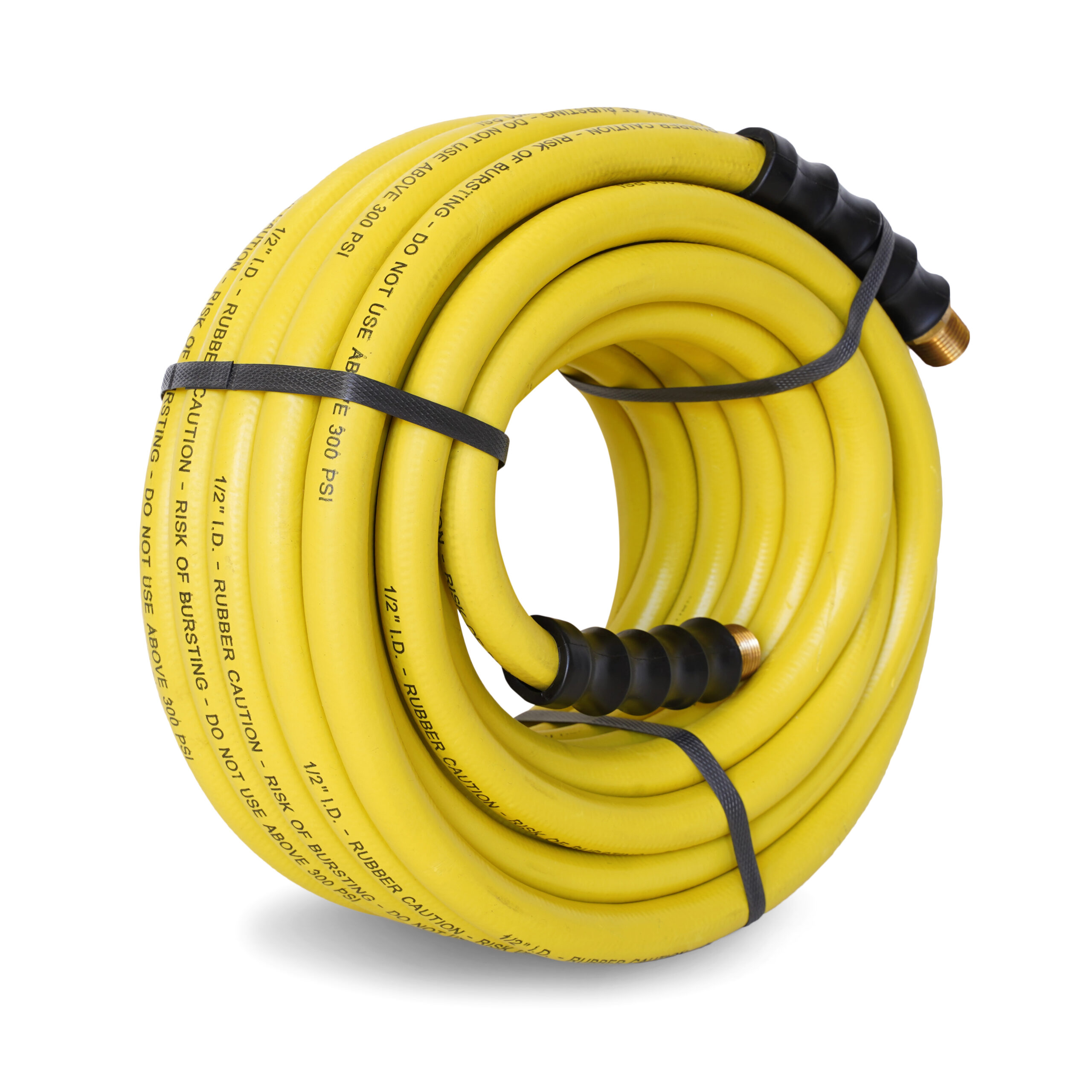 Bring maximum power to your pneumatic tools with the STEELMAN 96846-IND 50-Foot Long Rubber 1/2-Inch ID Hose Reel Replacement Air Hose with 1/2-Inch NPT Brass Fittings. Designed for use as an individual pneumatic hose or as a replacement for damaged hoses used in STEELMAN 96840 and 96840-IND air hose reels, this hose is ideal for a range of professional work and personal project applications. Made of premium, fiber-reinforced rubber, this hose resists kinking and has excellent abrasion resistance making it perfect for use in workshops and garages with concrete floors. Rated for a working pressure of up to 300 PSI, this hose can easily handle normal shop pressures whether carrying compressed air or water without fear of unexpected ruptures. The pre-attached brass fittings have 3/8-inch NPT male threads for easy attachment to additional hoses, adapters, and connectors and for added protection on these stress points, each end of the hose features a bend protector.