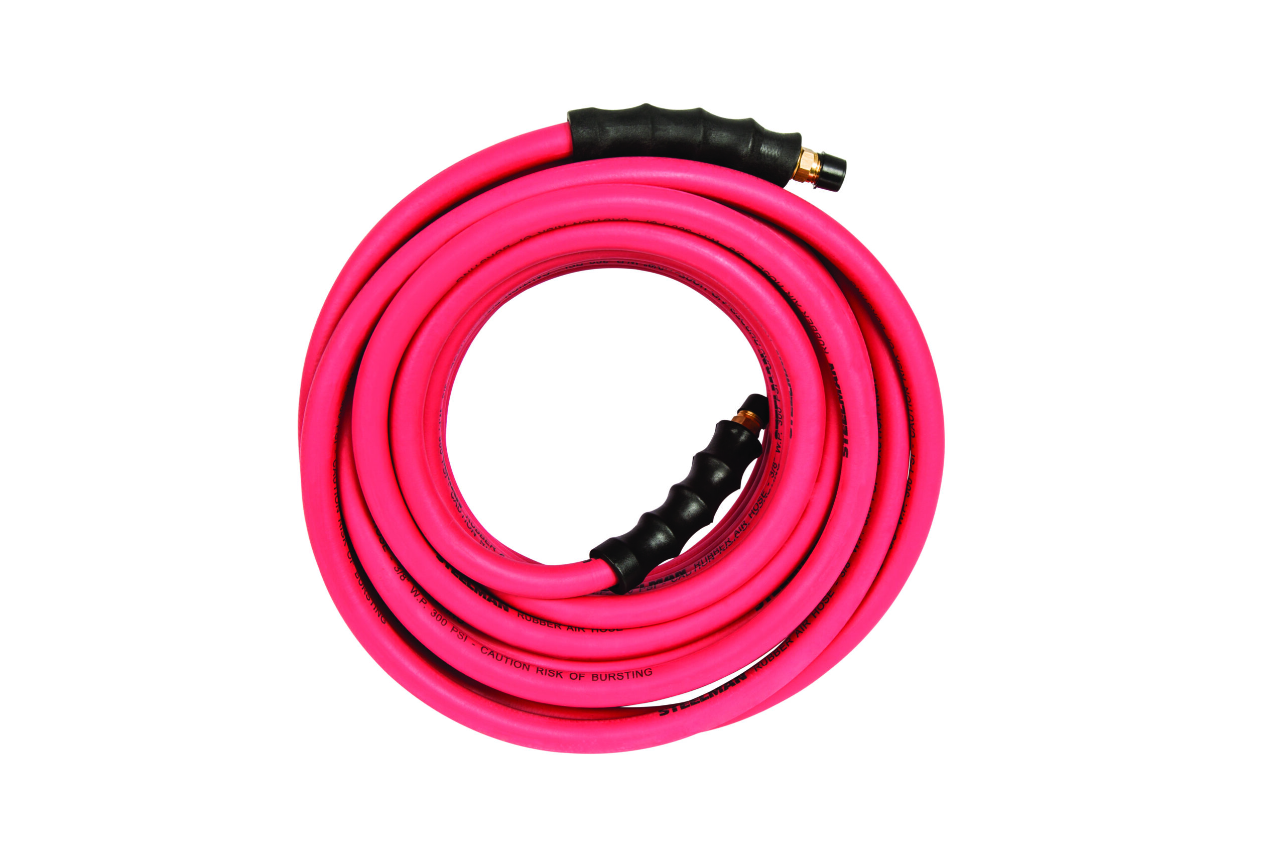 Bring maximum power to your pneumatic tools with the STEELMAN 60395 50-Foot 3/8-Inch ID Rubber Air Hose with 1/4-Inch NPT Brass Fittings. Made of premium, polyester fiber-reinforced rubber, this hose resists kinking and has excellent abrasion resistance making it perfect for use in workshops and garages with concrete floors. The hose’s rubber construction is also resistant to damage caused by most shop chemicals and features an oil-resistant core tube that meets RMA class C oil resistance standards. The ozone resistant hose is also able to remain flexible in extreme operating temperatures ranging from -40F to 180F. Rated for a working pressure of up to 300 PSI (1200 PSI burst pressure), this hose can easily handle normal pneumatic shop tool pressures without fear of unexpected ruptures. The pre-attached brass fittings have 1/4-inch NPT male threads for easy attachment to additional hoses, adapters, and connectors.