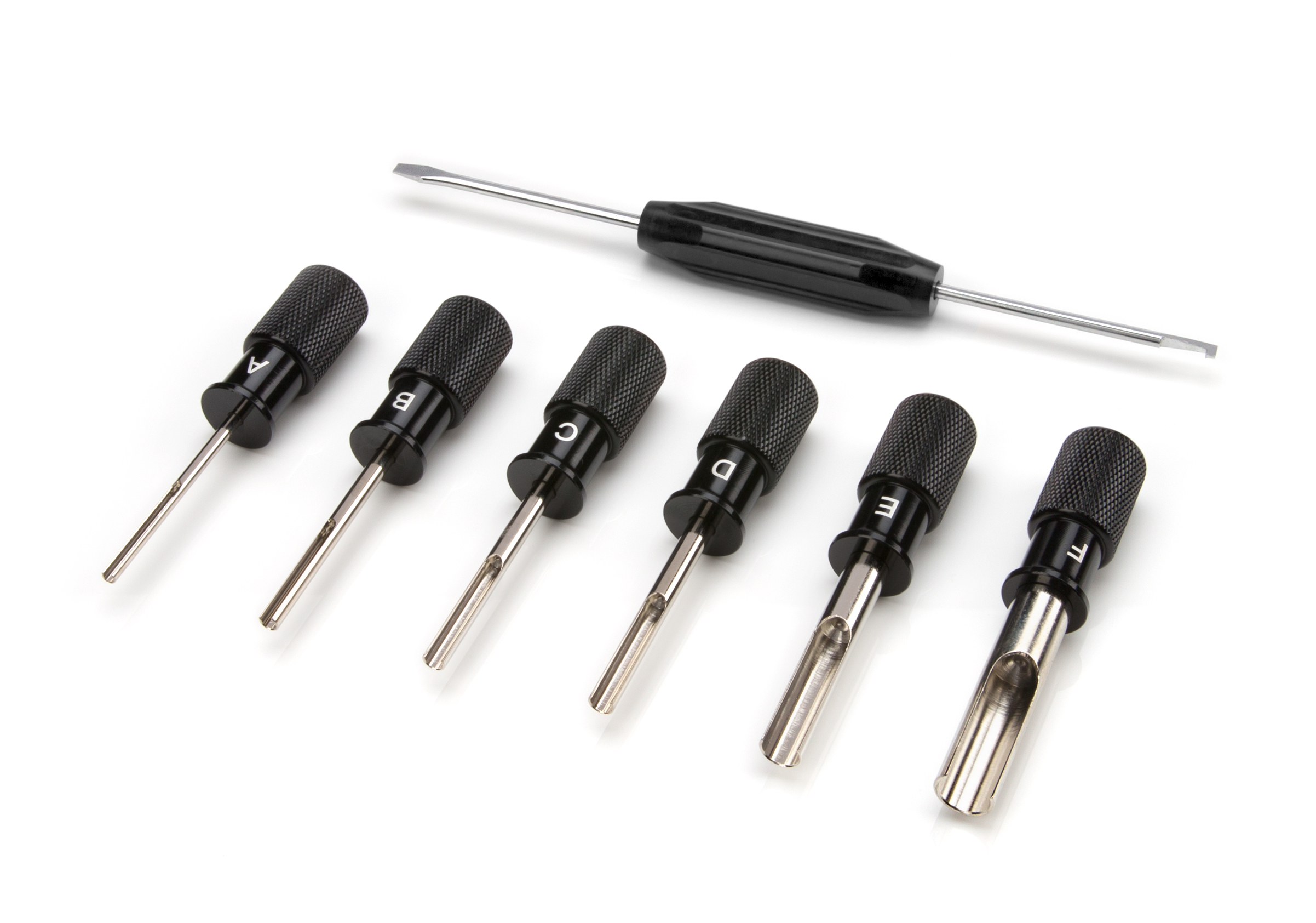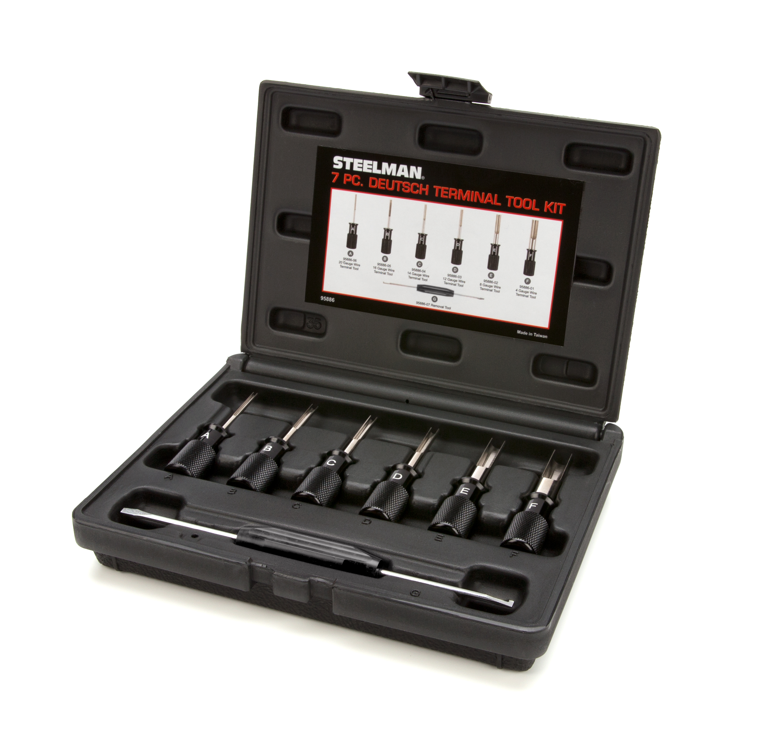 Deutsch terminals are designed to be environmentally sealed and hold tight in extreme conditions above and beyond standard automotive electrical terminals so when it comes time to replace or repair those terminals or wires, special tools are needed to disassemble them. The STEELMAN 95886 7-Piece Deutsch Terminal Tool Kit was designed to do just that, to let you separate the wires from their terminals without causing damage to either. Made with non-magnetic steel tips mounted to knurled black anodized aluminum handles these connector pin release tools take the aggravation out of terminal repair. The tools included in this kit will work on terminals found in a wide variety vehicles and equipment including cars, trucks, motorcycles, heavy-duty trucks, construction and agricultural equipment, and some outboard motors. A convenient application reference chart listing tool tips, measurements, and compatible manufacturers is included inside the blow-molded plastic storage case. The kit includes tools to fit 4, 8, 12, 14, 16, and 20 gauge wire terminals and a combination wedge/removal tool and flat tip screwdriver. *Actual handle color for combination wedge / removal tool may vary from images shown*