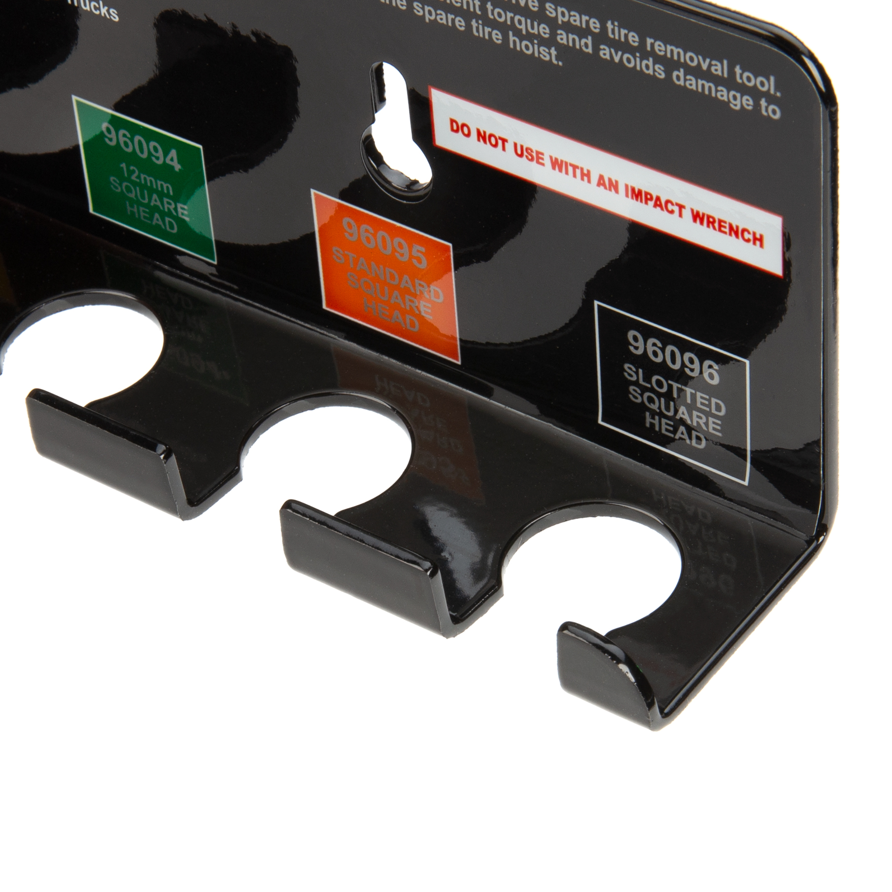 Keep tools organized with the STEELMAN 96097 7-Slot Spare Tire Tool Wall Mount. Designed for use in storing STEELMAN cradle-suspended spare tire tools but useable with any similarly shaped tool it is made of durable 14 gauge steel and easily mounts to any wall with 2 screws. The rugged black powder coating lasts longer than paint and won’t easily chip or fade while the pre-affixed application chart is a handy reference for which vehicles are serviced by which spare tire tool. The open front design of the organizer means that any stored tool is held by the neck, leaving size callouts, color variations, and other identifiers clearly visible for easy selection. Overall dimensions are 10-1/8-inches wide x 2.5-inches high x 1-3/8-inches deep.