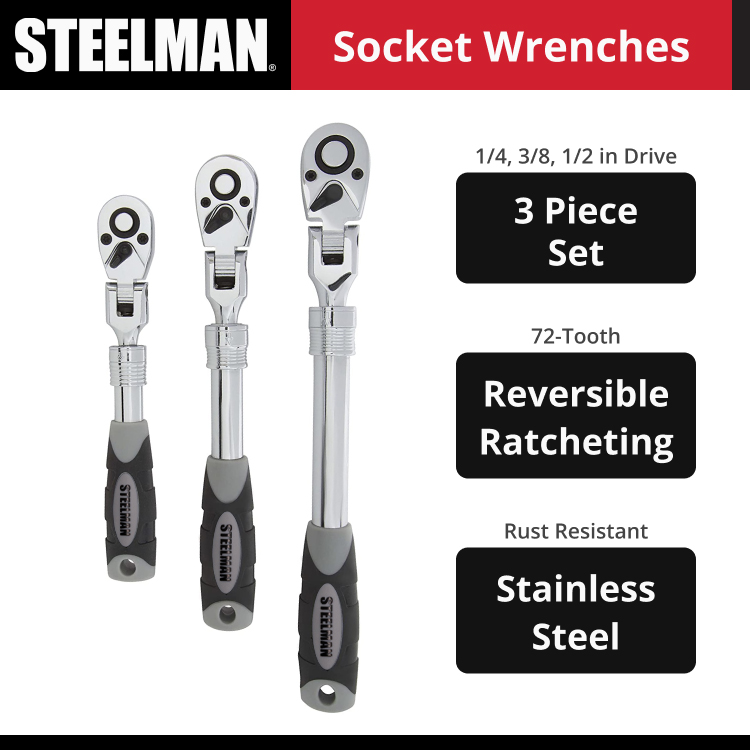 Easily reach and remove those hard to work on fasteners found inside confined spaces like the engine compartments of compact cars with the STEELMAN 96753 Extendable Flex-Head Ratchet Set. This 3-piece set of ratchets have extra long extending handles that give you exceptional reach while simultaneously providing increased leverage. The 1/4-inch drive ratchet extends from 6.75 to 8.75-inches, the 3/8-inch drive ratchet extends from 9.5 to 13.5-inches, and the 1/2-inch drive ratchet extends from 13.5 to 19-inches. Each ratchet head features a 72-tooth reversible ratcheting mechanism that only needs a 5 degree arc to engage from tooth to tooth, letting you do more work in smaller spaces. This mechanism is then mounted to a 180-degree flexible neck that lets you position the ratchet head to the angle you need to work from rather than try to angle and twist yourself to accommodate the tool to the fastener. When finished a quick-release button on the back of the ratchet allows effortless removal of attached sockets and extensions. Made from strong and durable heat-treated chrome-vanadium steel with polypropylene and TPR rubber handles these tools are chemical and corrosion resistant and can easily withstand the rigors of everyday use.