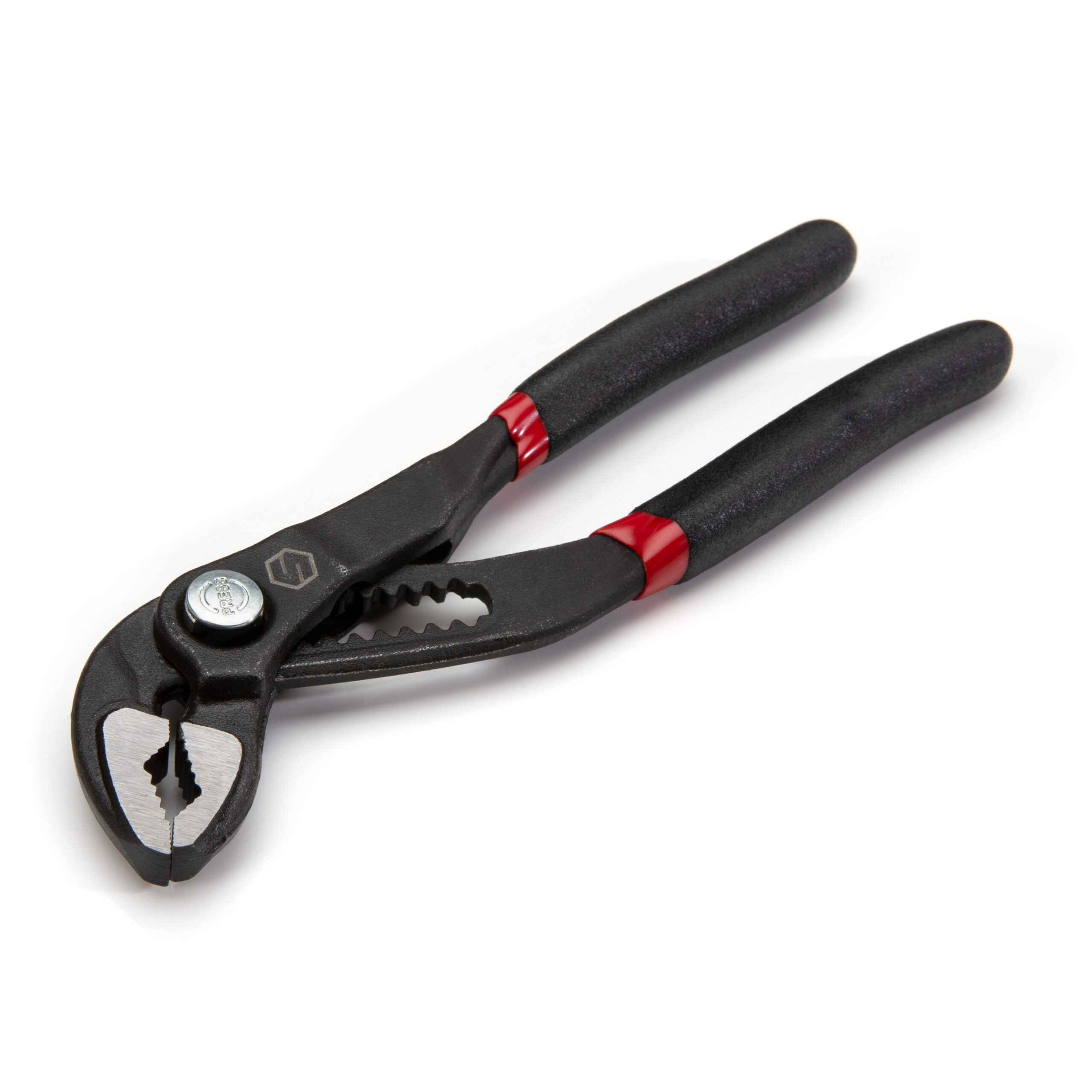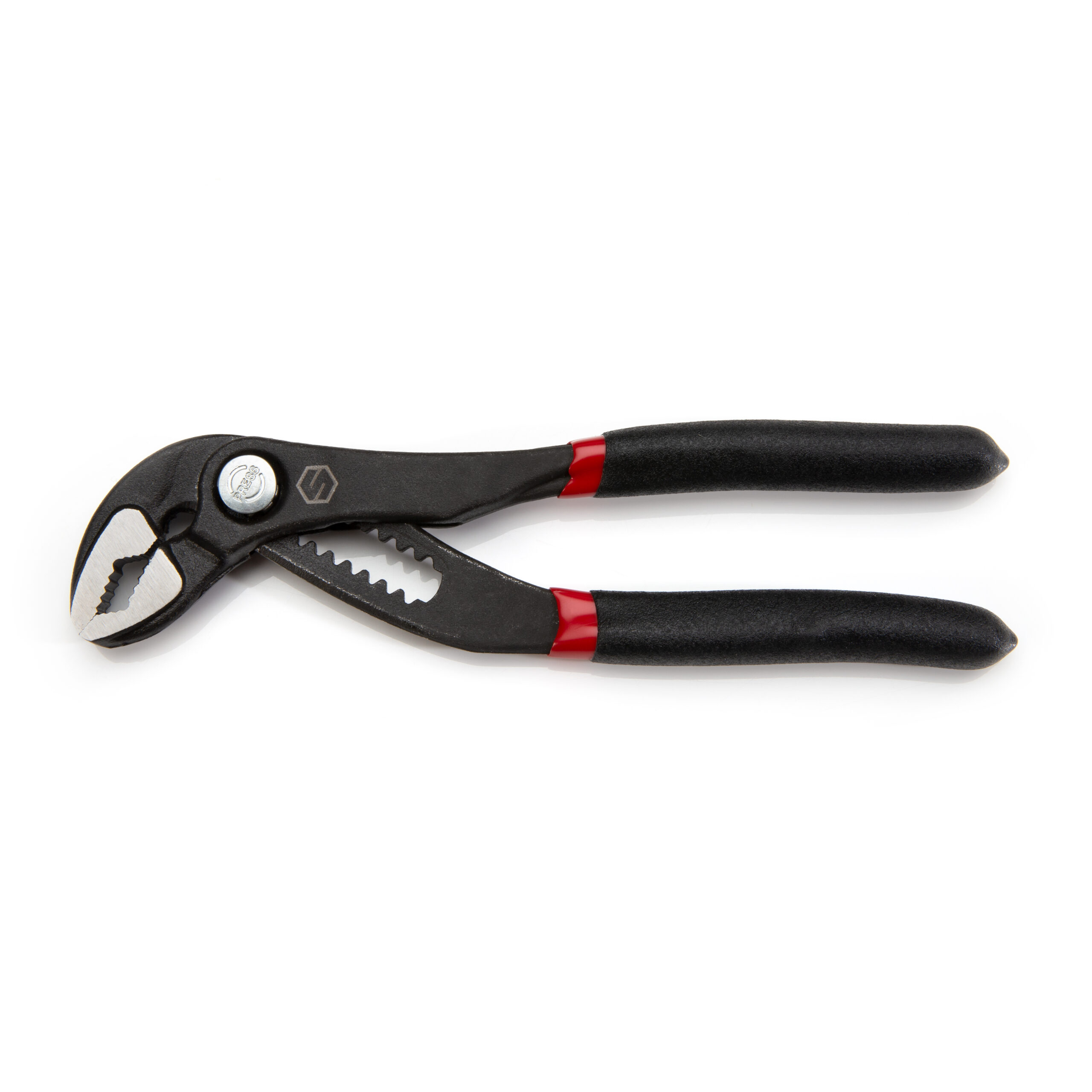 Get a grip in steel, iron and plastic / PVC pipes, hex head bolts, square nuts, and more with a pair of STEELMAN 60943 7-Inch Push Button Adjustable Water Pump Pliers. These 7-inch long, box-joint style adjustable pliers feature a spring loaded push button adjustment design that allows for quick and easy jaw size adjustments without the worry of the tool unintentionally shifting during use or when opening the jaws to their maximum width of 1.5-inches. The V-notch in the jaws helps provide a better grip around odd shapes than a traditional rounded curve or flat jaw design. The machined jaws themselves are also induction hardened to allow them to bite into and grip all kinds of pipe and fastener materials from softer PVC and PP plastics to harder iron, steel, and metal alloys. The protective black phosphate coating helps the tool resist oxidation and corrosion common to tools used around water, coolants, and other chemicals. The double-dipped and cushioned handles have a textured surface to provide a comfortable grip during use even when wet or oily. With a set of STEELMAN pliers in your tool kit, you’ll have the grip you need to get the job done like the pro you are!
