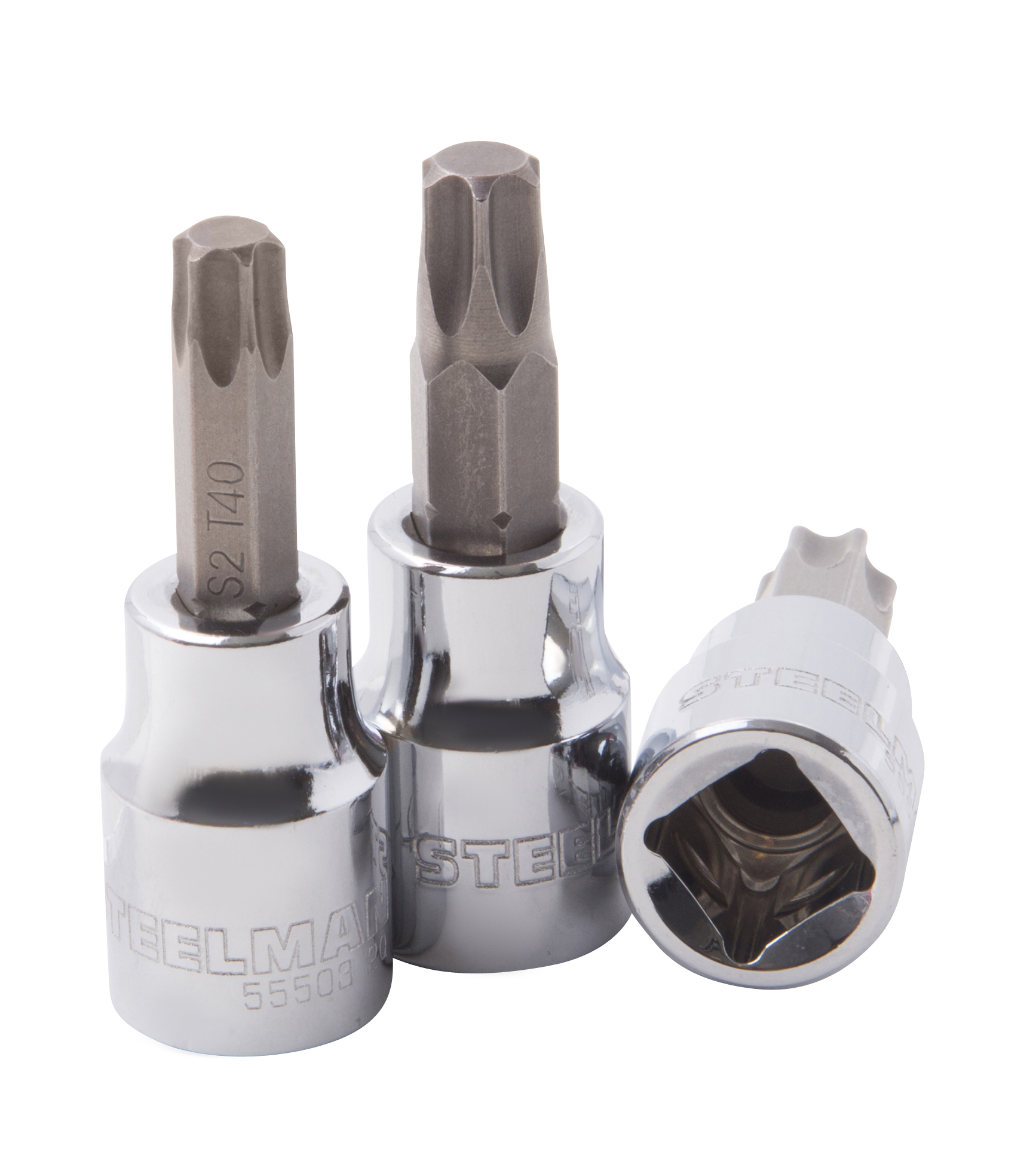Whether you’re working under the dashboard of a car, under the hood of a truck, or just trying to give your motorcycle a tune-up, the STEELMAN 55497 8-Piece 1/4-Inch and 3/8-Inch Drive Star Bit Socket Set will help you get the job done. The rugged star / Torx bit heads are machined from high-strength S2 steel to prevent them twisting and deforming under high loads. The heads are permanently set into durable chrome vanadium steel sockets, each with a rust and corrosion resistant, high polish chrome finish. For easy identification, each socket has easy to read size markings hard stamped into the steel that won’t wear or fade away. This set includes five 1/4-inch drive sockets for finer, more precision jobs, and three 3/8-inch sockets to help provide the necessary torque to deal with even the most stubborn fasteners. The 1/4-inch drive sockets have T15, T20, T25, T27, and T30 size heads while the 3/8-inch drive sockets have T40, T45, and T50 size heads. To keep them securely attached to ratchets, extension bars, and adapters, each socket features a ball detent recess on the drive end and to ensure maximum torque transfer, the drive ends also have corner recesses that transmit applied force to the flats instead of focusing on the corners which can lead to slippage, rounding, and premature tool failure. Designed and constructed to meet or exceed ASME tool performance standards, these tools can stand up to the rigors of any professional workshop while being just as handy in the home mechanic’s garage.