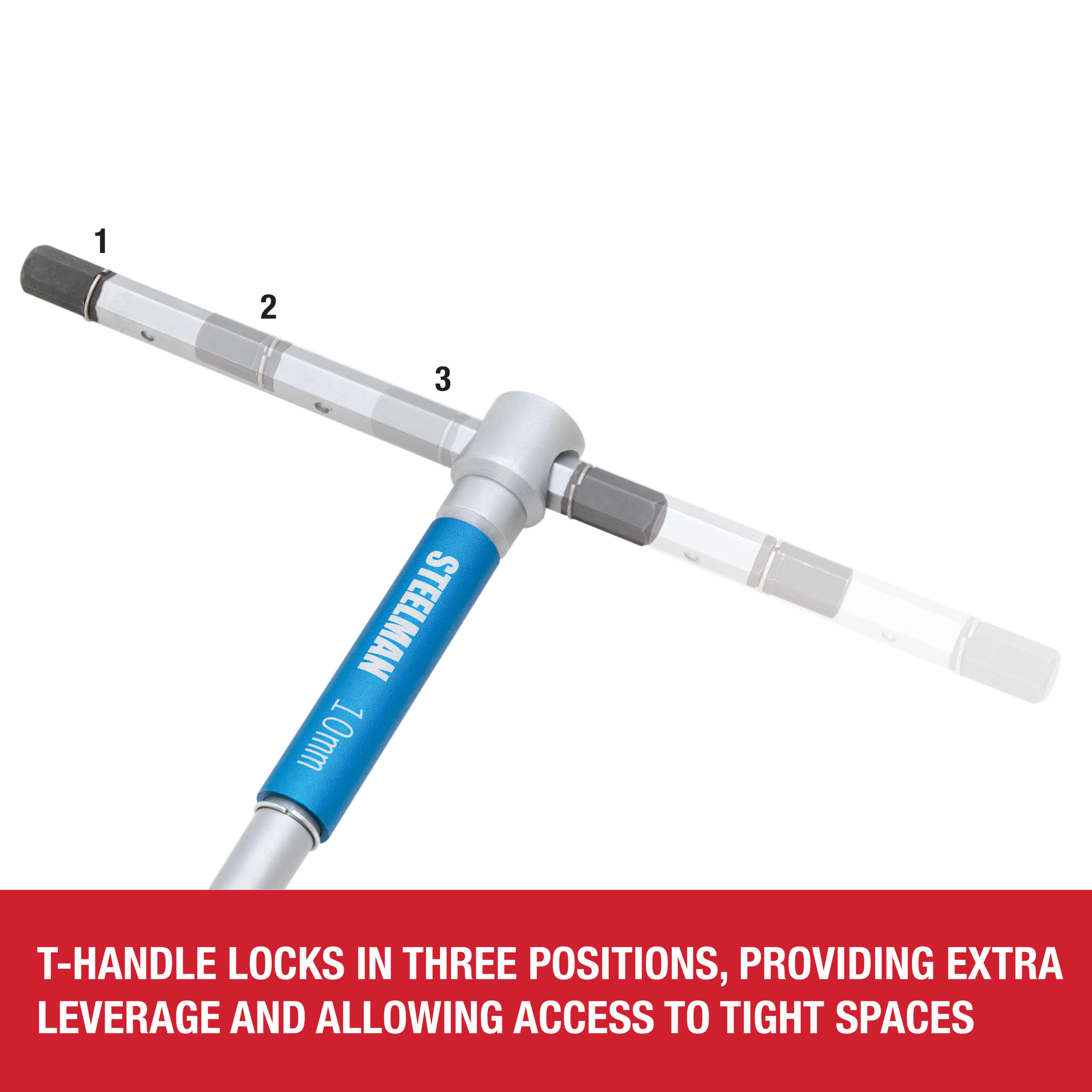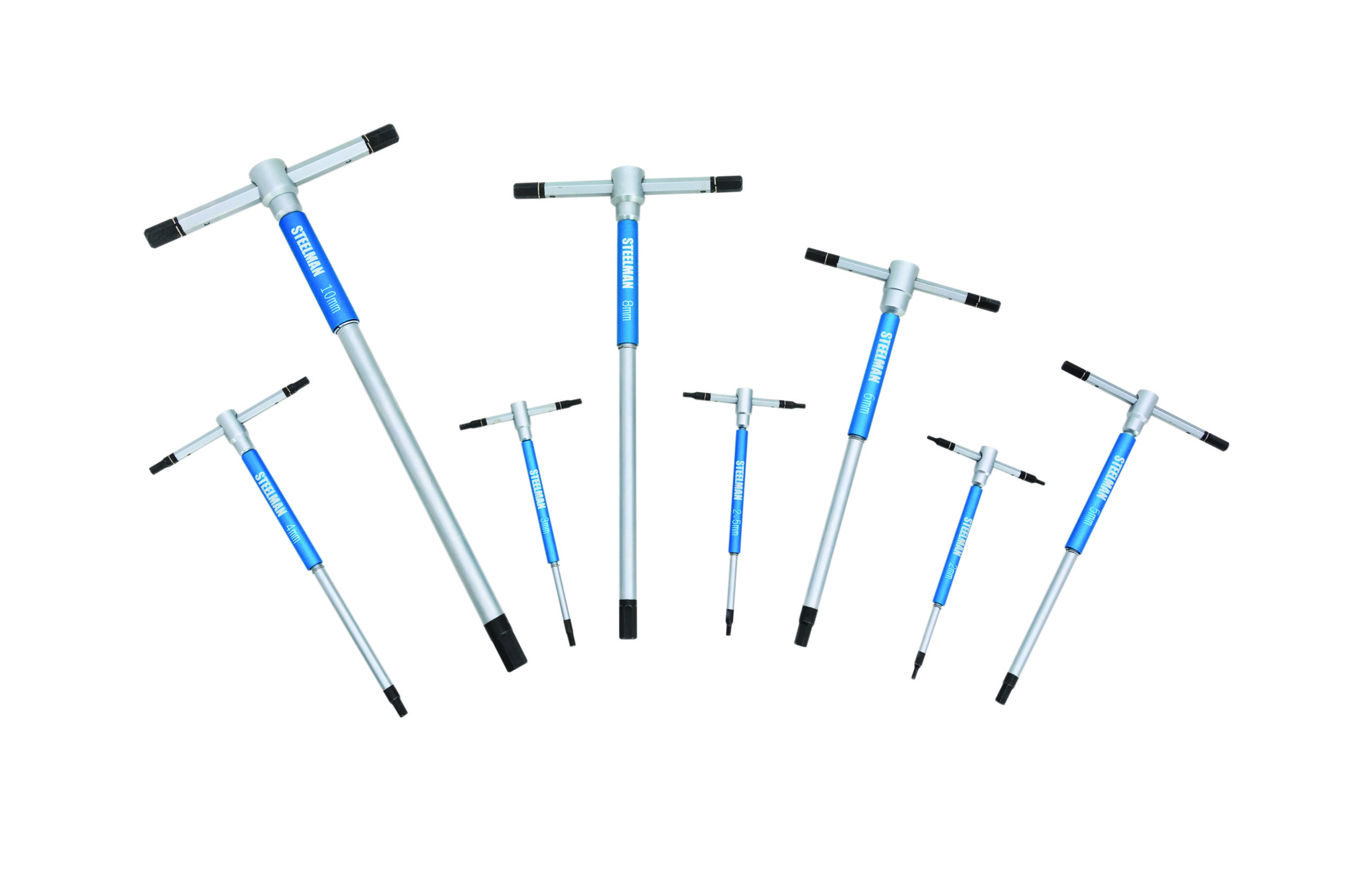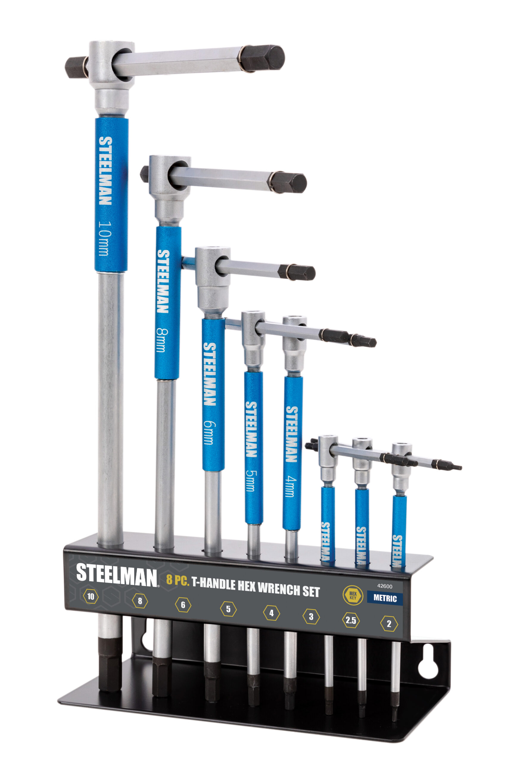 Take on metric hex head fasteners with increased speed using the STEELMAN 42600 8-Piece Sliding T-Handle Metric Hex Key Set. These wrenches come equipped with a sliding T-handle end that lets you slide the handle to one side for increased leverage against stuck or sized fasteners and screws. When tightening or loosening fasteners, a free-spinning sleeve on the main tool shaft lets you quickly spin the tool without having to reposition your hand, letting you work with increased speed and efficiency. This set includes the following metric hex key sizes: 2mm, 2.5mm, 3mm, 4mm, 5mm, 6mm, 8mm, and 10mm. When not in use, the included storage rack helps keep your wrenches organized and easily visible for fast selection and access.