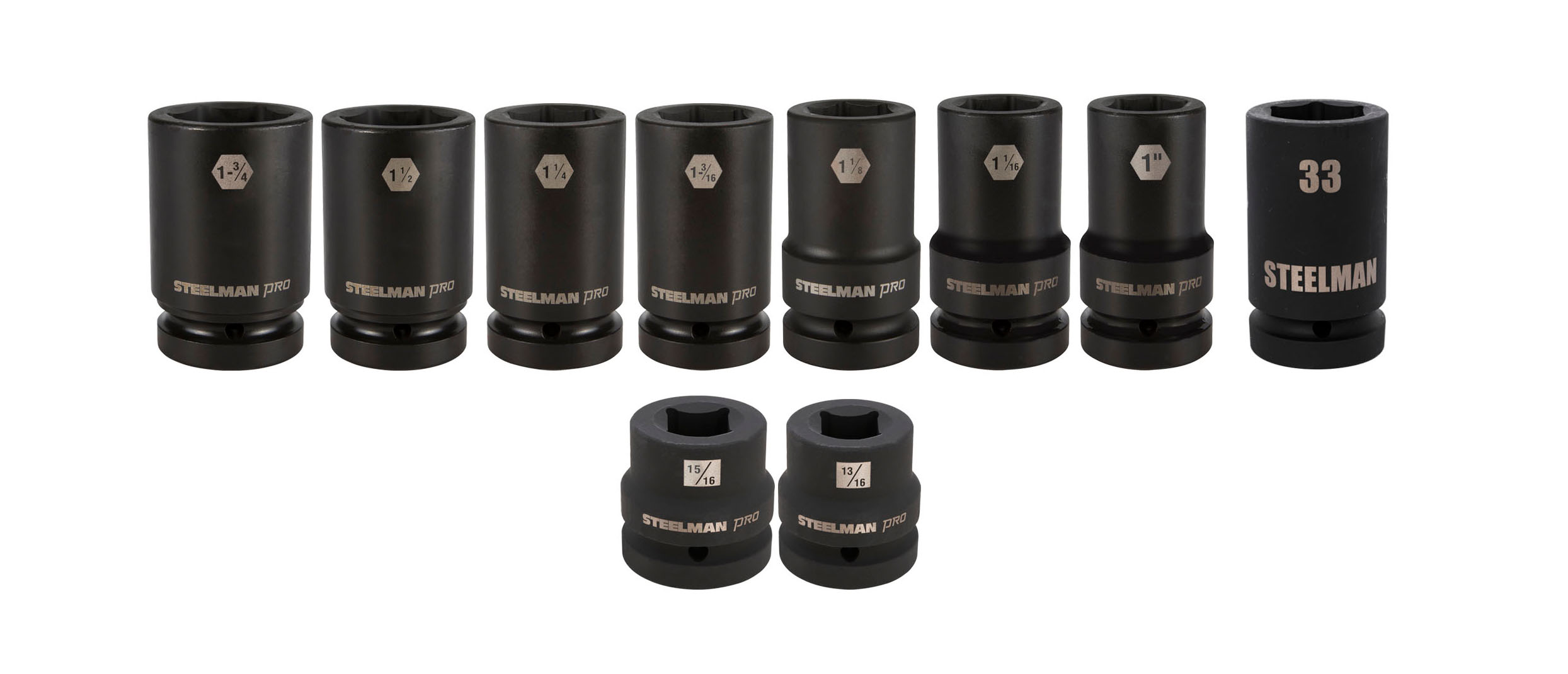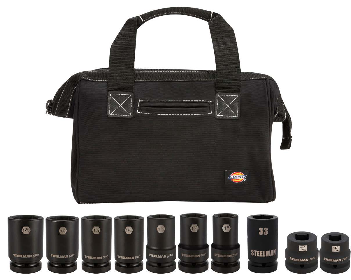 Every mechanic knows that having a reliable set of tools can make your life easier when working on truck wheels in the workshop. The STEELMAN 61211 10-Piece 1-Inch Drive Truck Wheel Servicing Socket Set contains a wide variety of heavy-duty sockets used to work on and service wheels on large trucks and tractor trailers. Set includes the following standard (SAE) and metric sizes 13/16-inch & 15/16-inch square Budd sockets, 1-inch, 1-1/16-inch, 1-1/8-inch deep, 1-3/16-inch deep, 1-1/4-inch thin wall deep, 1-1/2-inch, 1-3/4-inch thin wall deep, and 33mm deep sockets. Made from drop forged and heat treated chromoly steel, these sockets feature a ball detent recess on the 1-inch drive end to help them hold securely onto ratchets, air wrenches, adapters, and extensions. The 6-point design grips the sides of fasteners and not the corners, reducing wear and the chance of rounding the fastener. The sockets each feature a rust and corrosion resistant black phosphate protective coating with laser etched size callouts and markings. Rated to withstand up to 150% of ASME torque requirements for impact tools, these can handle tough use in any professional shop / garage or home workshop. When not in use the sockets can be stored in the included 12-inch Tool Bag.