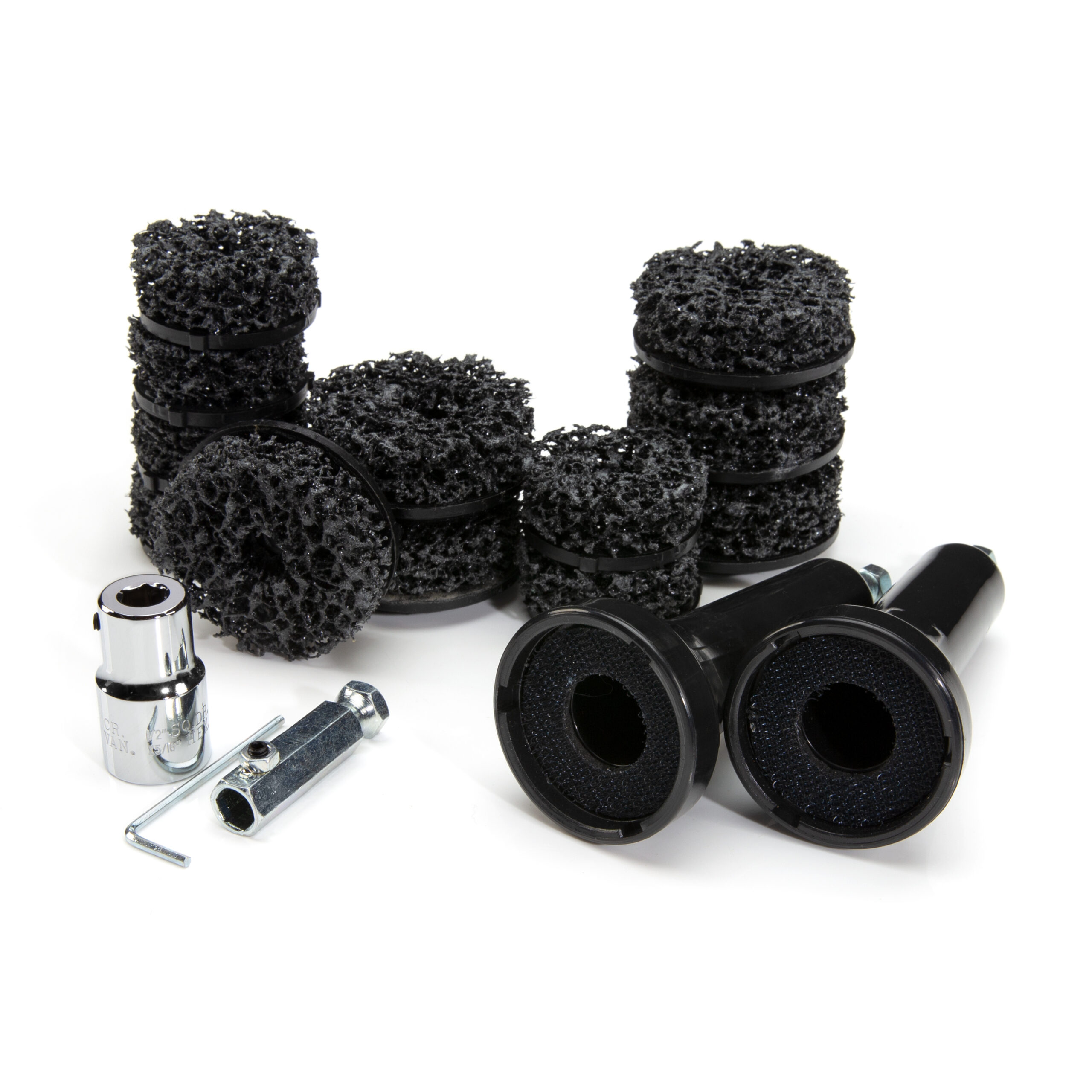 When rust is allowed to build up on hubs, rotors, and brake drums it can cause wobbling due to improper alignment which results in rotor runout and rusted lug nuts can lead to improperly secured tires that check as torqued but are still loose on the wheel. Save yourself money and prevent costly repairs and replacements with the STEELMAN 99905 Wheel Hub and Rotor Polishing Kit. This handy kit includes both a smaller 1.5-inch and a larger 2-inch diameter adapter and corresponding cleaning pads to service virtually all passenger cars, light trucks, and SUVs. The durable nylon web resurfacing pads scour away rust and built-up road grime without damaging rotors, hub assemblies, and brake components like a wire brush or wheel and without the hazards of chemical cleaners. With their built-in 1/4-inch hex drives the adapters easily fit drills with either 3/8 or 1/2-inch chucks. The kit also includes a 3/8-inch adapter to fit the 3/8-inch drive chucks on most low speed tire buffers and a 1/2-inch drive adapter to fit onto 1/2-inch drive impact wrenches.