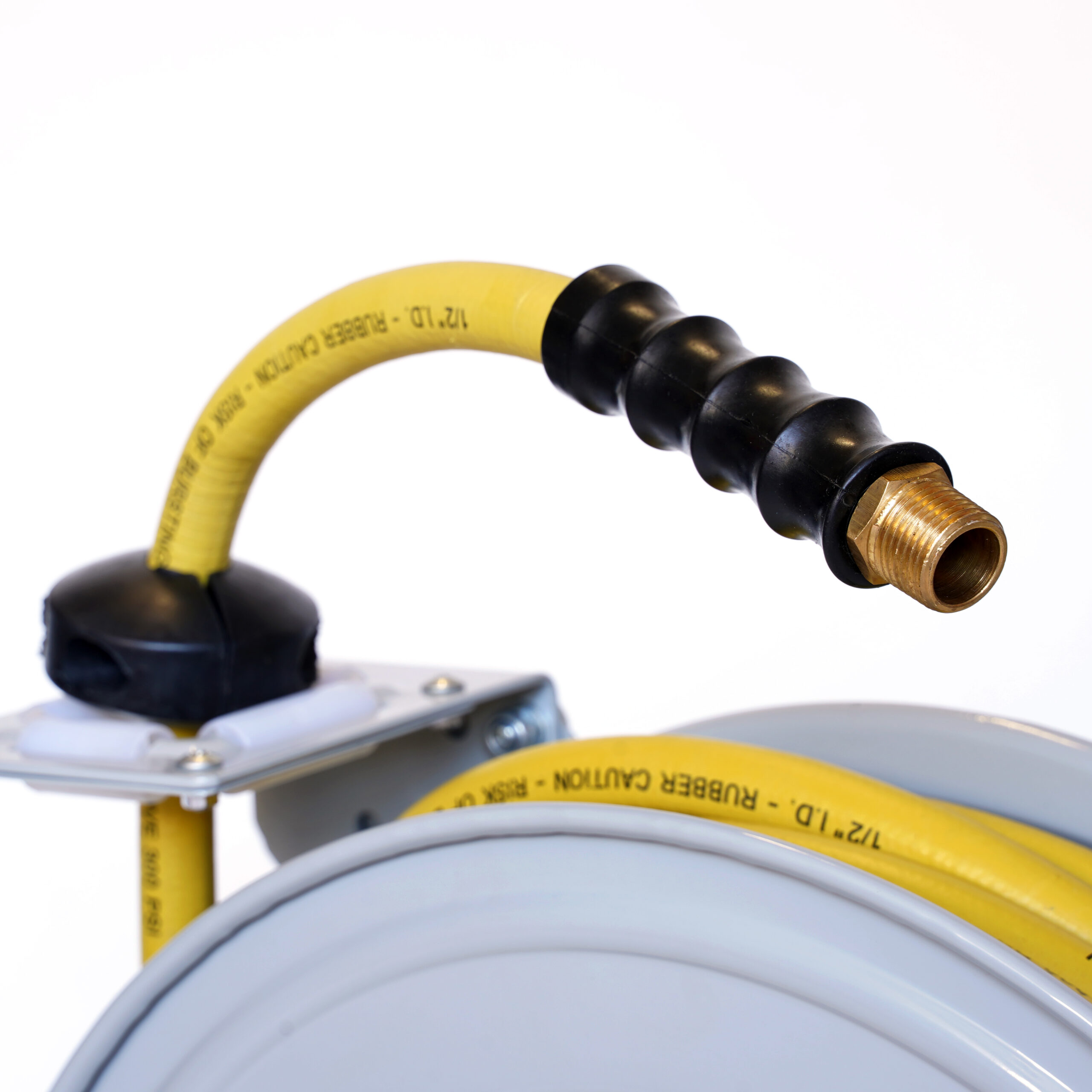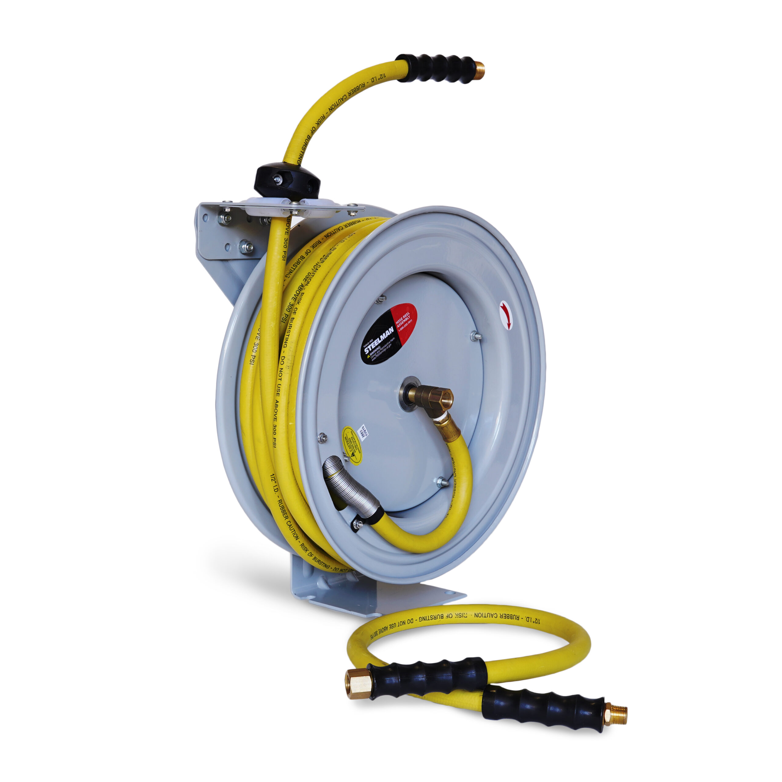 Deliver compressed air or water to where you need it in your garage, workshop, greenhouse, garden or other work area with the STEELMAN 96840-IND Enclosed Spring Water / Pneumatic Hose Reel with 50-Foot 1/2-Inch ID Hose. This heavy-duty, single arm reel is made of powder-coated steel that has flanged edges and stiffening ribs that prevent damage when retracting and provide increased reel strength without adding extra weight making it easier to find mounting locations. The enclosed drive spring helps eliminate possible damage due to reverse winding and foul-ups from dirt and grime and has a multi-position ratchet lock and easy spring tension adjustment to customize automatic retraction speed. A non-snag, four-directional roller guide reduces hose damage due to abrasion from constant winding and unwinding of the hose. The 50-foot long, 1/2-inch ID hose is made from durable, abrasion resistant rubber that can handle working pressures of up to 300 PSI. A thick rubber hose stop is included to prevent full hose retraction and to customize the amount of hose lead when retracted for easy access.