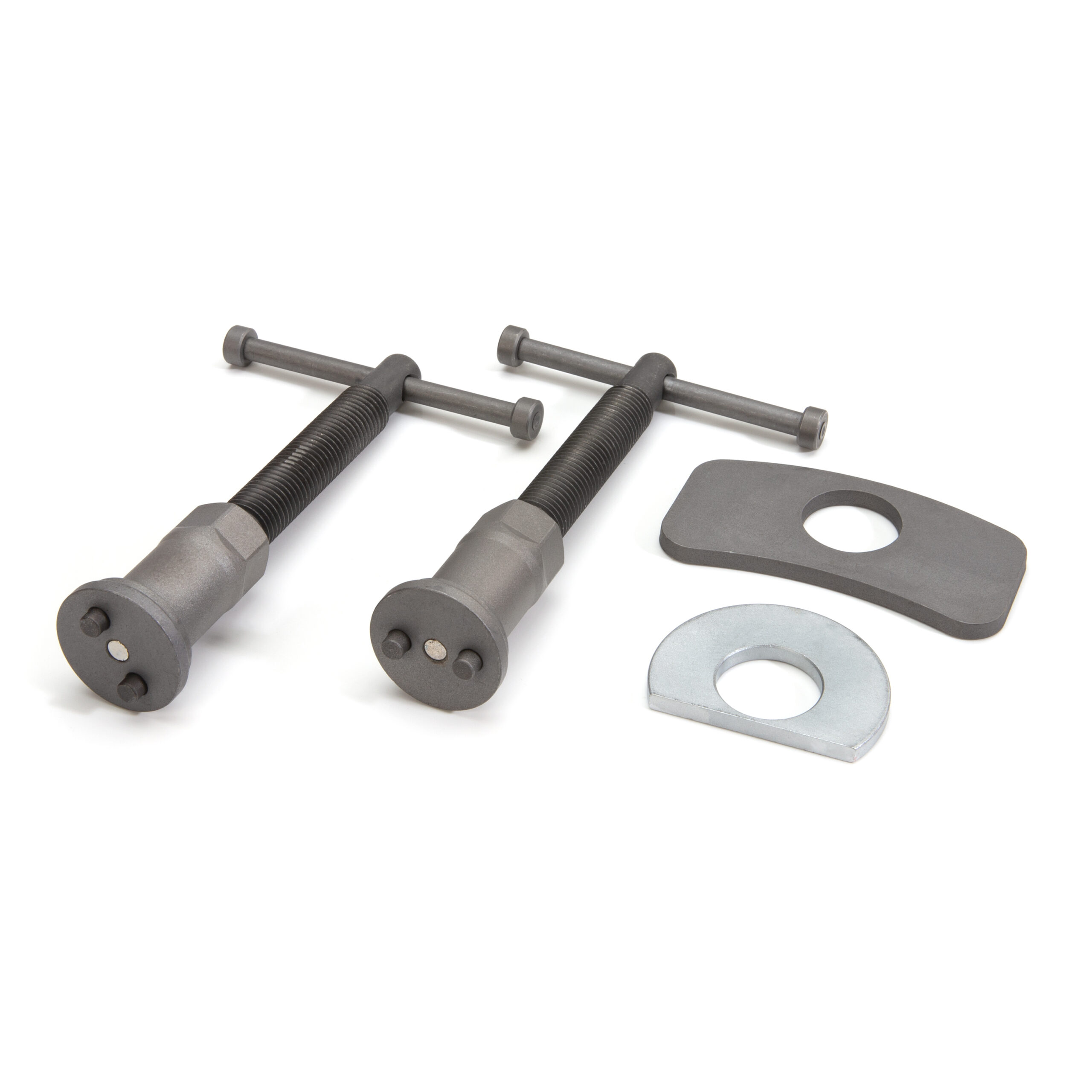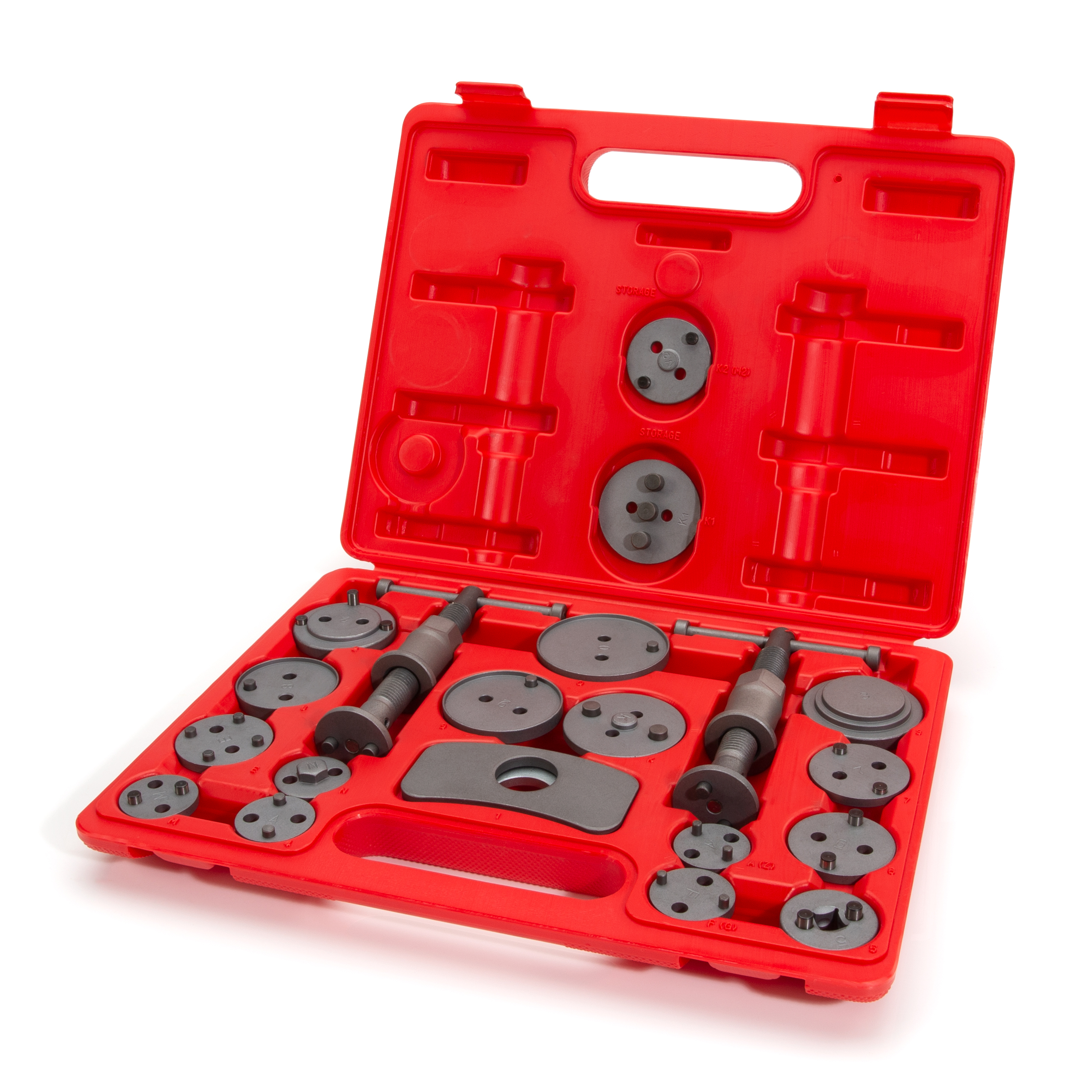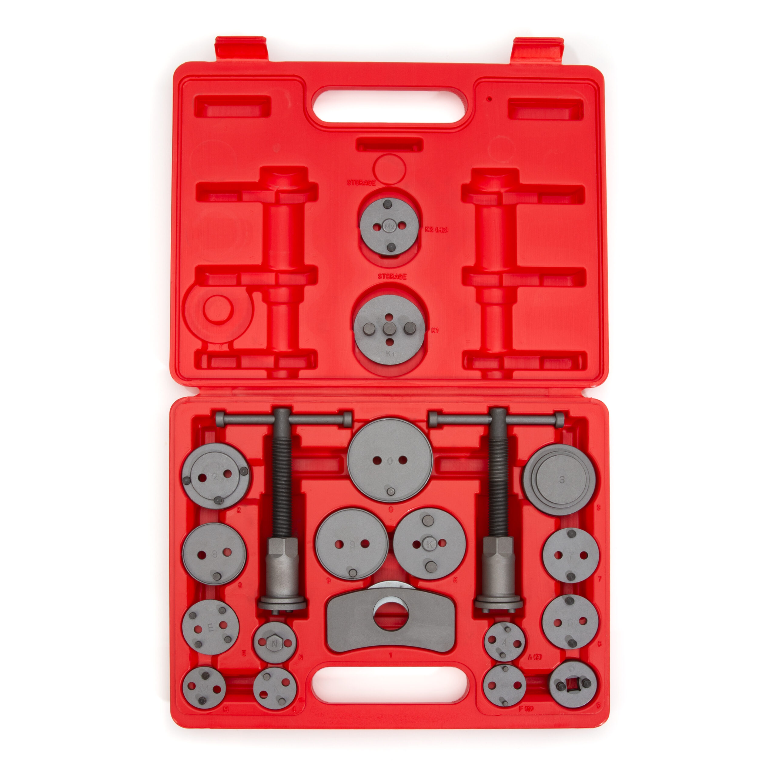 Easily reset right and left-hand threaded brake calipers with the STEELMAN 61050 21-Piece Universal Heavy Duty Brake Caliper Compressor and Wind Back Tool Set. This handy tool set is designed to work on a wide range of passenger vehicles and light trucks. The set includes two seperate wind tools, one threaded for traditional right-hand threaded calipers and one for left-hand threaded versions. A built-in magnet on the end of the each pressure screw / compressor assembly keeps the selected adapter securely in place so you can focus on turning the handle, not trying to hold the head in place. 17 different adapters are included in the set with short, long, single, double, triple, and quad pin versions along with a 3-step plate. Included adapters work on brake calipers used by Alfa Romeo, Audi, Chevrolet, Fiat, Ford, Honda, Hyundai, Jaguar, Mazda, Mitsubishi, Nissan, Renault, Toyota, Volvo, and Volkswagen (VW) vehicles. Each piece of the set is constructed of carbon steel for lasting durability to provide you with years of use across countless brake replacement jobs. When not in use, each piece stores securely in the included blow-molded plastic storage case.