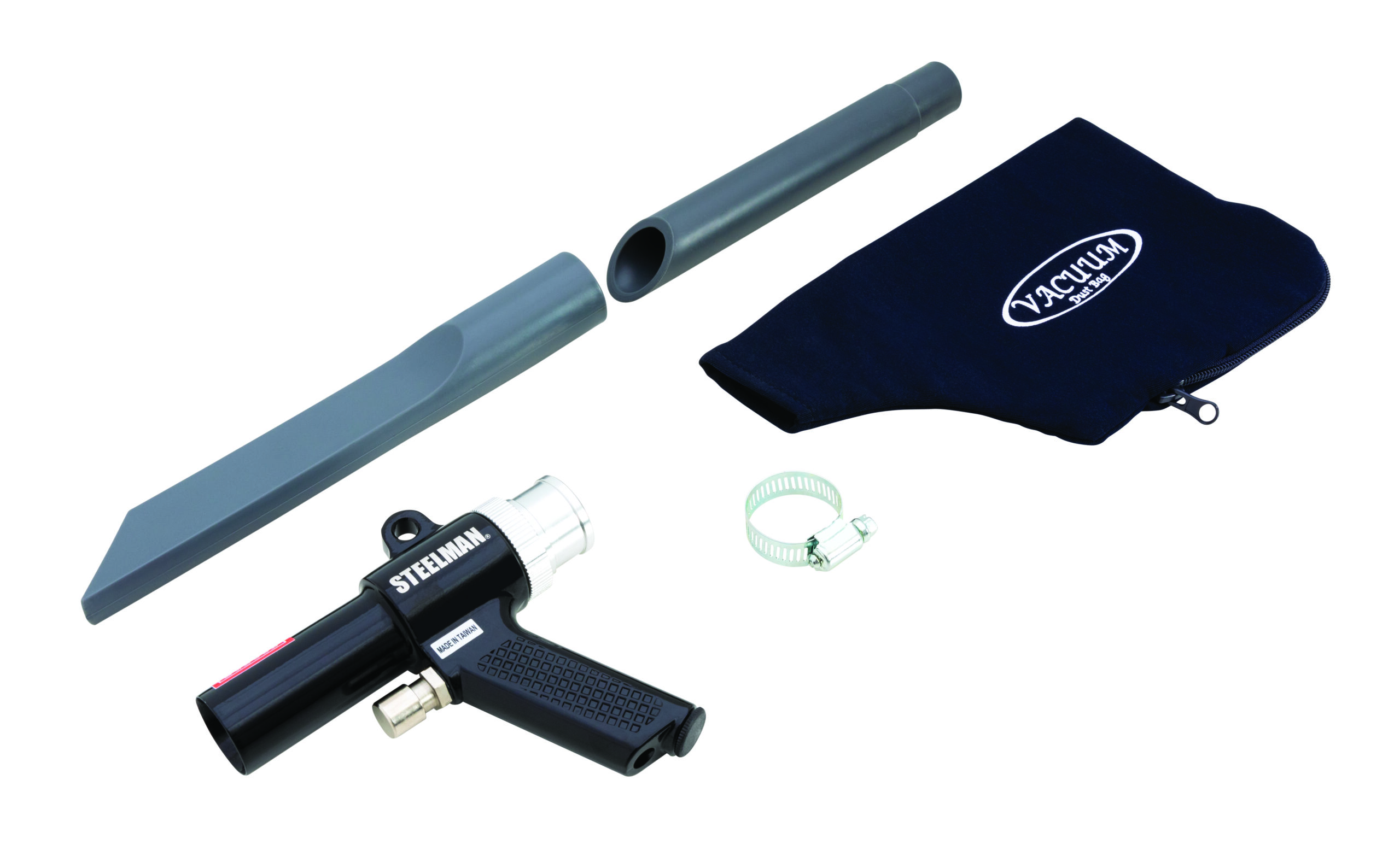 Quickly tackle workshop cleanup of fine powders, metal filings, wood shavings, glass shards, and more with the STEELMAN Pneumatic Workshop Vacuum Cleaner and Compressed Air Blower Kit. This compressed air powered cleaning tool is entirely spark free making it safe for use even when cleaning up absorbent materials used for fuel spills. Made with durable yet lightweight aluminum body this cleaning tool runs on shop supplied compressed air to provide powerful suction or, with the reversal of an internal valve, forceful blasts of air to either vacuum up or blow away dirt and debris and dry up liquids. The included fabric particulate collection bag is held tight to the tool with a worm screw clamp and has a zippered opening along one side to make emptying quick and simple. A convenient hanging loop is located on the top of the tool and provides an easy means of storing the tool from a peg or suspending it from a ceiling for easy access. The extension and flat nozzle attachments focus suction and help reach into tight areas for easier cleaning. Tool handle is threaded to accept standard 1/4-inch NPT quick connect fittings to easily connect tool to existing garage or work shop compressed air lines.