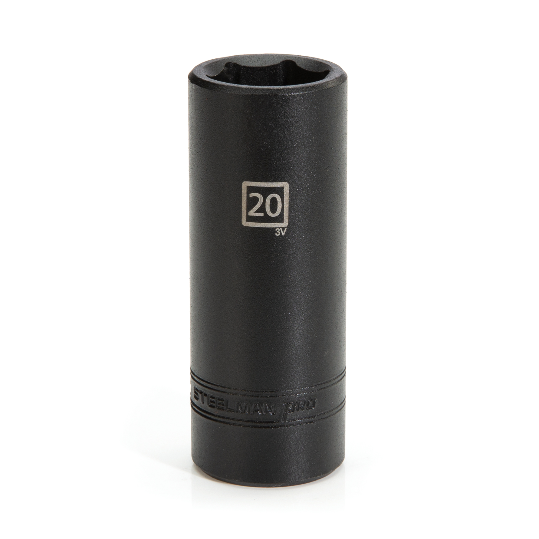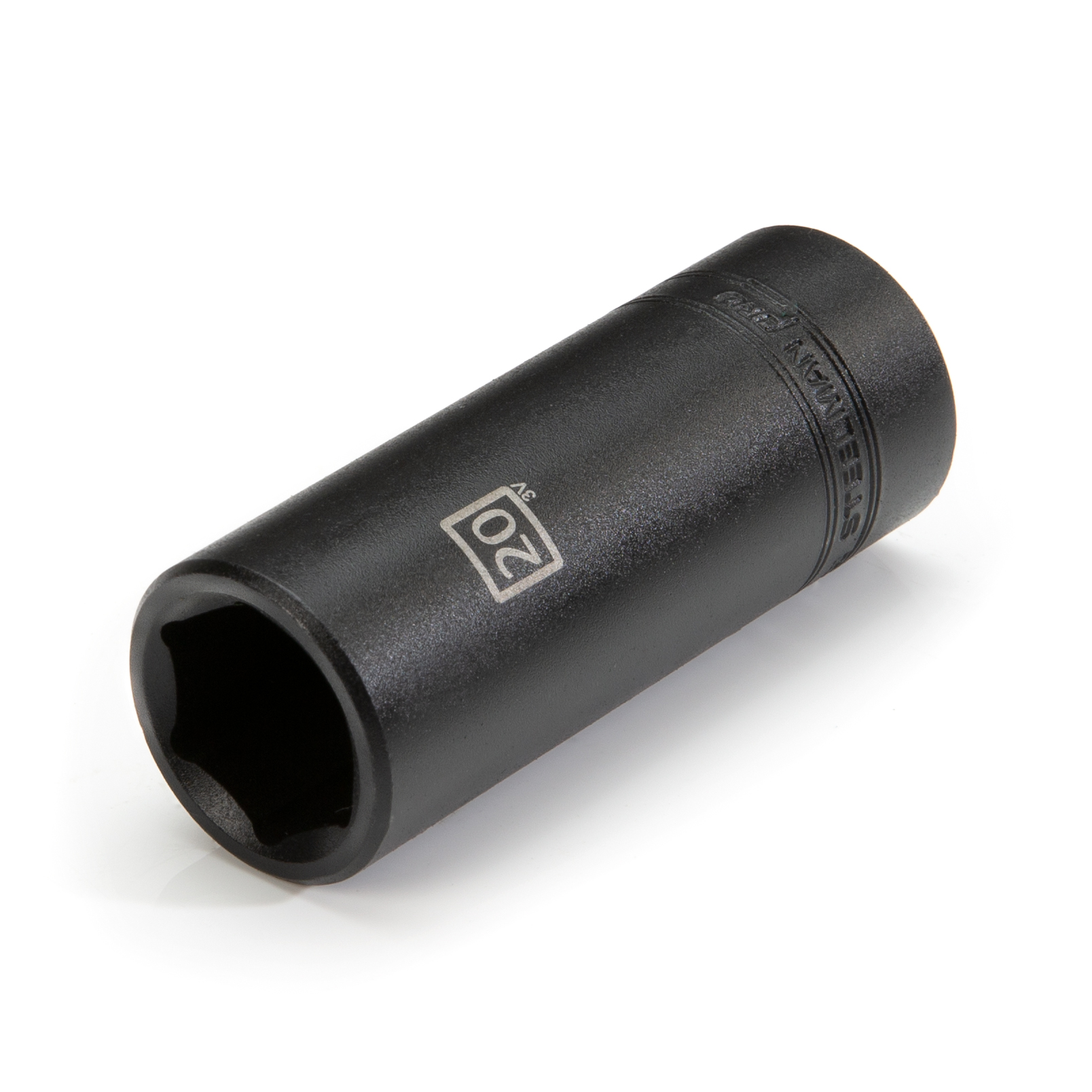 Having reliable and dependable tools can make any mechanic’s or maintenance engineer’s life easier, so be sure to find a home in your tool box for the STEELMAN PRO 78290 1/2-Inch Drive x 20mm Deep 6-Point Impact Metric Socket. Constructed of durable and heavy-duty chrome vanadium steel, this socket has the strength required for high torque jobs and will fit onto any 1/2-inch drive electric or pneumatic impact wrench, ratchet, torque wrench, extension bar, or adapter. This socket features a rust and corrosion resistant black oxide protective finish and its deep well design allows it to access fasteners in slight recesses without an extension bar as well as nuts on extended bolts. The socket’s 6-point design grips the sides of fasteners and not the corners, reducing wear and the chance of slippage or rounding the fastener. A ball detent recess on the base of the socket holds it securely to attached tools to allow for use at any angle. Easy to read size markings are laser etched onto the steel making it simple to identify the socket without the worry that the markings will wear away or rub off with use. Rated to meet or exceed ANSI / ASME performance requirements for hand tools, these can handle tough use in any professional or home shop / garage.