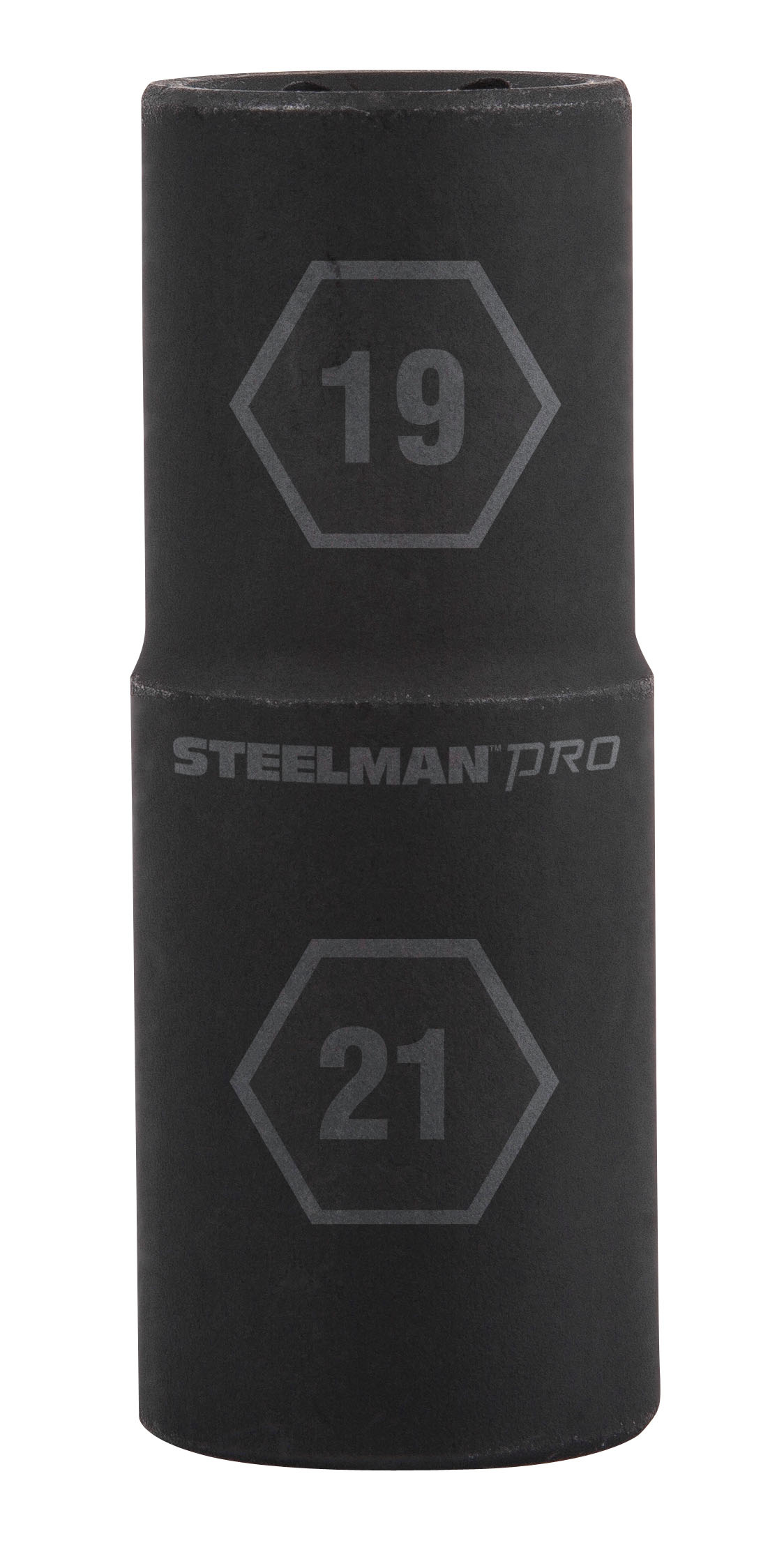 The STEELMAN 60229 1/2-Inch Drive 19mm x 21mm Impact Flip Socket was designed to save you time by maximizing efficiency. This dual-ended, 6-point metric impact grade flip socket allows you to work on both 19mm and 21mm lug nuts and fasteners without having to constantly switch sockets. Made of durable and hardened chromoly steel which is then given a black phosphate protective coating, this socket is designed to meet or exceed 150% proof of torque under ASME tool performance testing standards. Fitting easily over an impact extension or onto an impact wrench’s extended anvil, this socket’s recessed edges provide the most accurate fit possible, gripping fasteners by the sides and not the edges which results in reduced slippage and rounding/fastener damage. Laser-etched size callouts make identification among other sockets easy. Whether you?re a professional mechanic at a repair or tire shop, or just love to work on your own cars and vehicles, this flip impact socket set is a must for working efficiently!