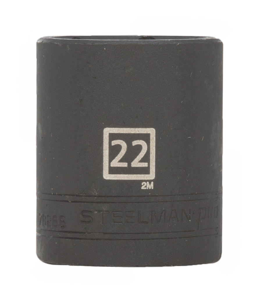 Having reliable and dependable tools can make any mechanic’s or maintenance engineer’s life easier, so be sure to find a home in your tool box for the STEELMAN PRO 78266 1/2-Inch Drive x 22mm 6-Point Impact Metric Socket. Constructed of durable and heavy-duty chrome vanadium steel, this socket has the strength required for high torque jobs and will fit onto any 1/2-inch drive electric or pneumatic impact wrench, ratchet, torque wrench, extension bar, or adapter. This shallow depth socket features a rust and corrosion resistant black oxide protective finish. The socket’s 6-point design grips the sides of fasteners and not the corners, reducing wear and the chance of slippage or rounding the fastener. A ball detent recess on the base of the socket holds it securely to attached tools to allow for use at any angle. Easy to read size markings are laser etched onto the steel making it simple to identify the socket without the worry that the markings will wear away or rub off with use. Rated to meet or exceed ANSI / ASME performance requirements for hand tools, these can handle tough use in any professional or home shop / garage.