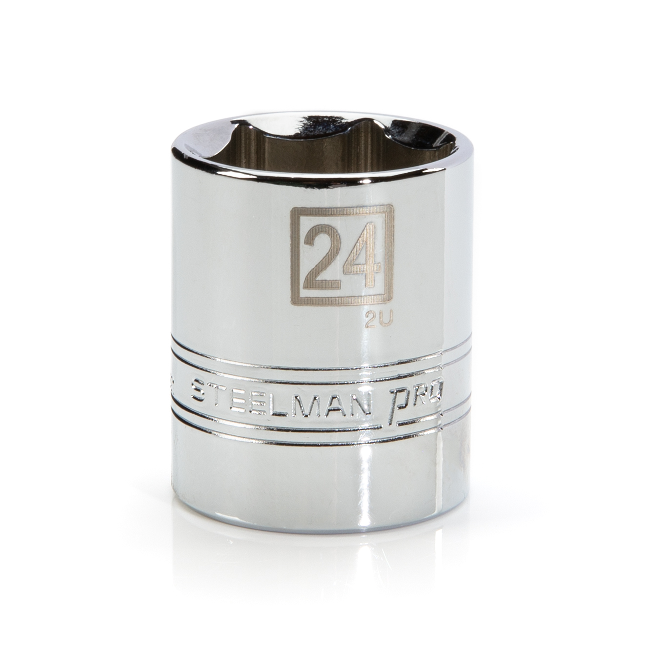 If you need a socket you can depend on, be sure to find a home in your tool box for the STEELMAN PRO 78321 1/2-Inch Drive x 24mm 6-Point Metric Socket. Constructed of heavy-duty heat-treated chrome vanadium steel, this shallow access socket has the strength required for high torque jobs and will fit onto any 1/2-inch drive ratchet, torque wrench, extension bar, or adapter. The socket features a rust and corrosion resistant high polish chrome finish that not only looks good but is easy to wipe clean of dirt, oil, and grime. The socket’s 6-point design grips the sides of fasteners and not the corners, reducing wear and the chance of slippage or rounding the fastener. Easy to read size markings are laser etched onto the steel making it simple to identify the socket you need without the worry that the markings will wear away or rub off with use. Rated to meet or exceed ANSI / ASME performance requirements for hand tools, this socket can handle tough use, whether it is in professional garage fixing car engines or at home repairing furniture and appliances.
