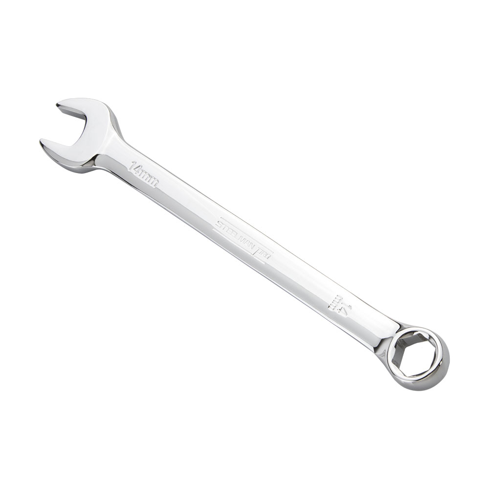Work with the same quality tools as service technicians with the STEELMAN PRO 78534 10-Piece Metric 6-Point Combination Wrench Set. Constructed of heat treated chrome vanadium steel alloy these tools are guaranteed to meet or exceed ASME and ANSI torque standards to give you the long lasting durability you require from your tools. Size callouts are stamped into the steel both vertically and horizontally on both sides of each wrench to make identification easy. A mirror-polish chrome plating covers each wrench providing rust and corrosion resistance that is easily wiped clean when soiled. Open ends on these combo wrenches are angled 15-degrees to provide increased leverage and easier access to fasteners in tight places. Similarly, the box end has a 15-degree offset to provide your fingers with that little bit of extra clearance that they need as you work. Set includes the following metric sizes: 7mm, 8mm, 9mm, 10mm, 11mm, 12mm, 13mm, 14mm, 15mm, and 16mm. When the job is done the wrenches can be stored in the included ABS plastic storage rack that can either lay flat inside a toolbox drawer or be hung on a wall using the folding carrying handle.